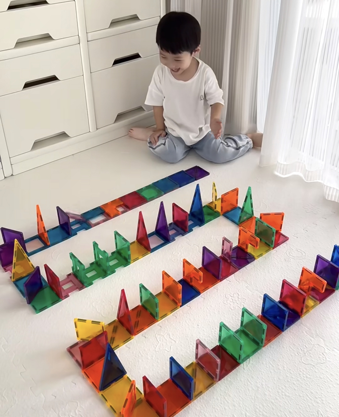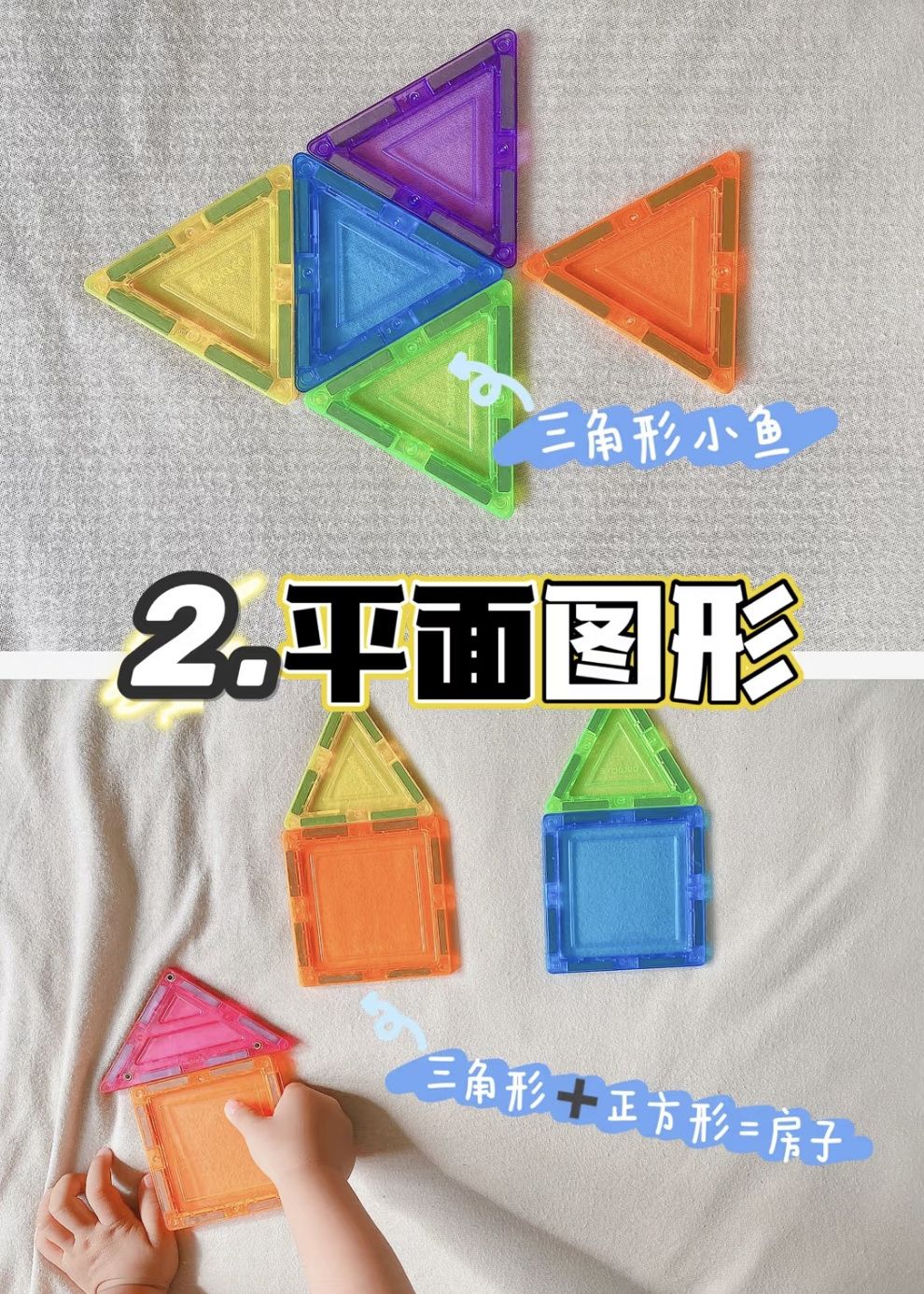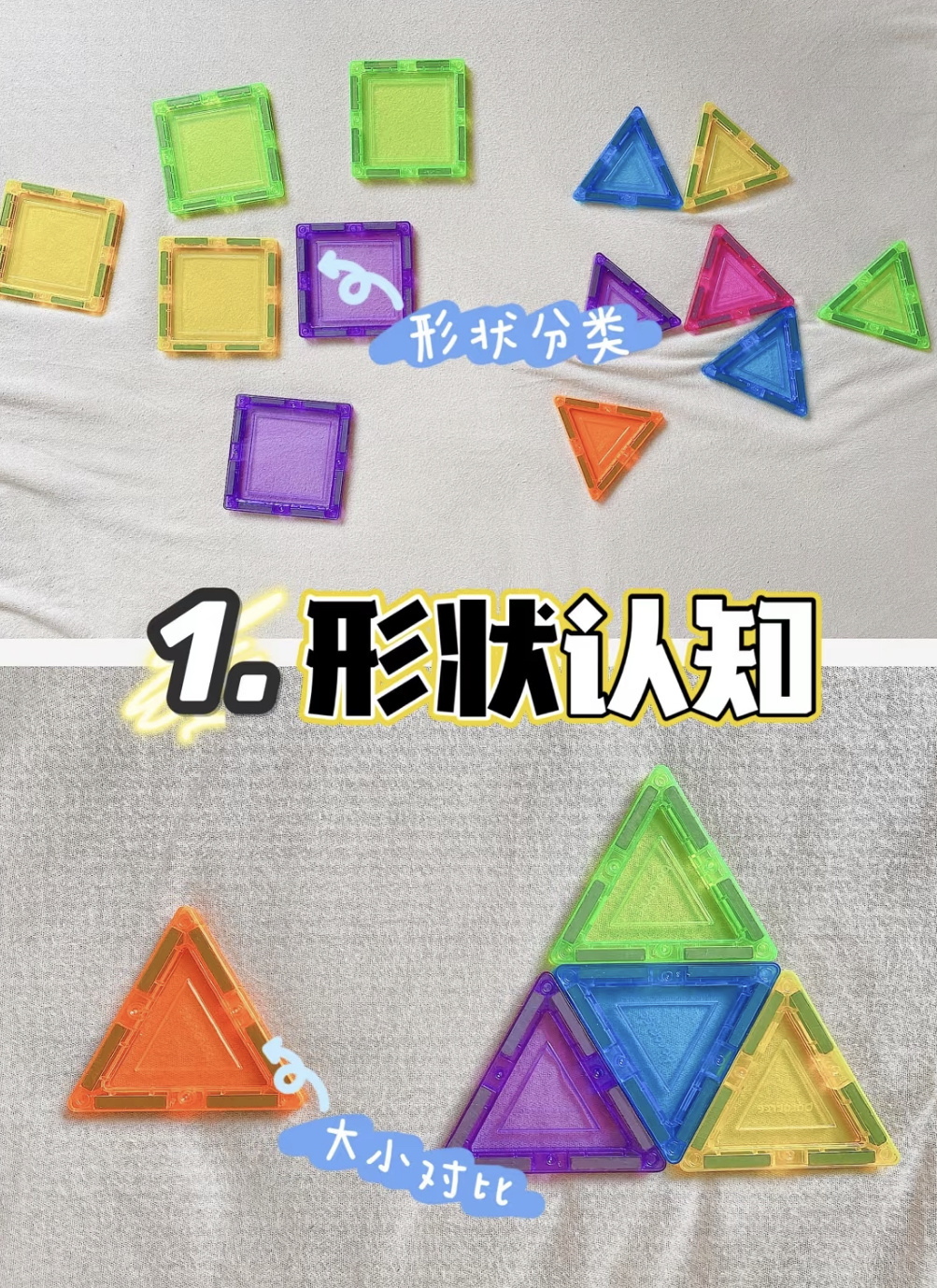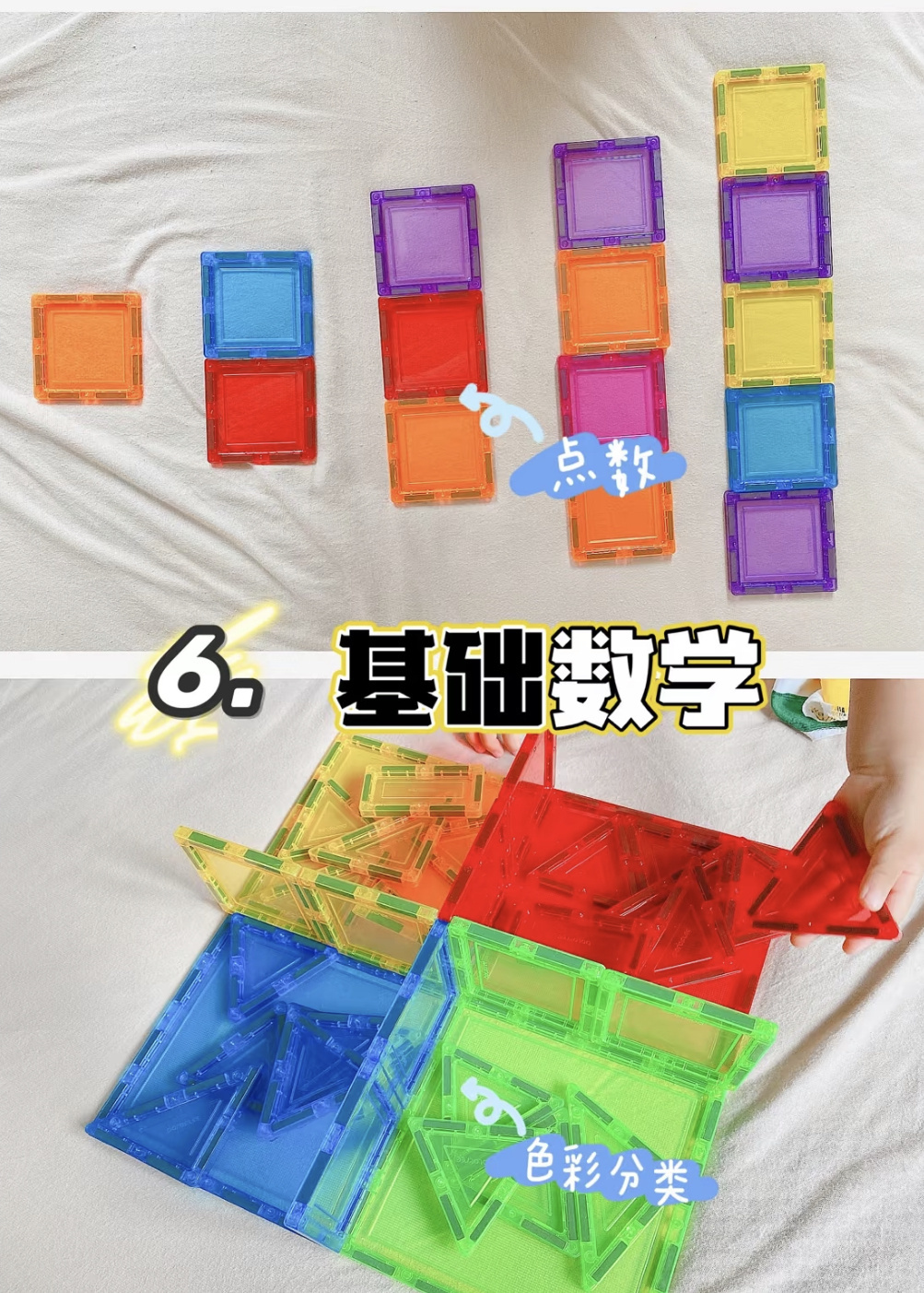 形状、颜色非常丰富,小朋友可以在家长的帮助下玩各种颜色或形状的分类游戏,在玩的过程中认知这些图形,学几何、拼英文单词就更容易啦!对低龄宝宝实在是再适合不过了,分类的过程中还能感受到磁力的神奇🐟