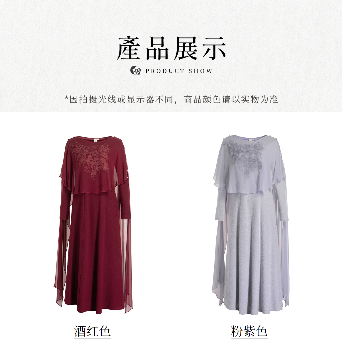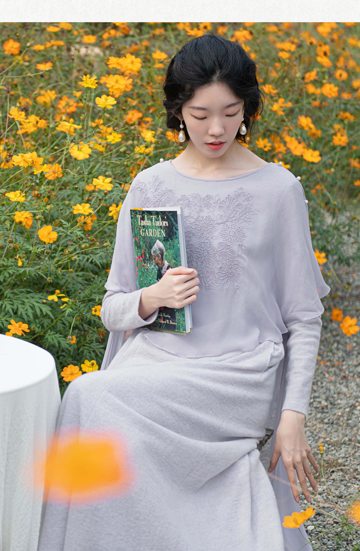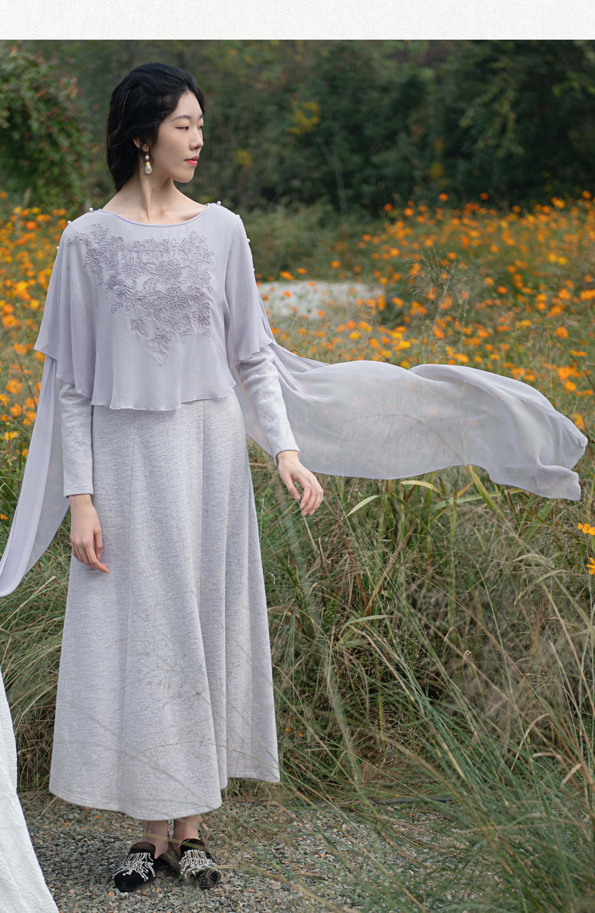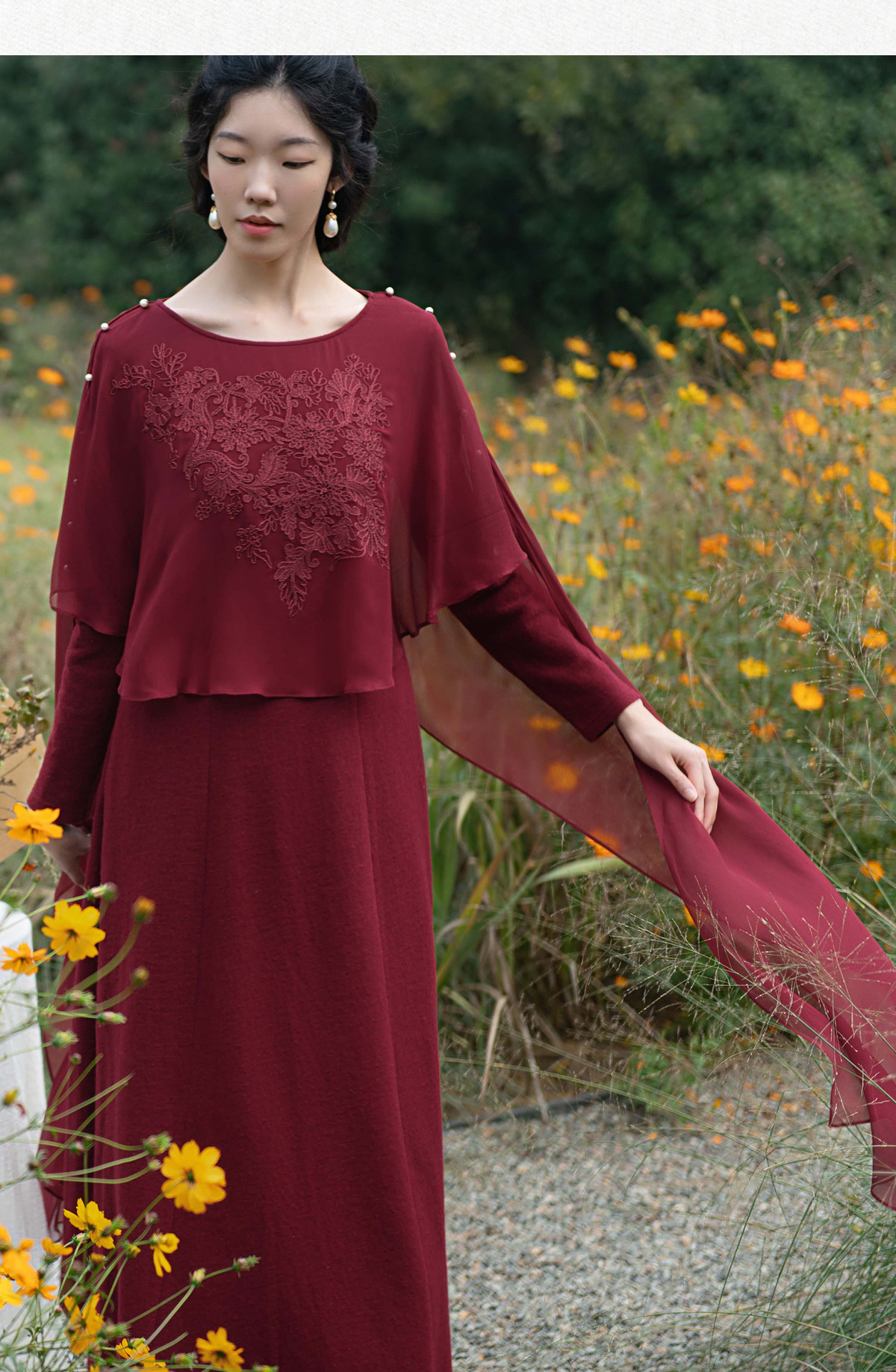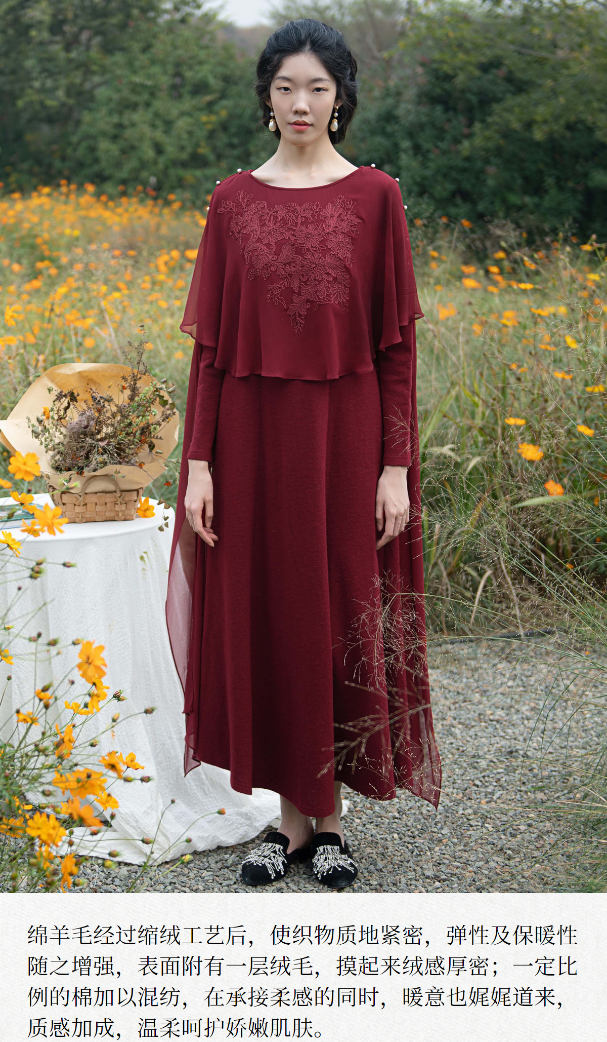 【林栖设计小店】绵羊毛混纺连衣裙绣花真丝披肩2023秋冬新品复古长裙女1934123