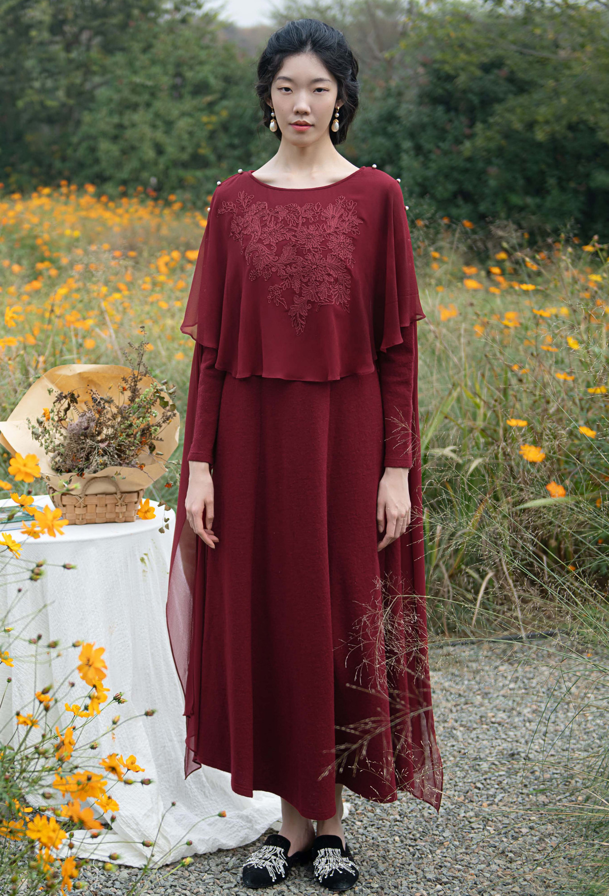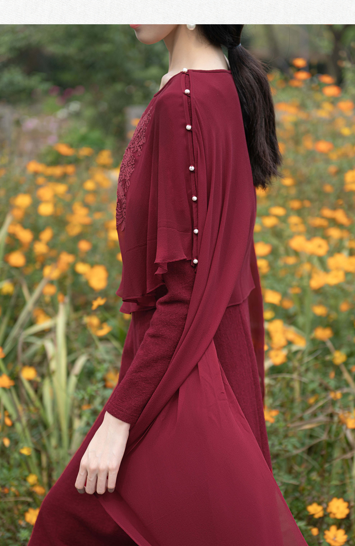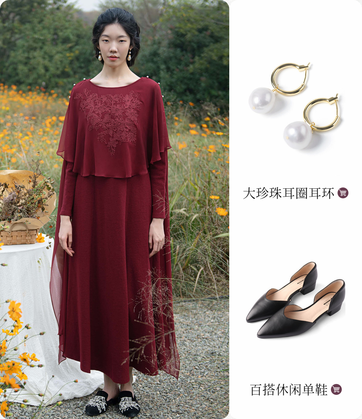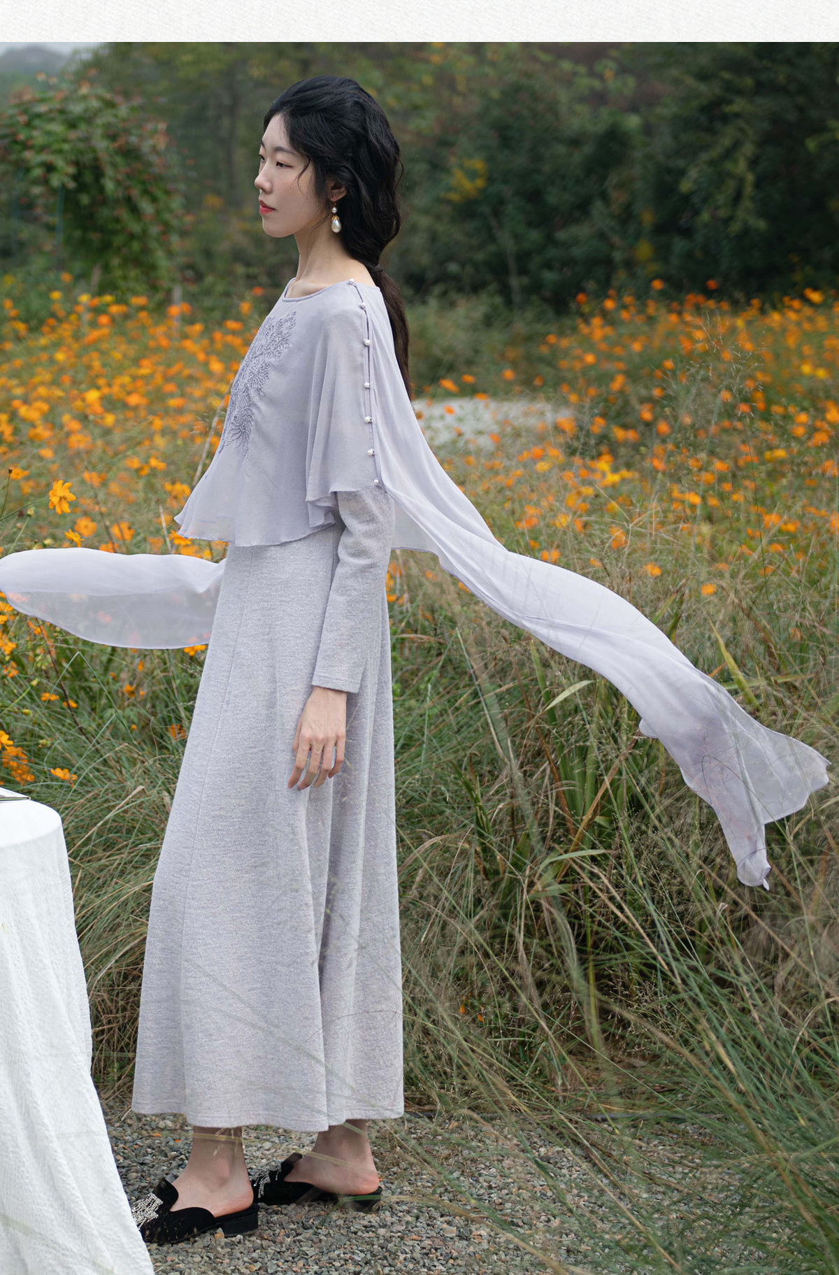 【林栖设计小店】绵羊毛混纺连衣裙绣花真丝披肩2023秋冬新品复古长裙女1934123