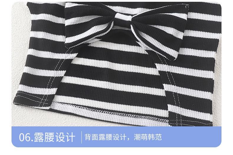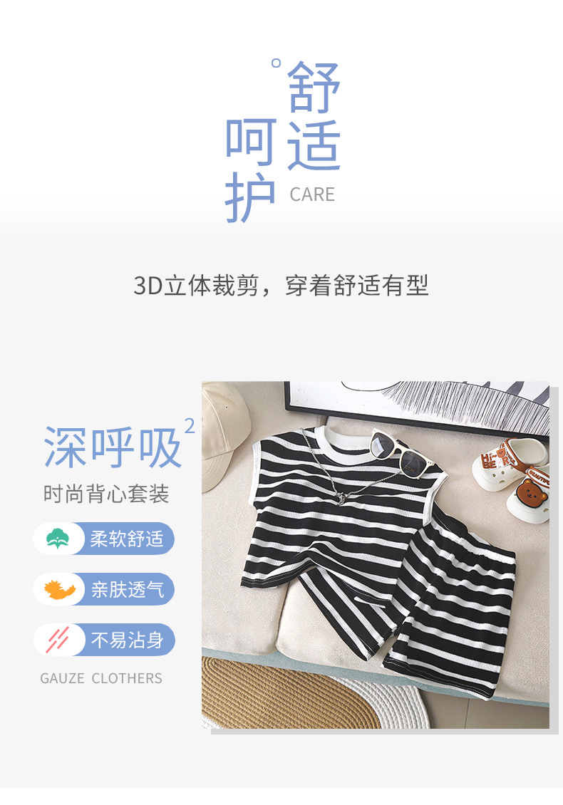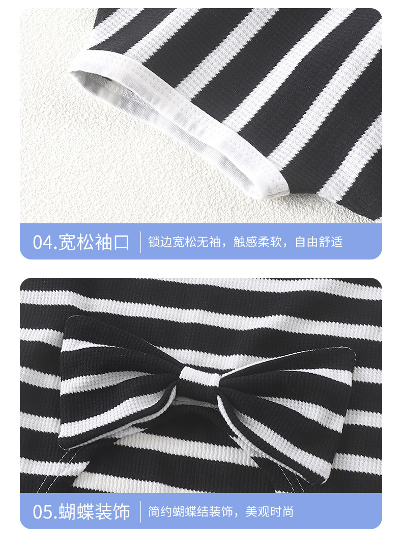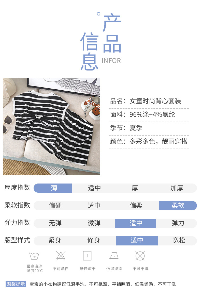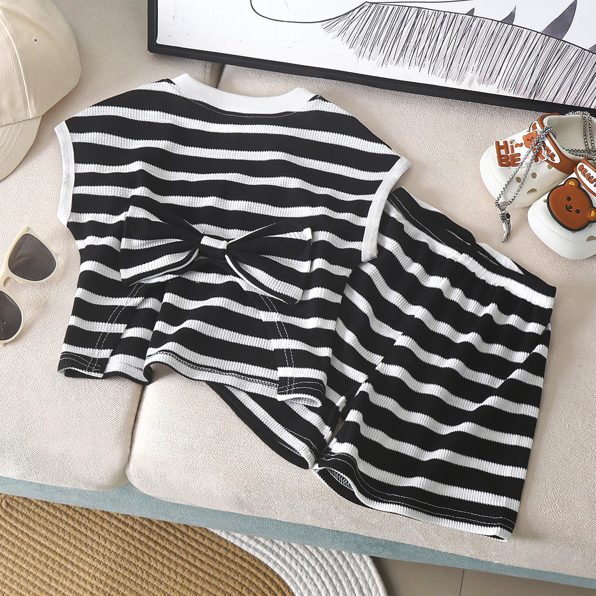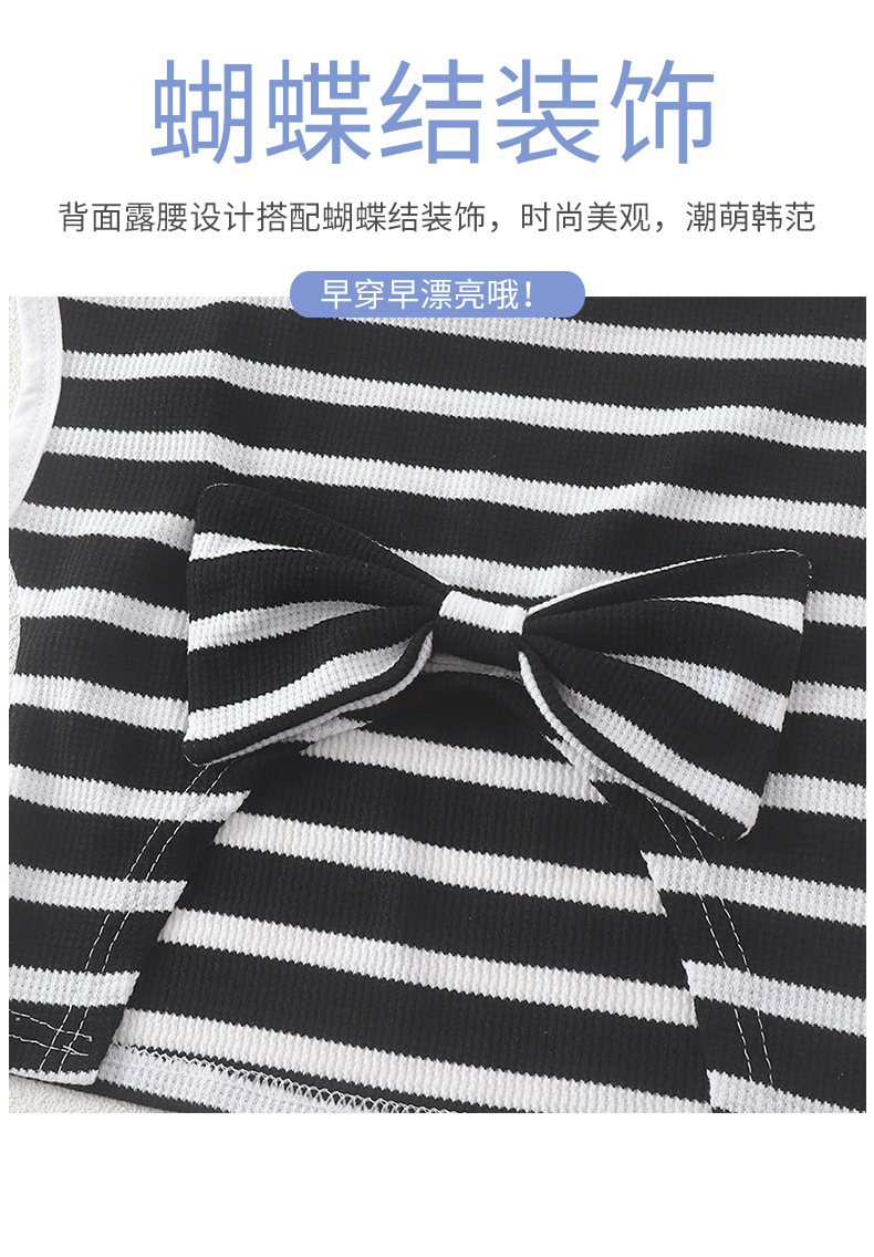 【轻薄透气!抗皱易打理】蝴蝶结短袖套装女童夏款新款洋气条纹无袖背心两件套夏时尚。xb