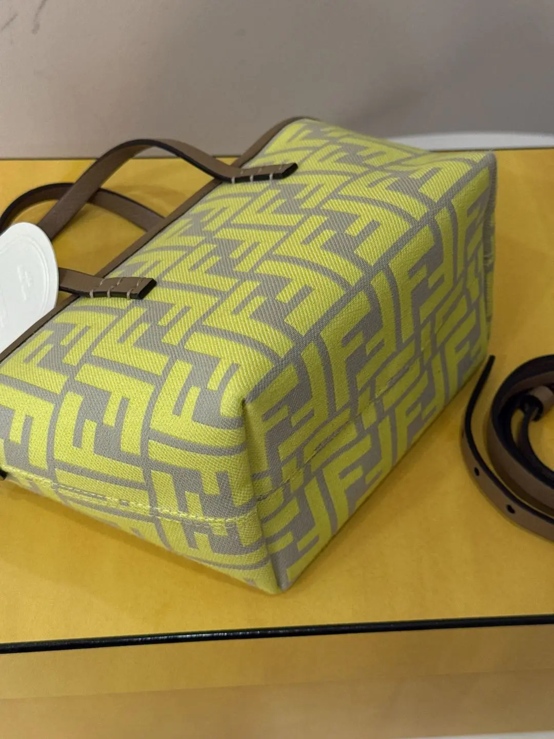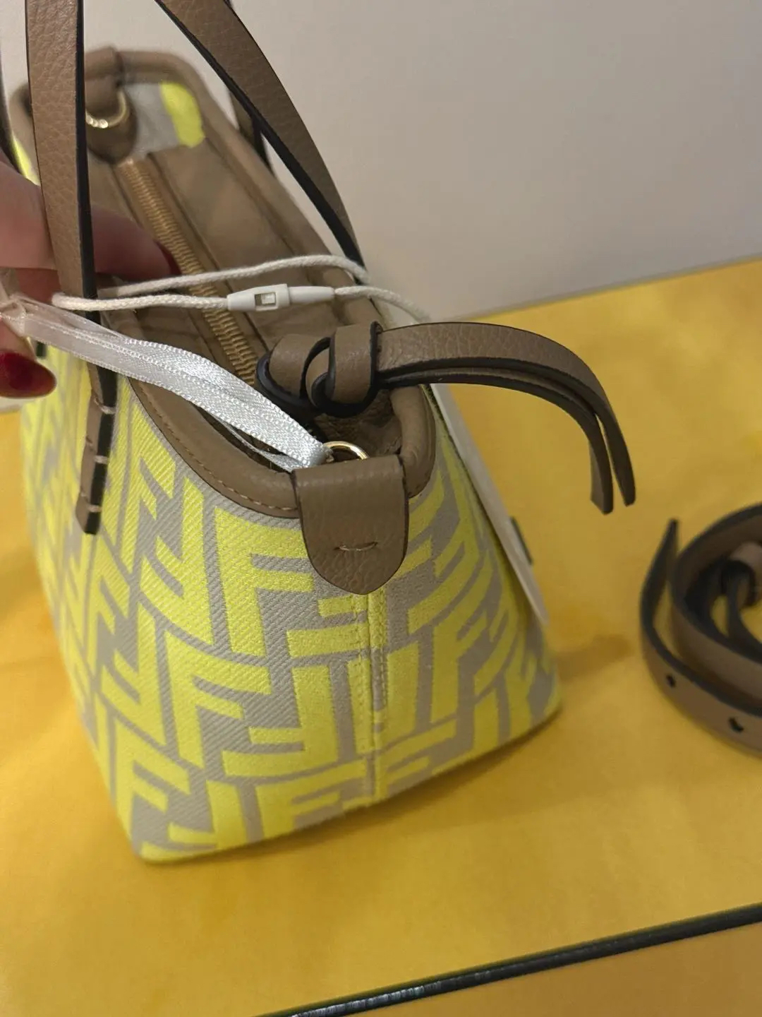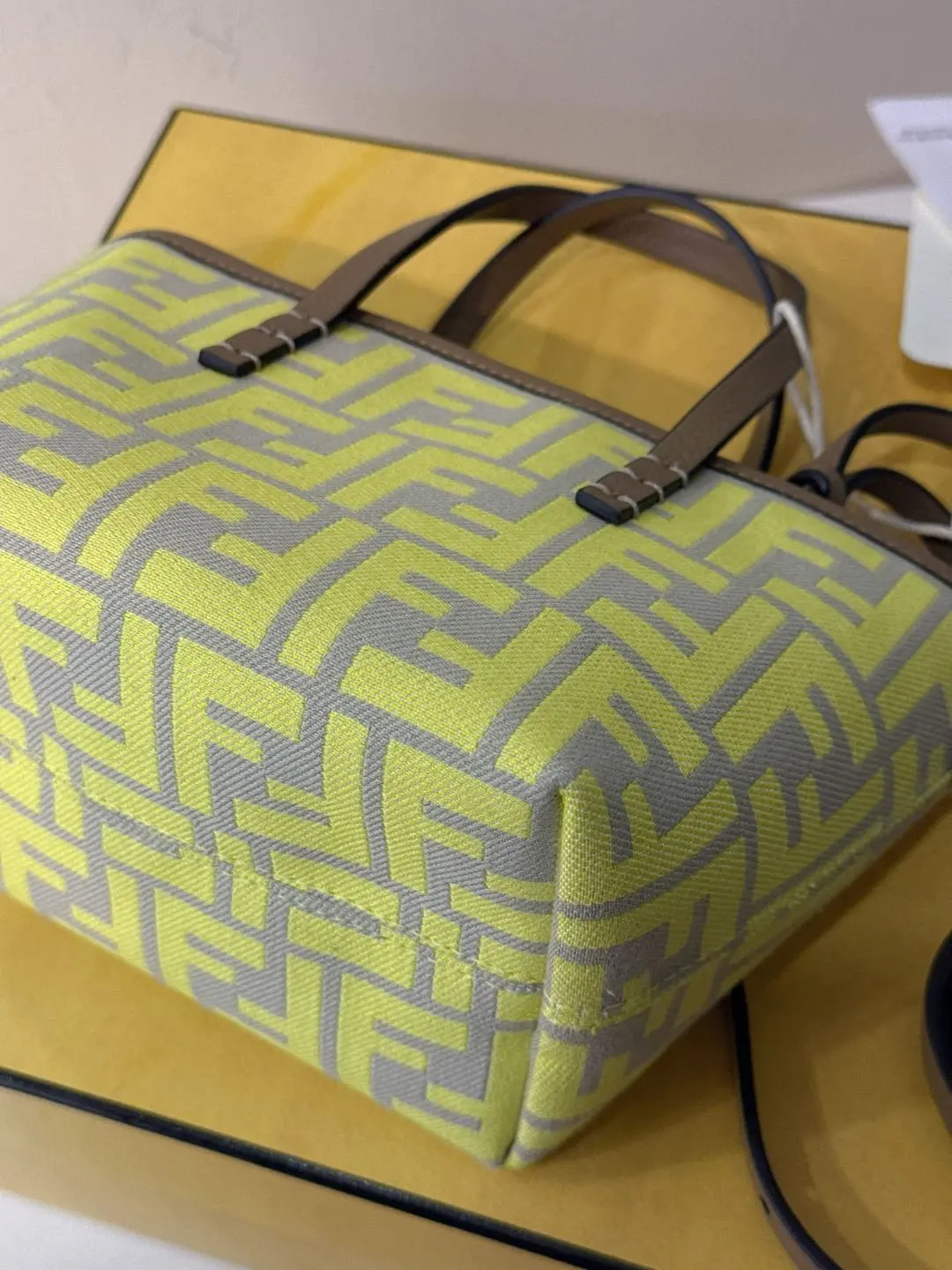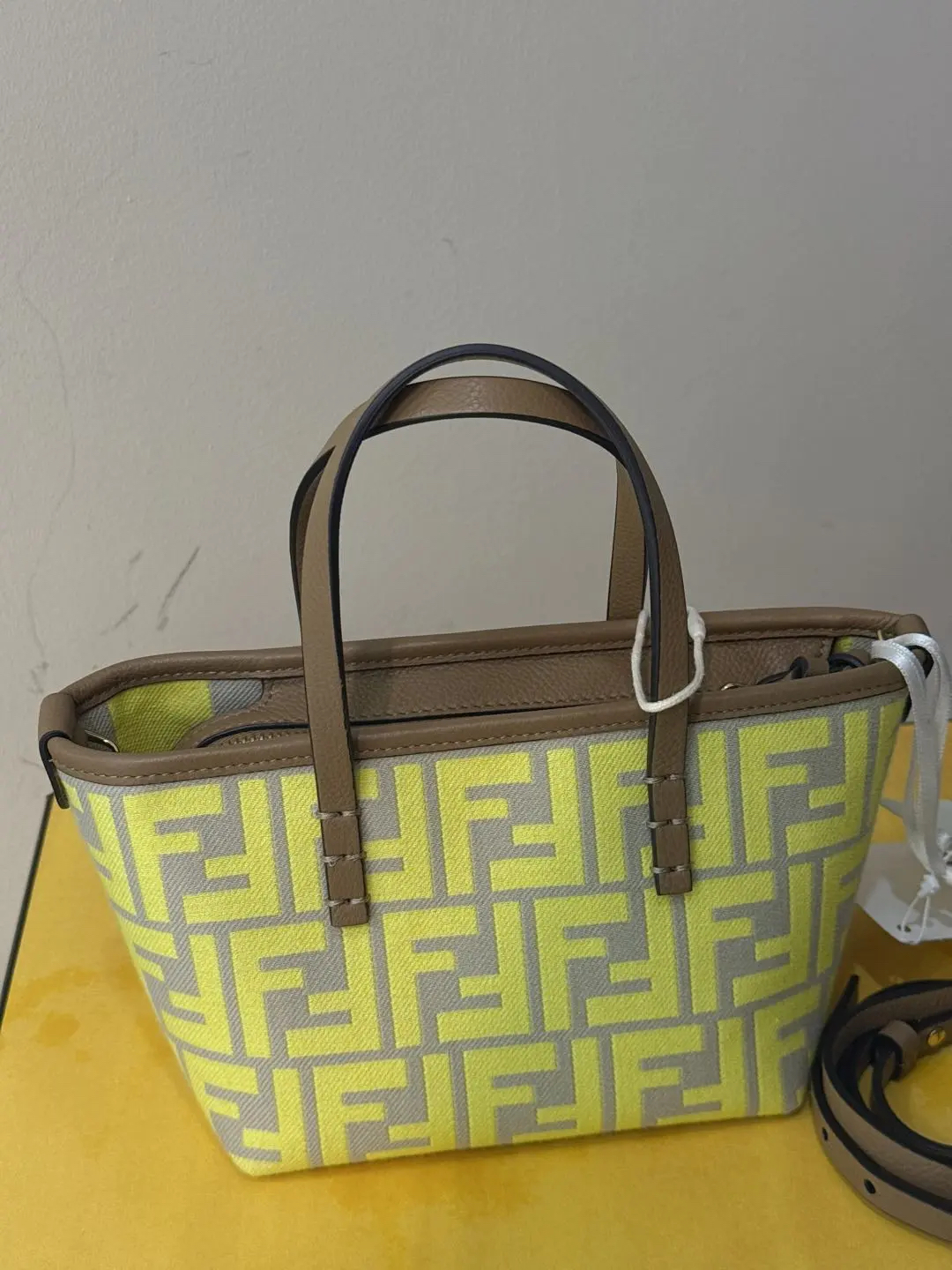【商品详情】正品二手 Fendi mini Roll tote 柠檬黄 老花拼皮 斜挎包👜99新 15x13 配件:肩带 吊牌 防尘袋 盒子。24年春夏新款
