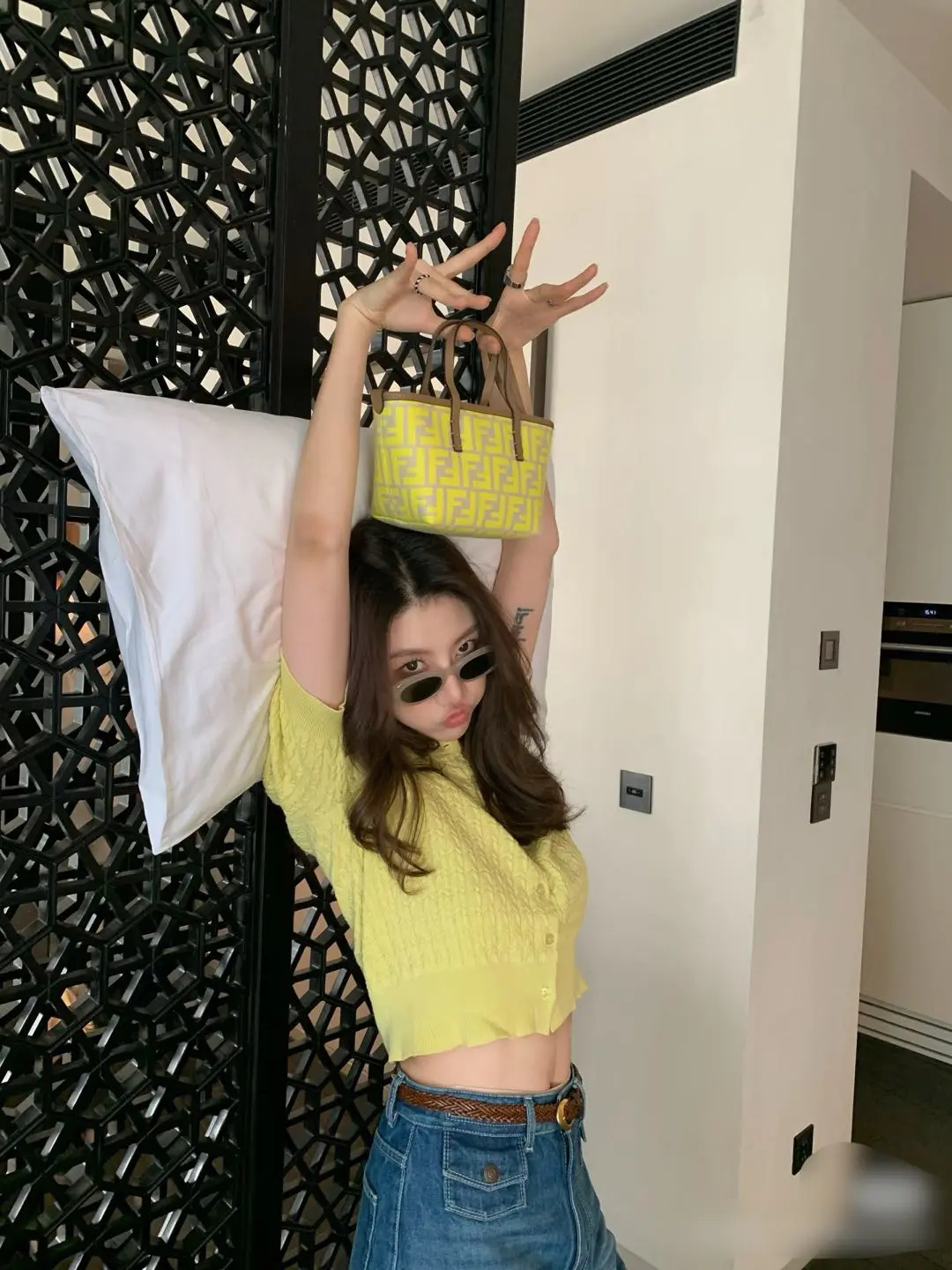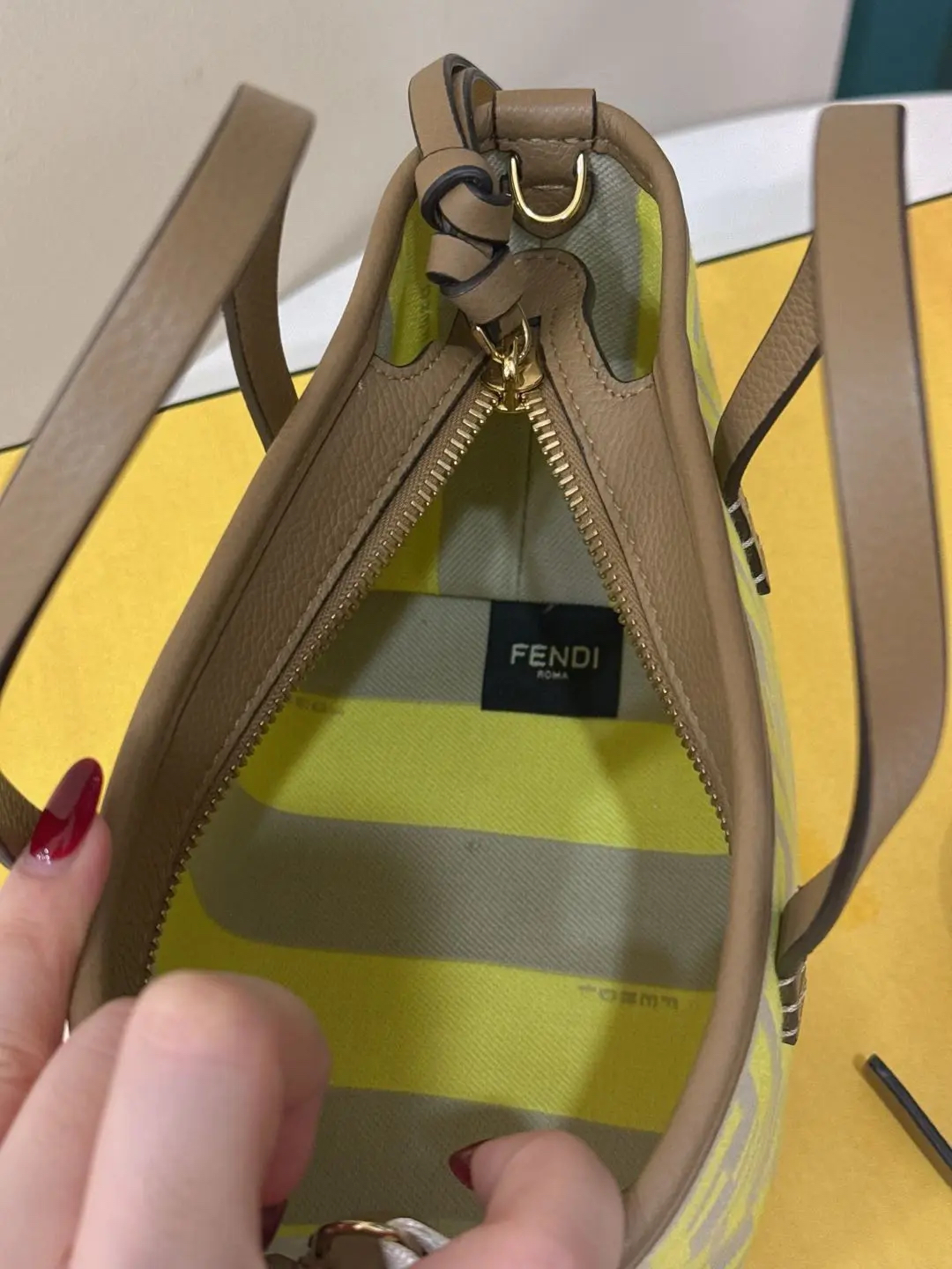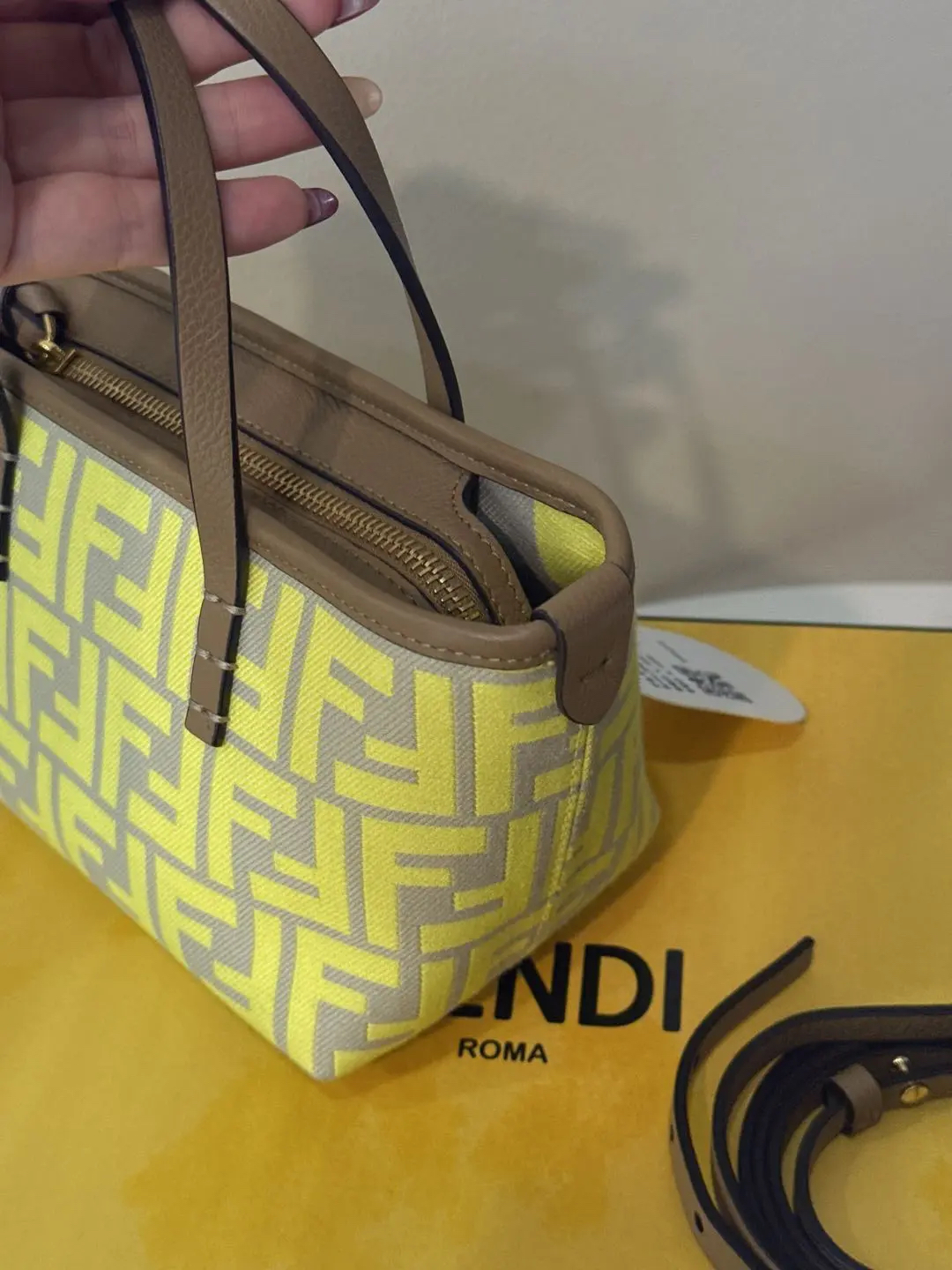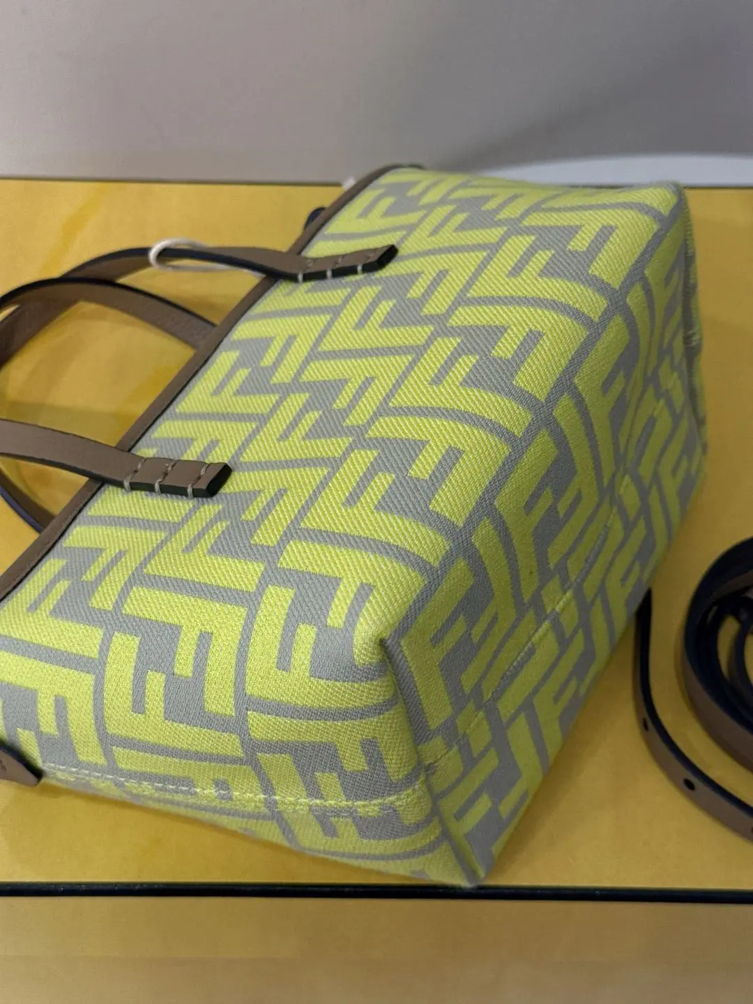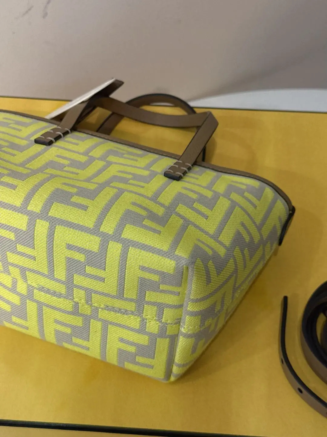 【商品详情】正品二手 Fendi mini Roll tote 柠檬黄 老花拼皮 斜挎包👜99新 15x13 配件:肩带 吊牌 防尘袋 盒子。24年春夏新款