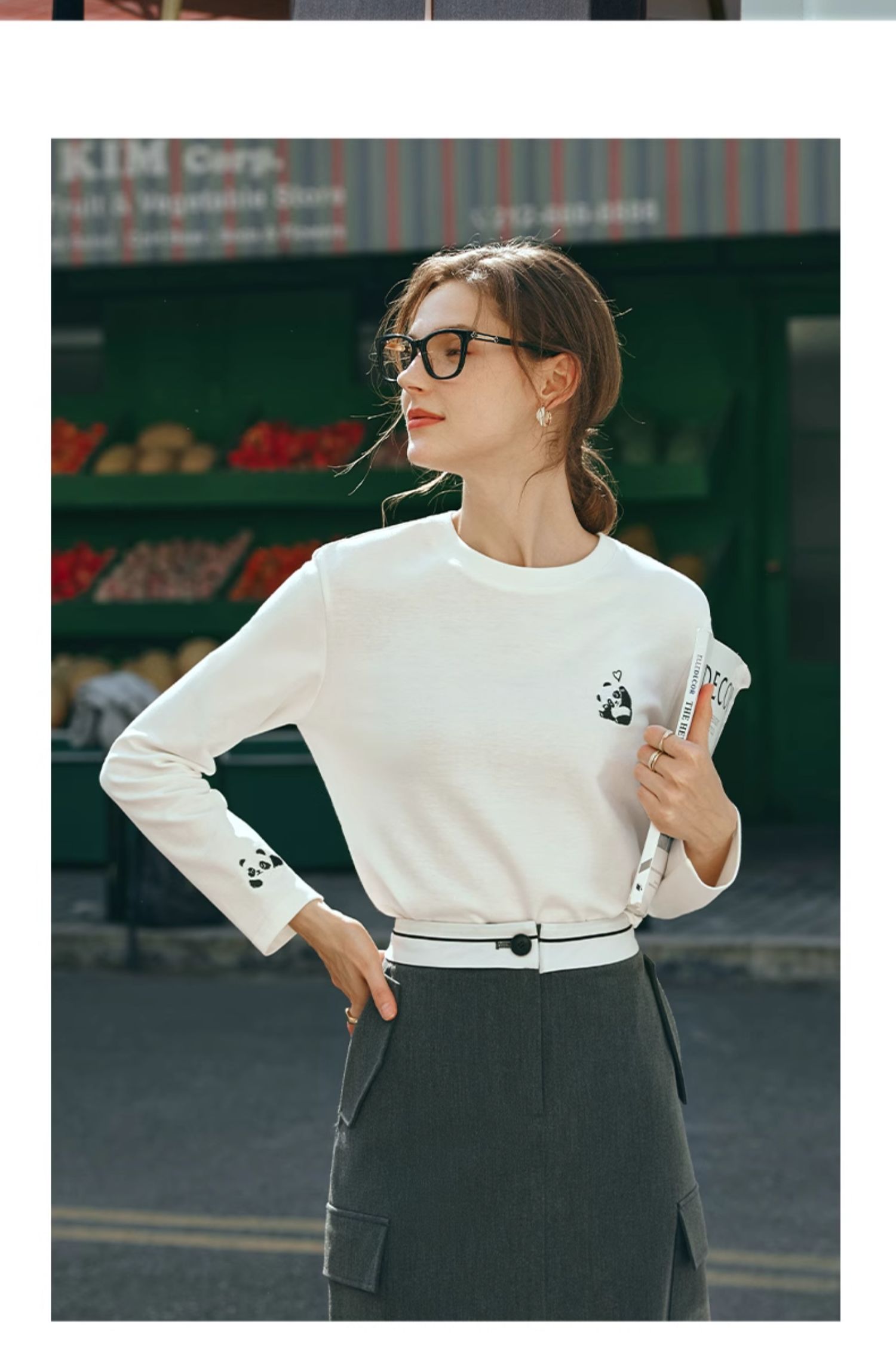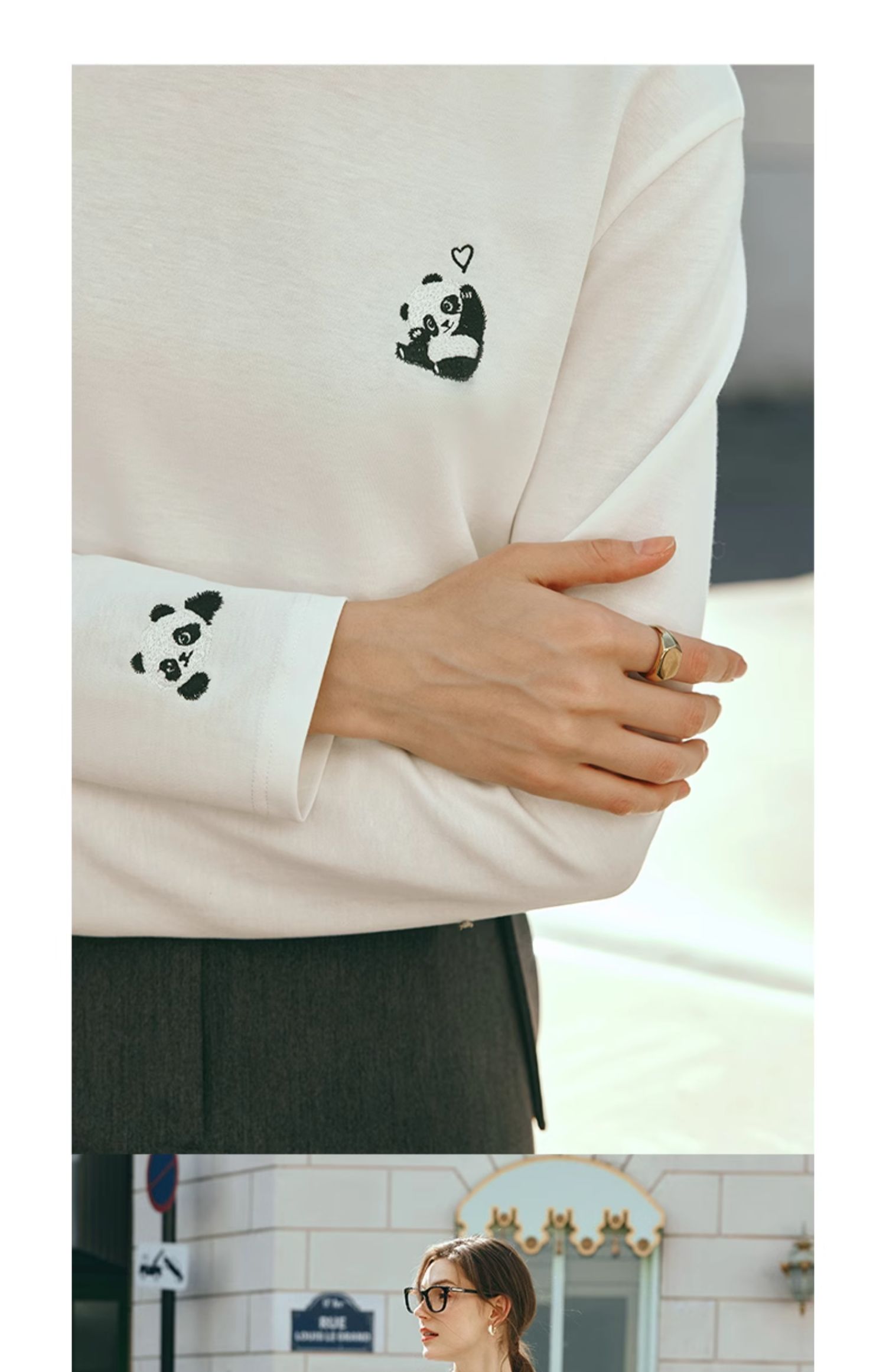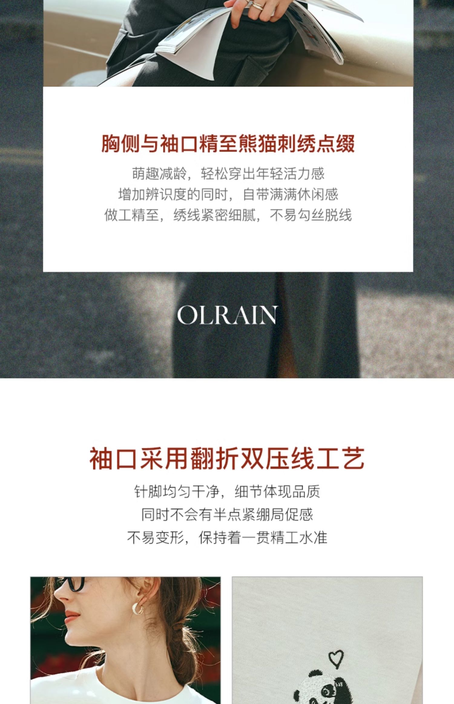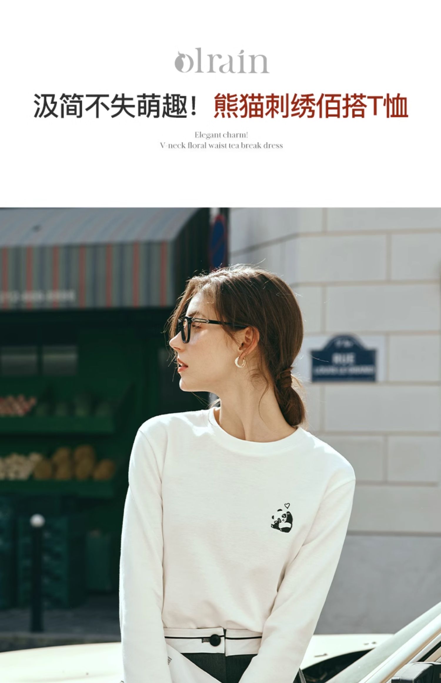 OLrain欧芮儿米白色长袖T恤女早春2024新款宽松百搭熊猫刺绣上衣
