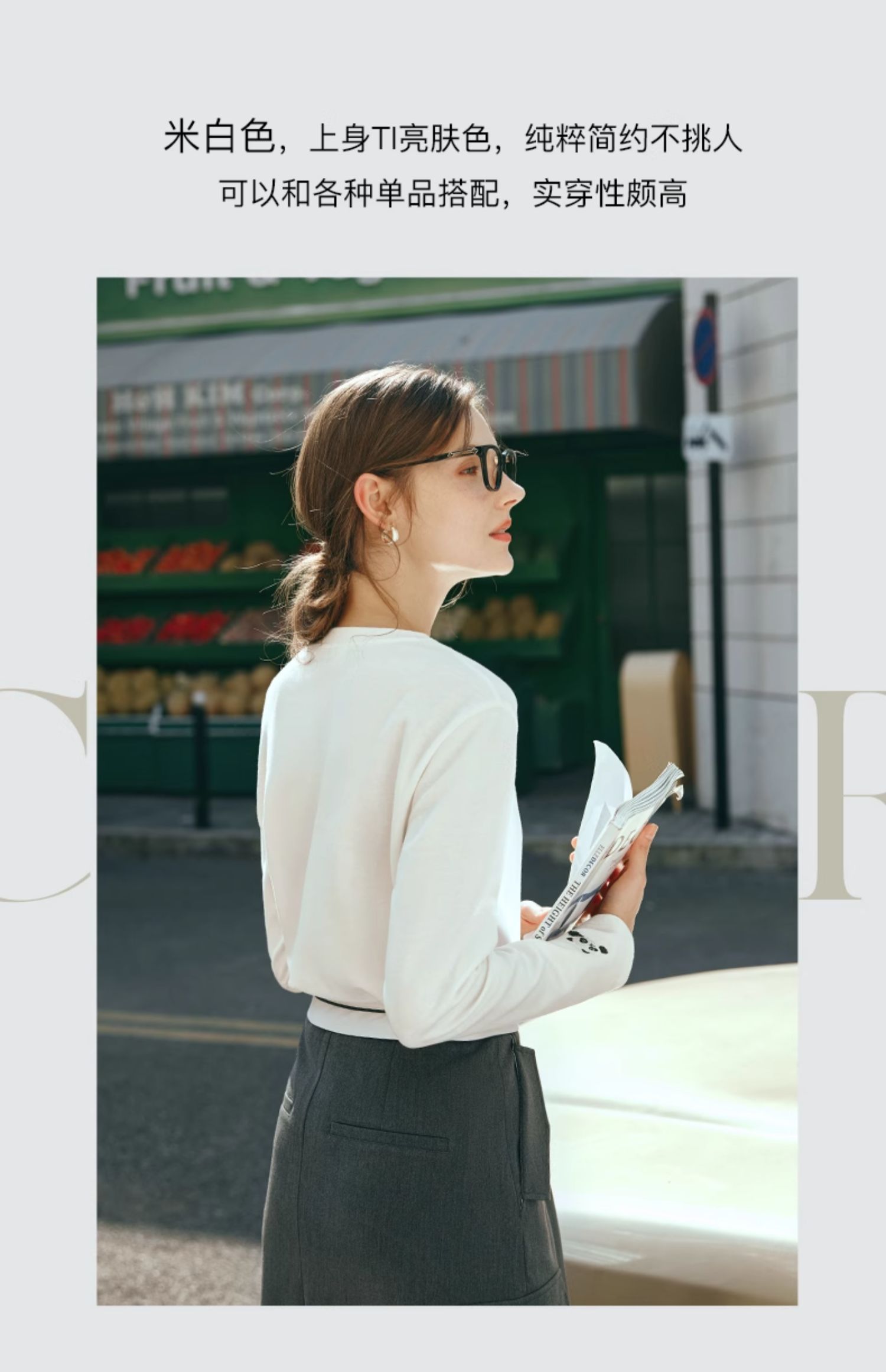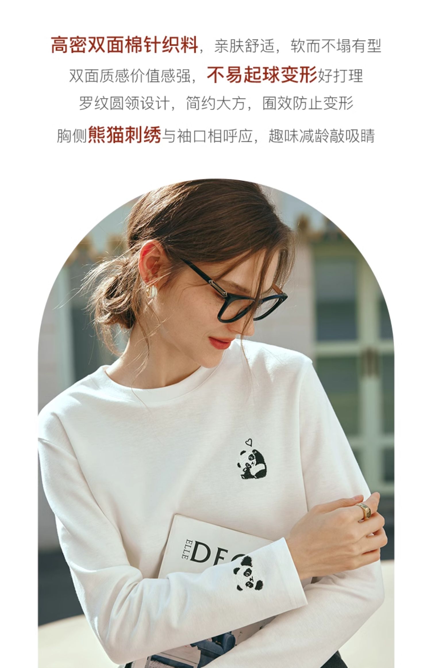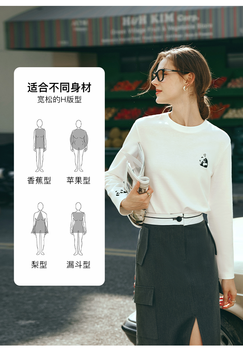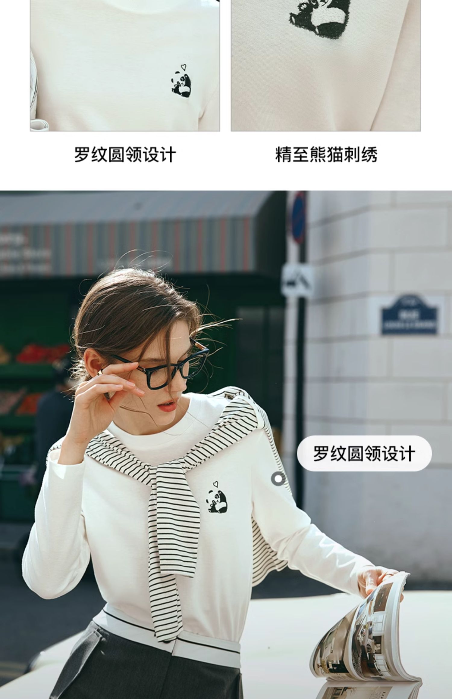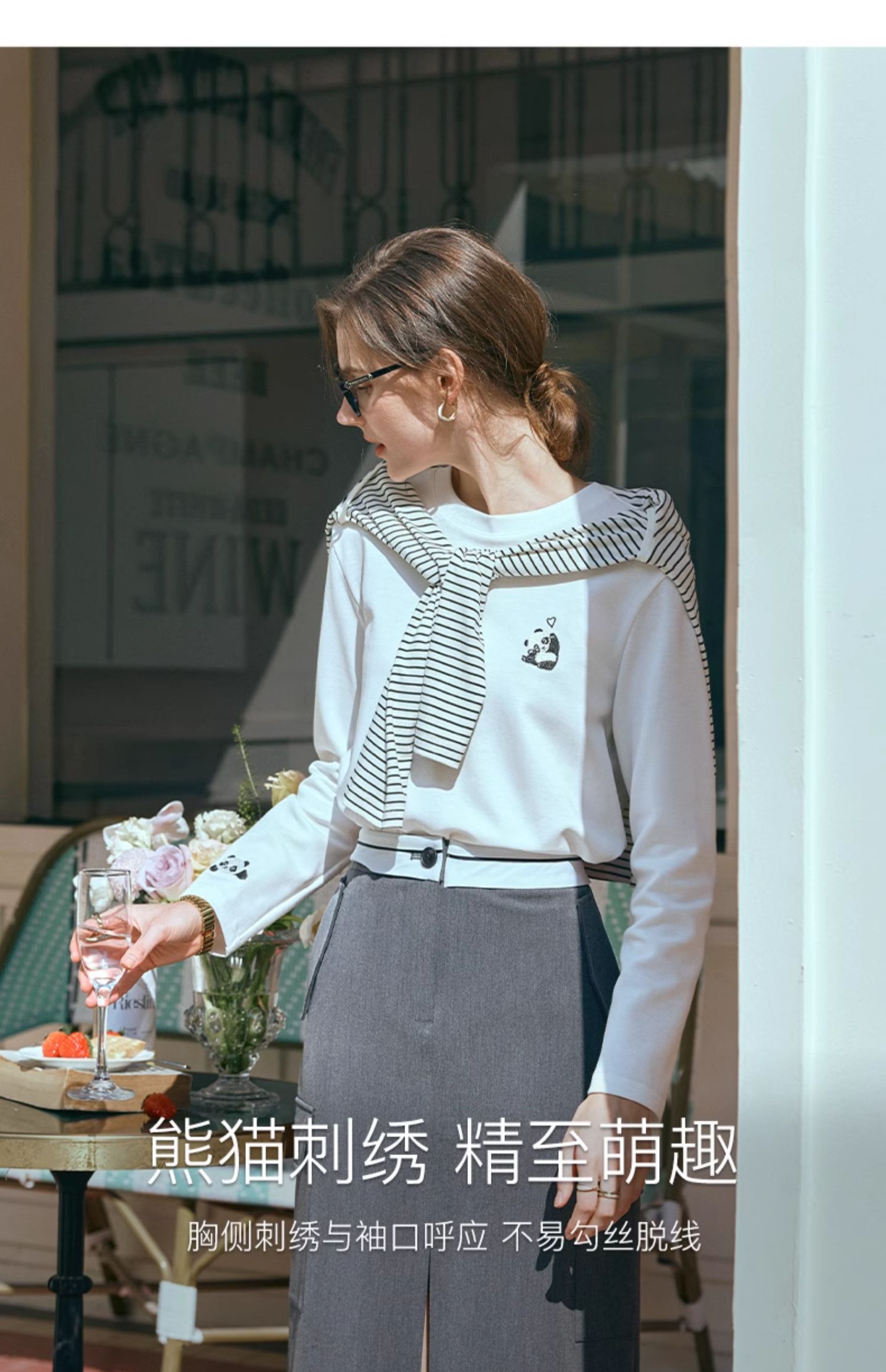 OLrain欧芮儿米白色长袖T恤女早春2024新款宽松百搭熊猫刺绣上衣