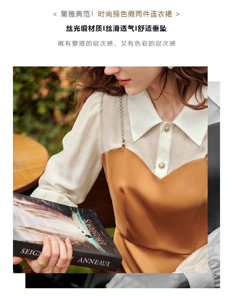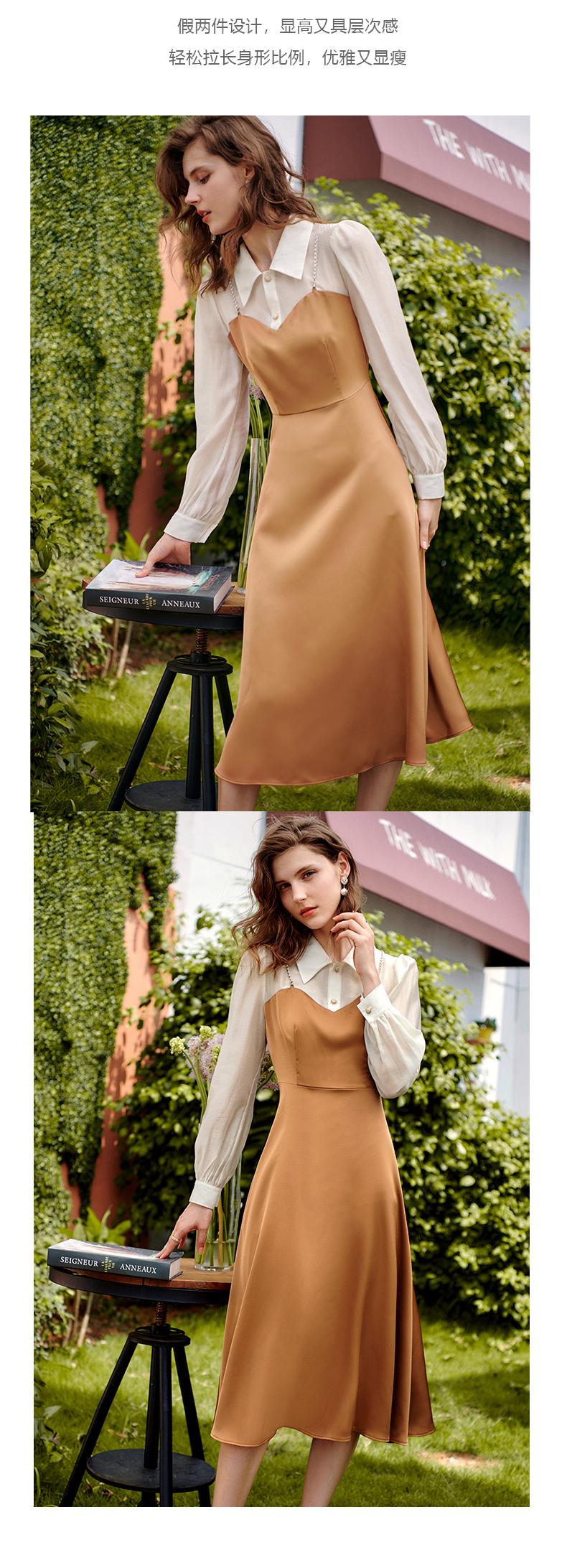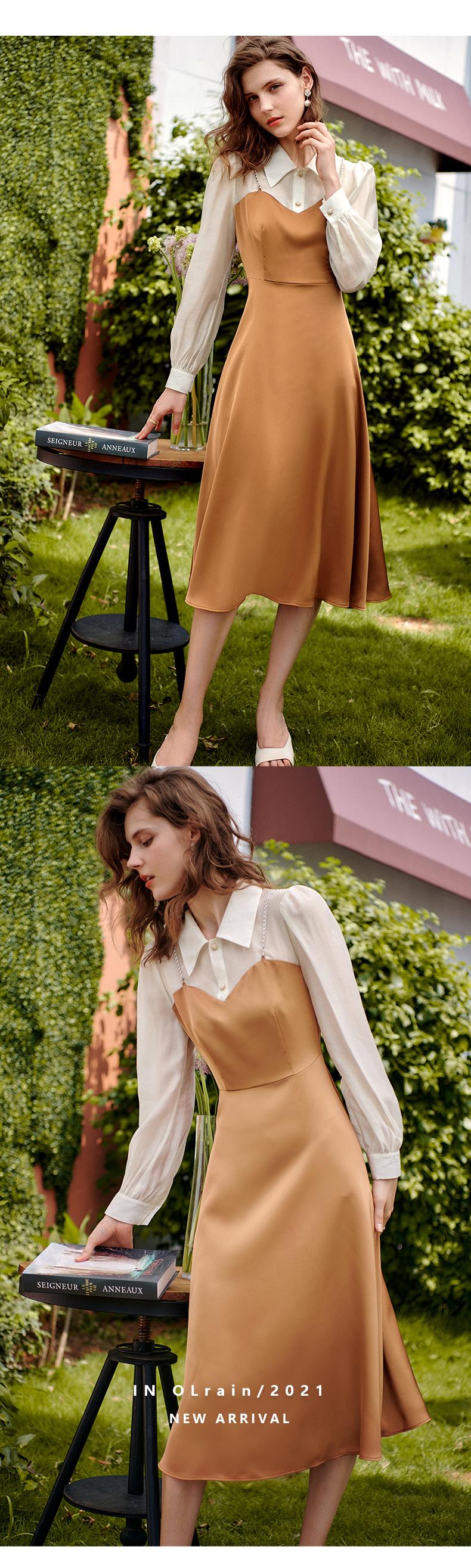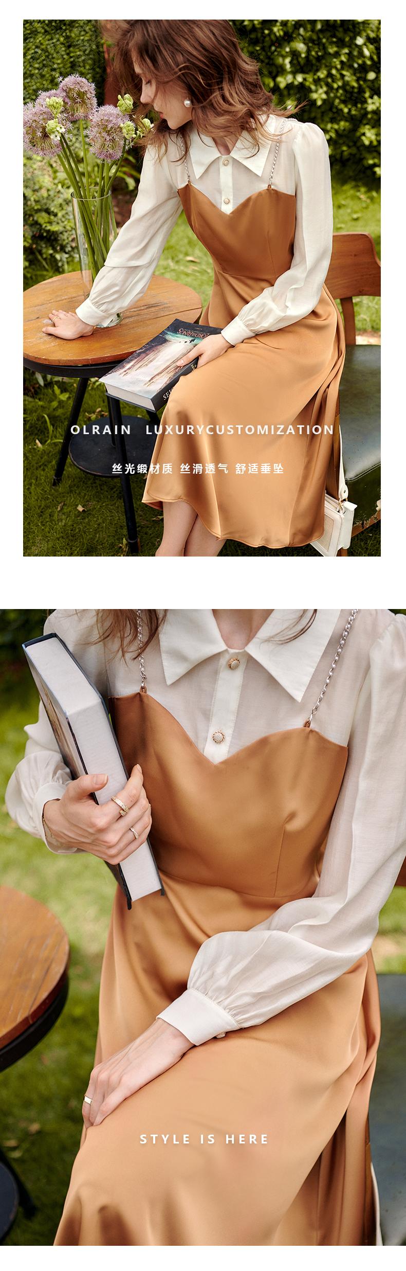 欧芮儿假两件连衣裙女长袖新款2021收腰显瘦时尚气质撞色裙子