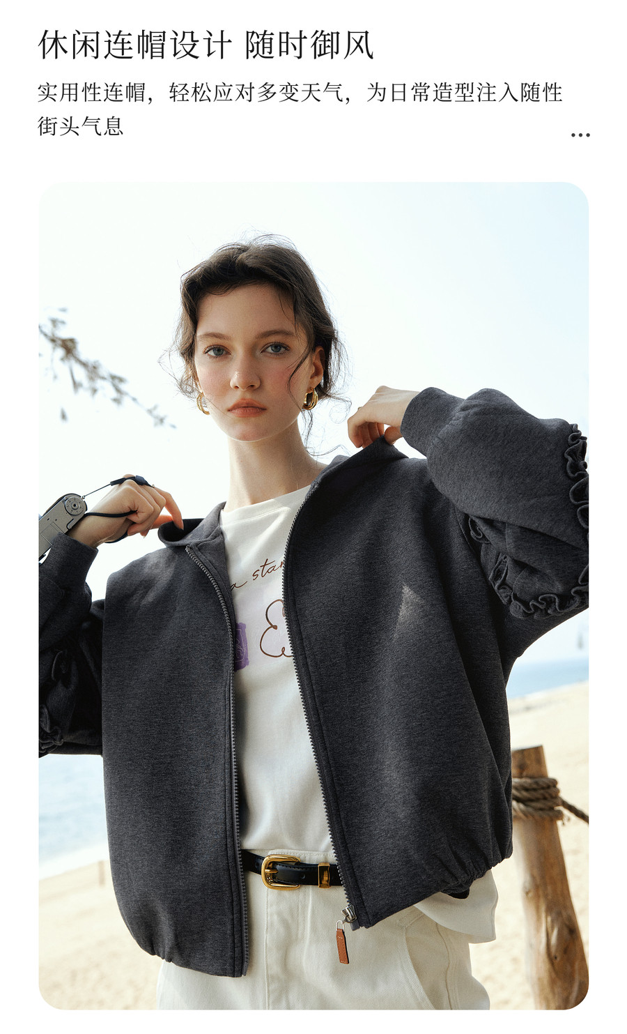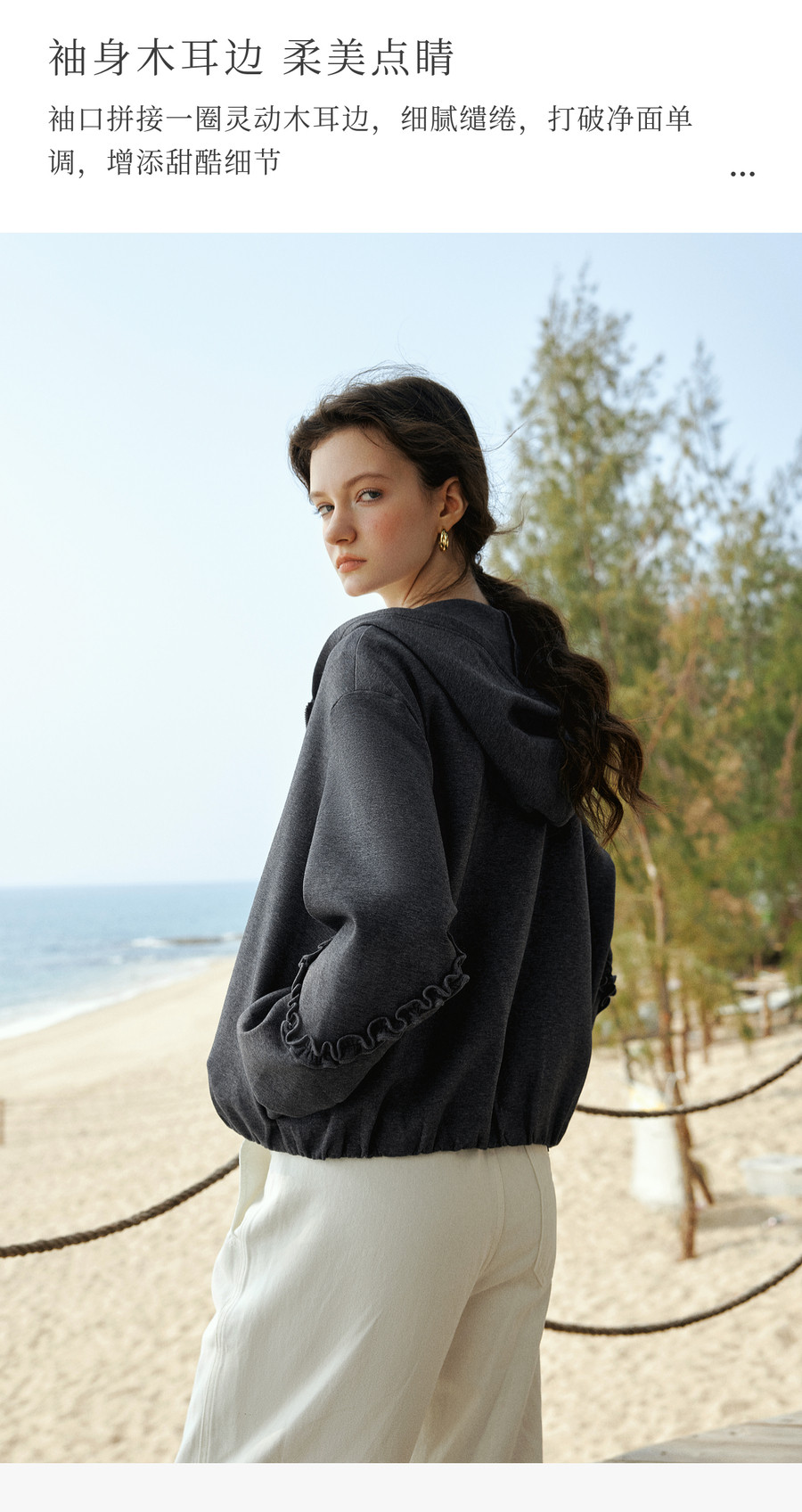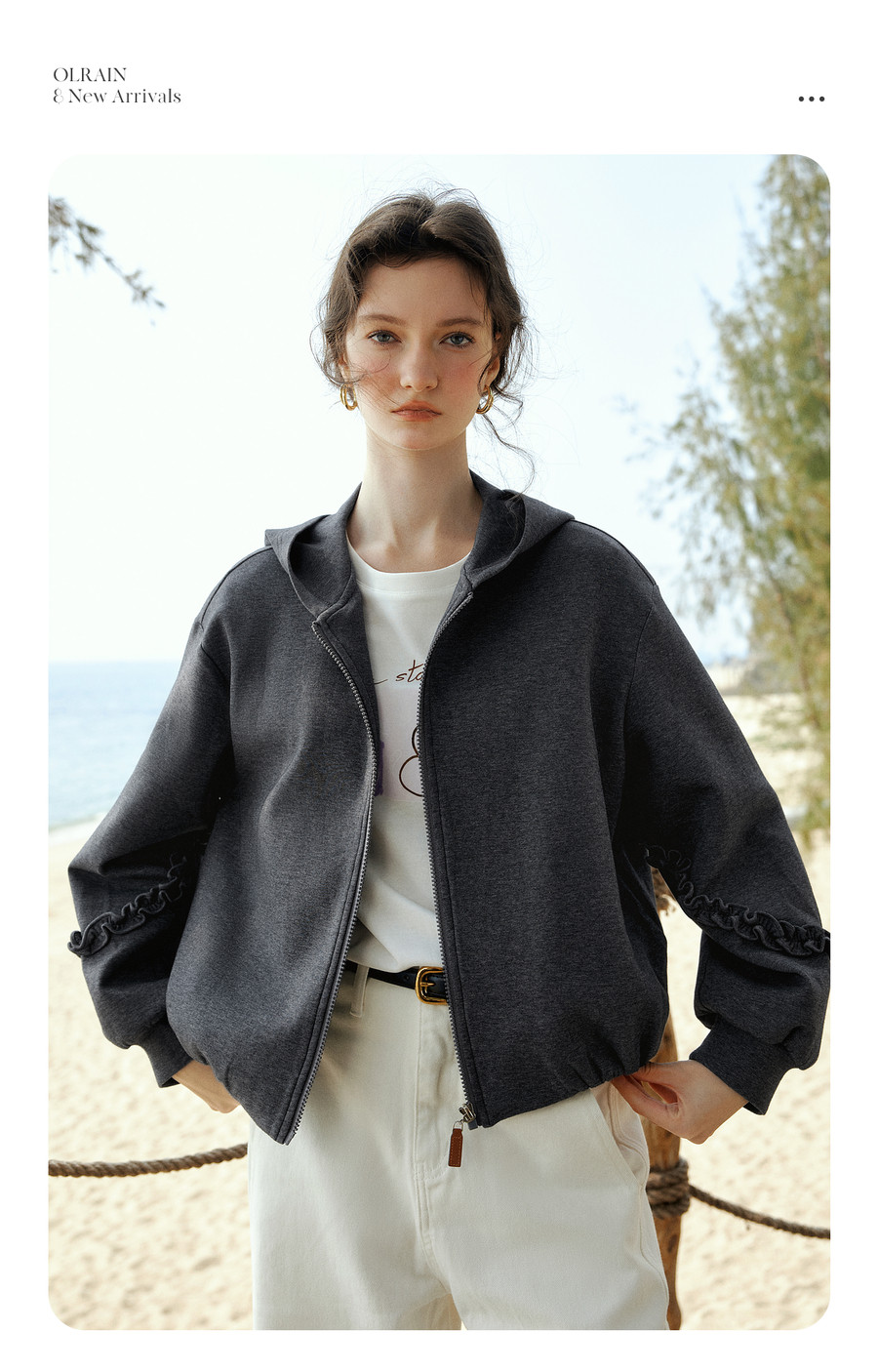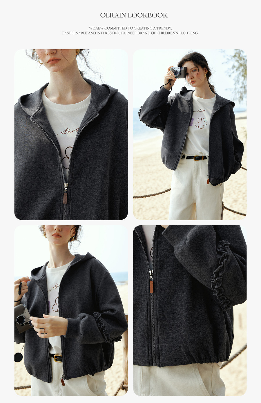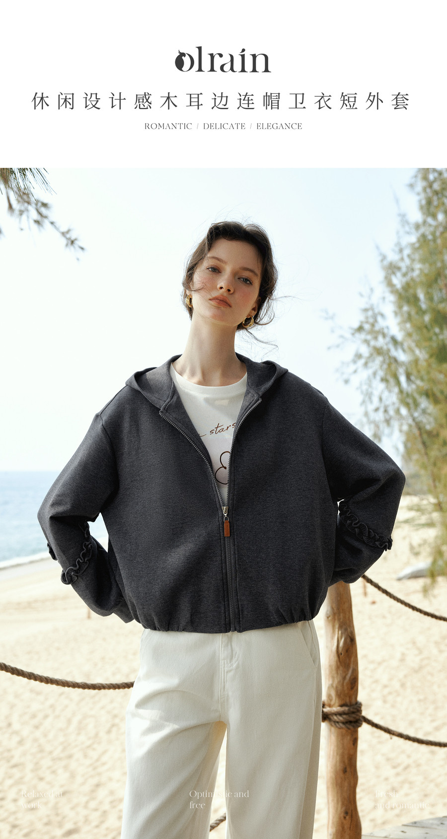 欧芮儿2026春新款木耳边设计感连帽卫衣女宽松慵懒风休闲开衫外套