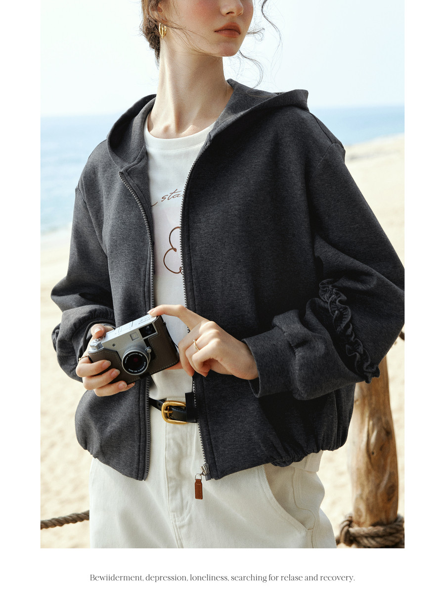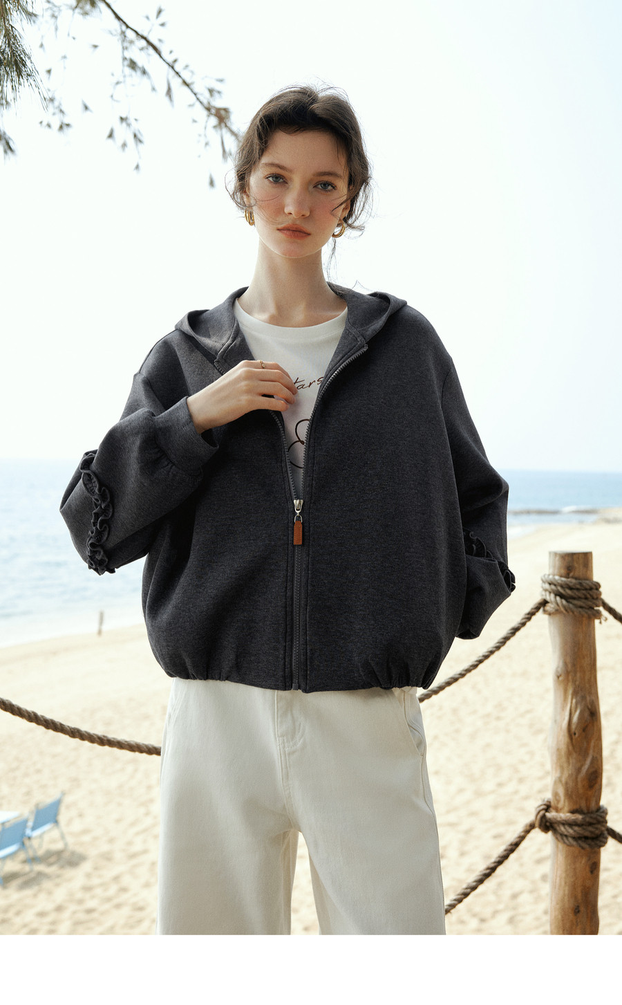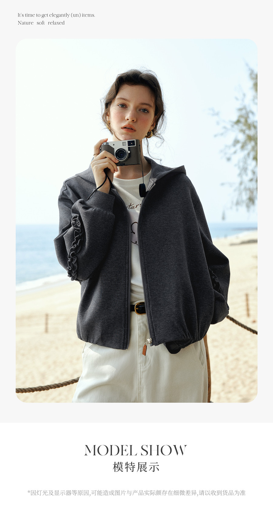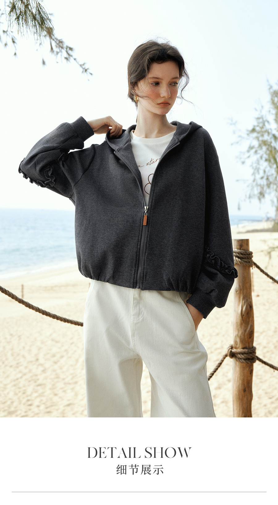 欧芮儿2026春新款木耳边设计感连帽卫衣女宽松慵懒风休闲开衫外套