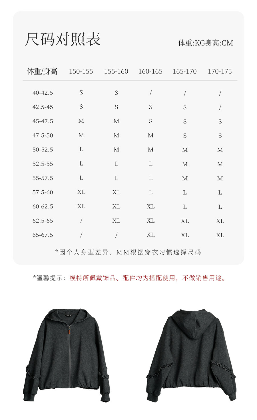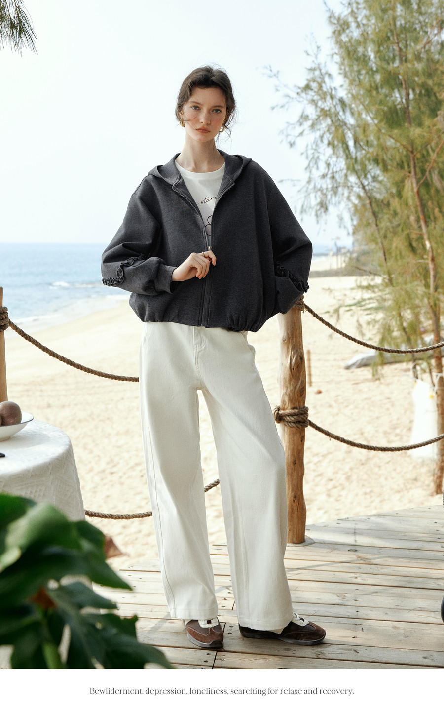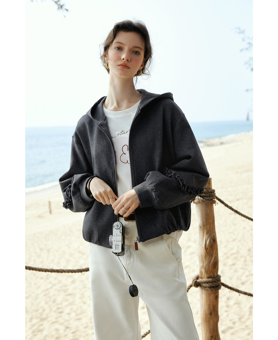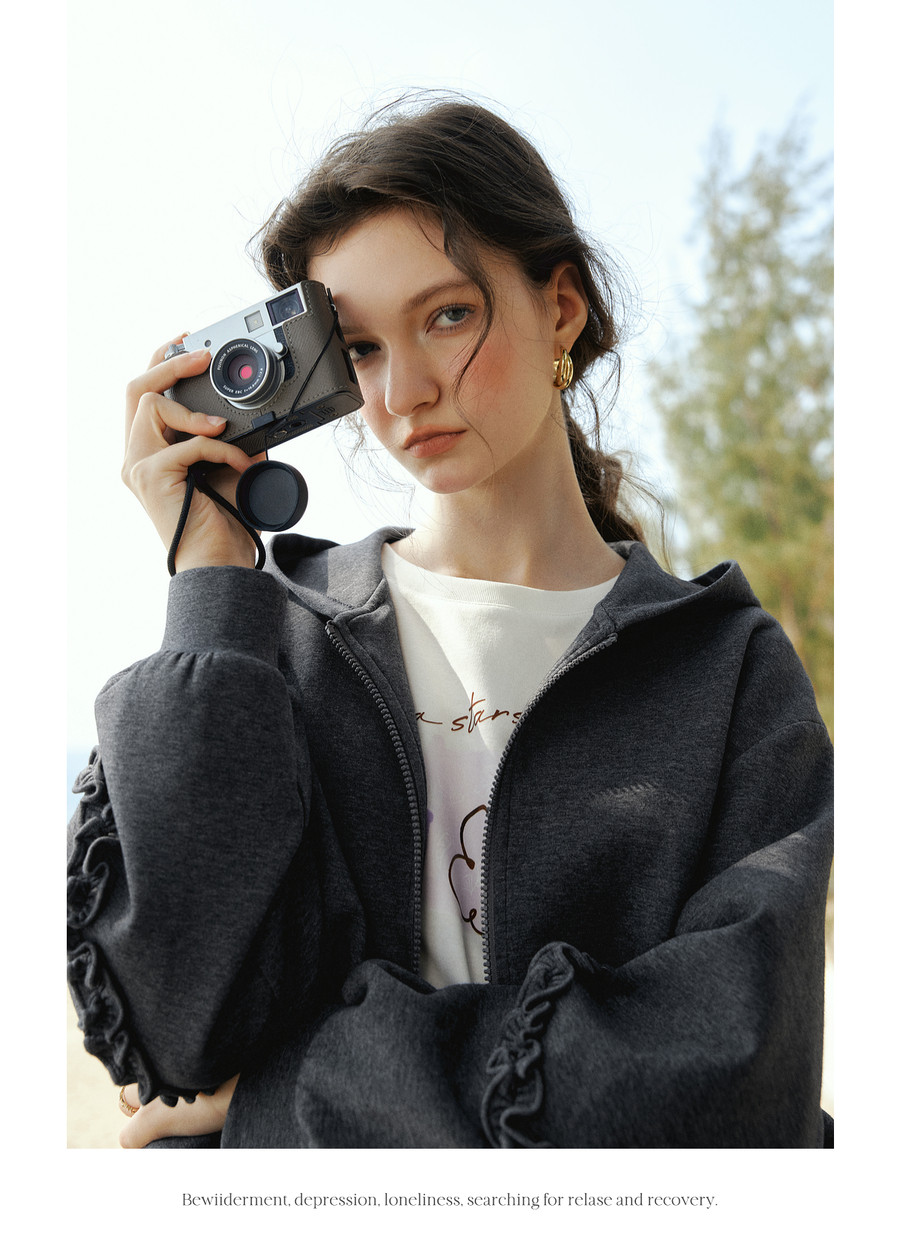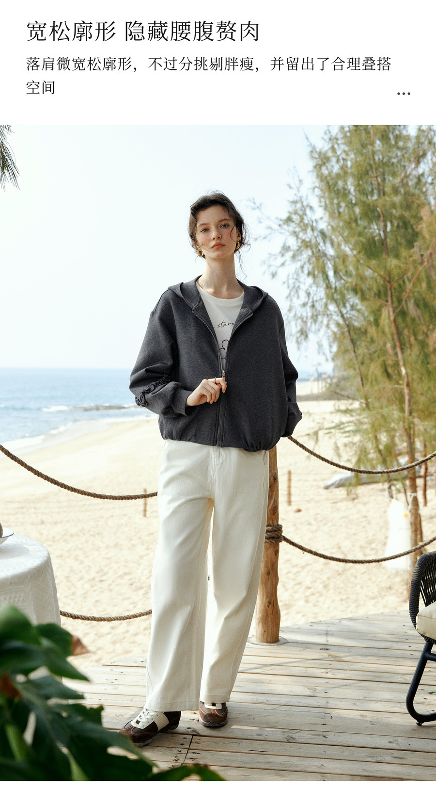 欧芮儿2026春新款木耳边设计感连帽卫衣女宽松慵懒风休闲开衫外套
