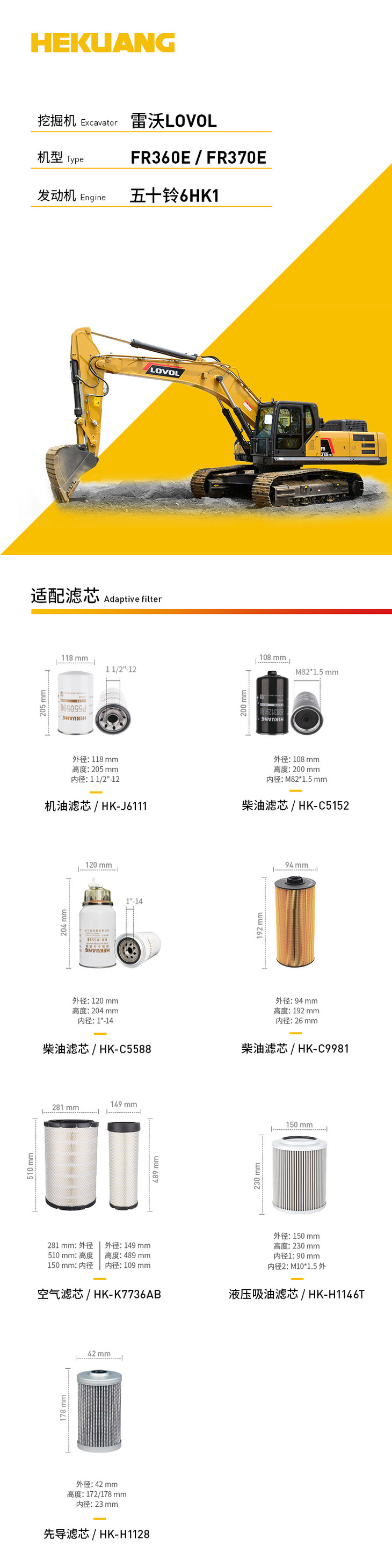 雷沃FR360E/370E挖掘机滤清器 机油柴油空气滤芯 液压油先导滤芯