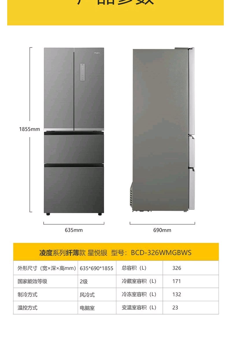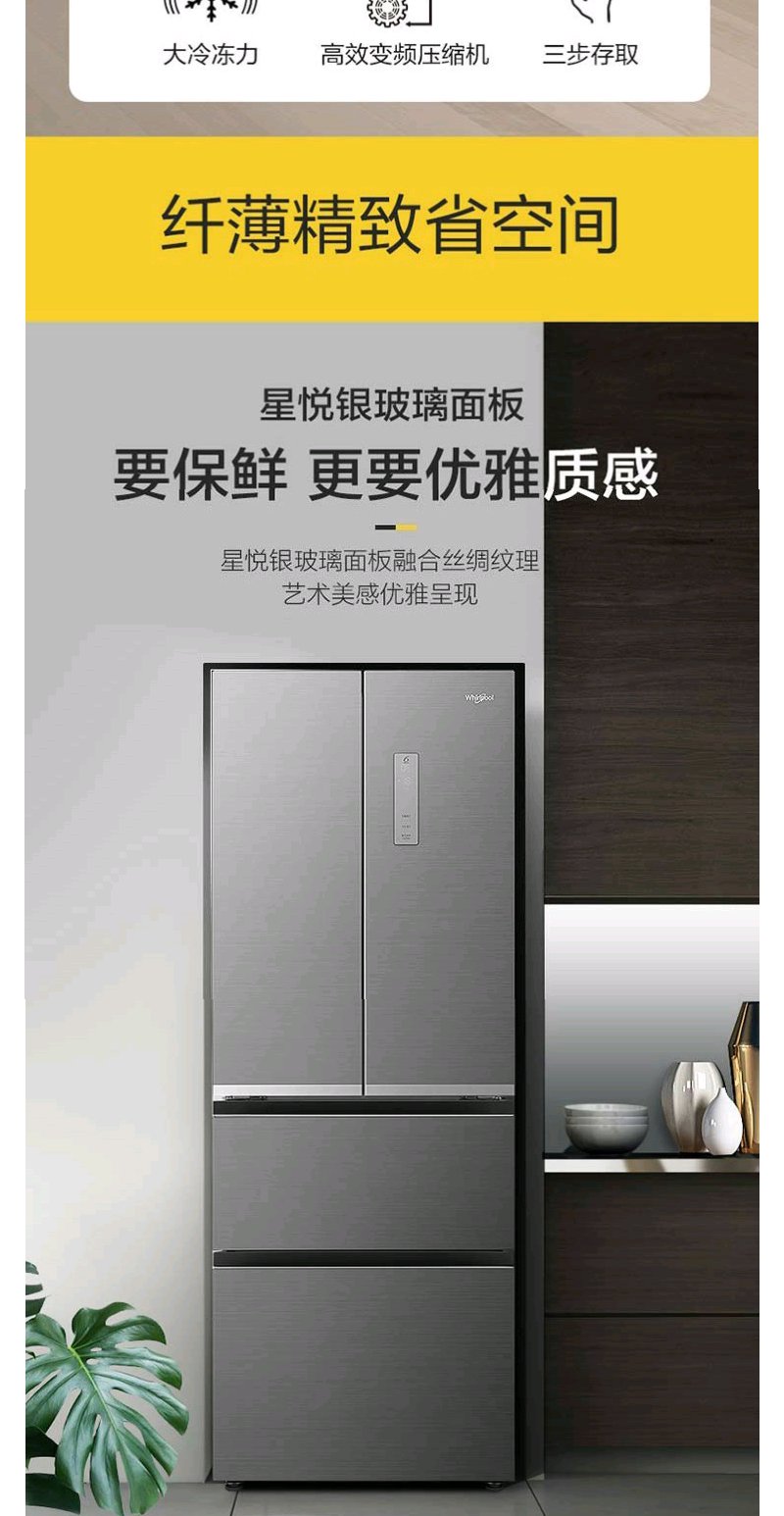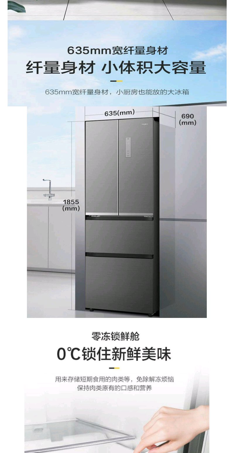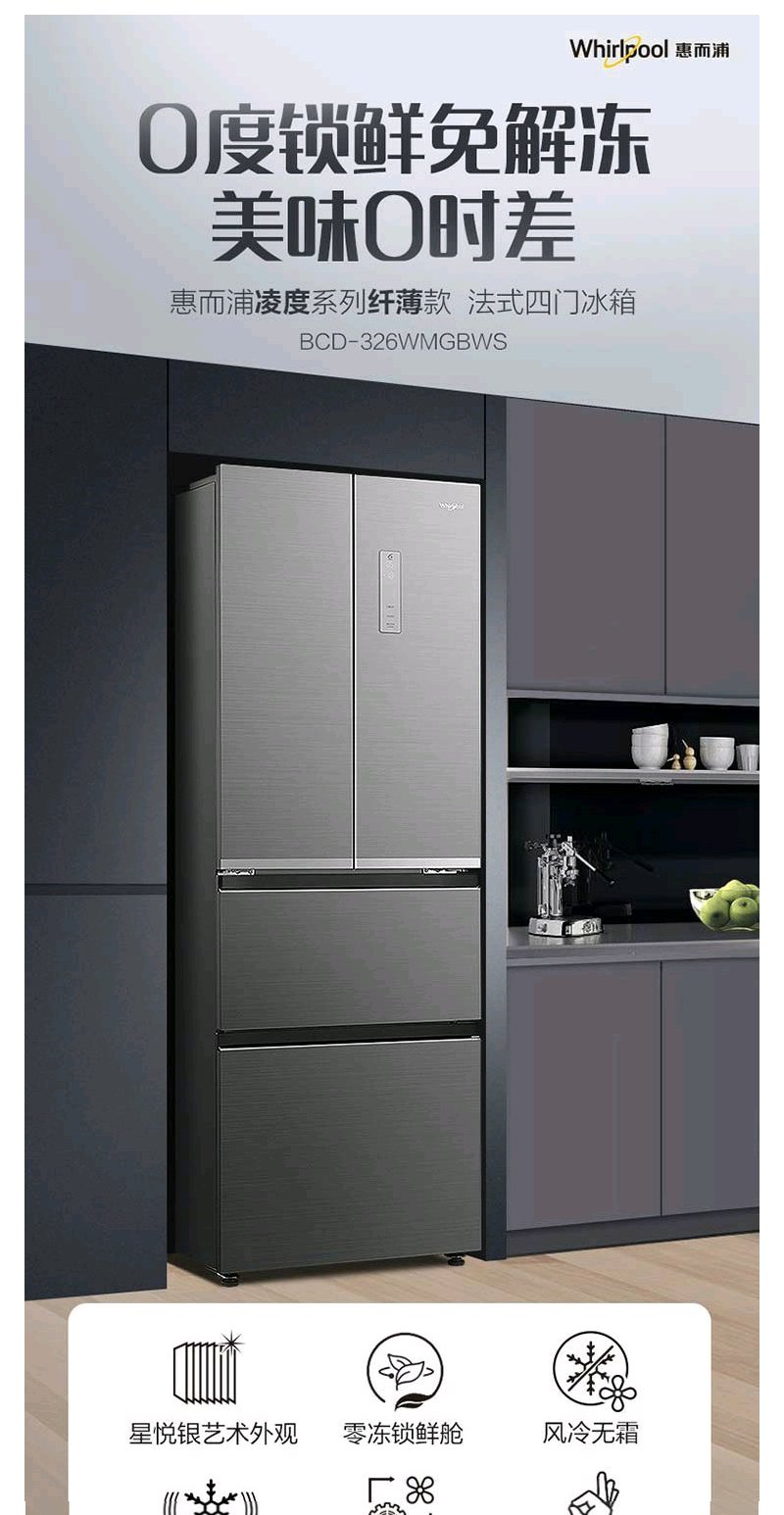 惠而浦(Whirlpool) BCD-326WMGBWS 法式多四门风冷超纤薄嵌入0度保鲜家用电冰箱 326L