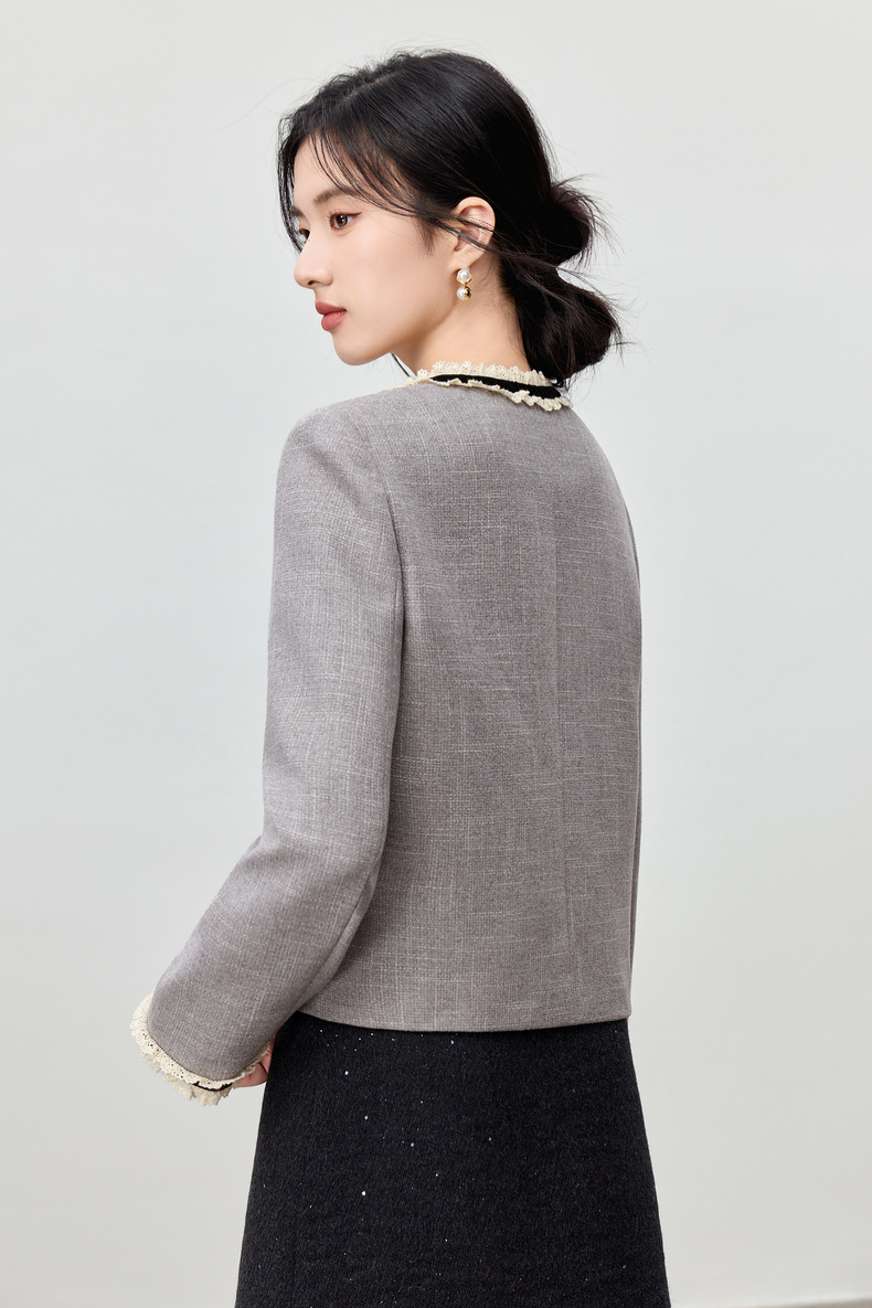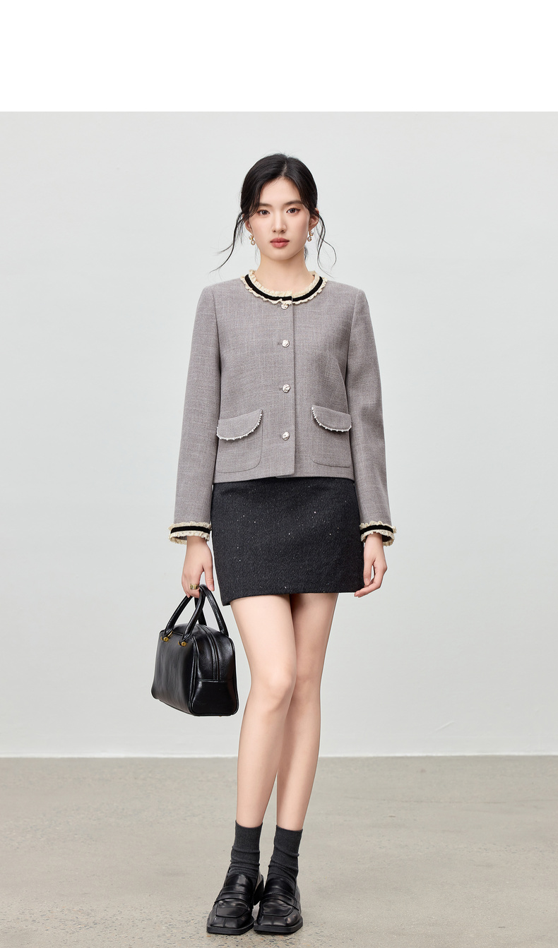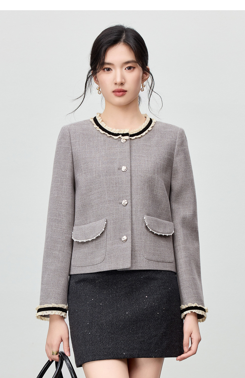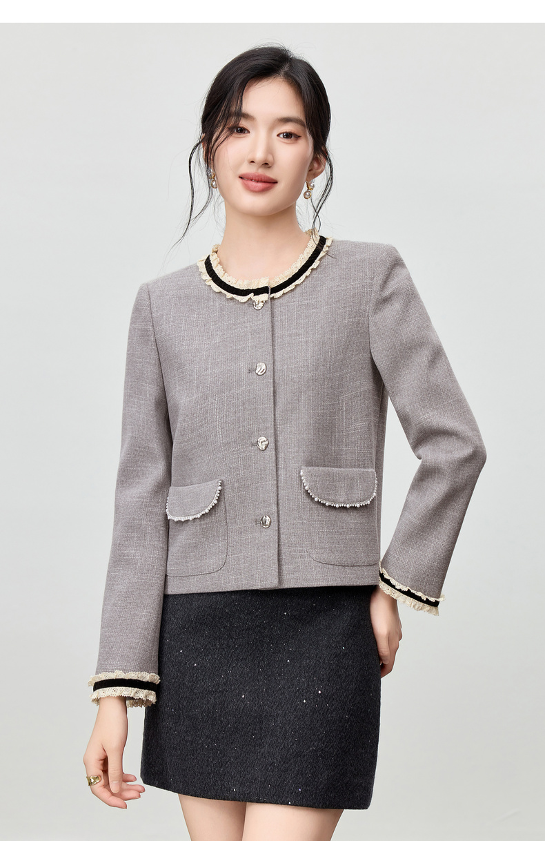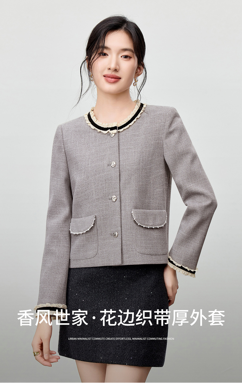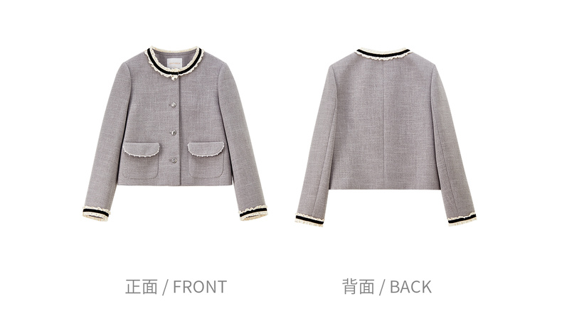 【内购】【撞色花边】优雅通勤名媛风圆领异形扣垫肩长袖厚小香风外套-Q53WA3438