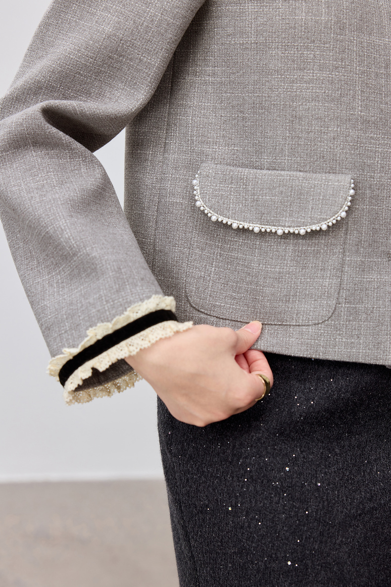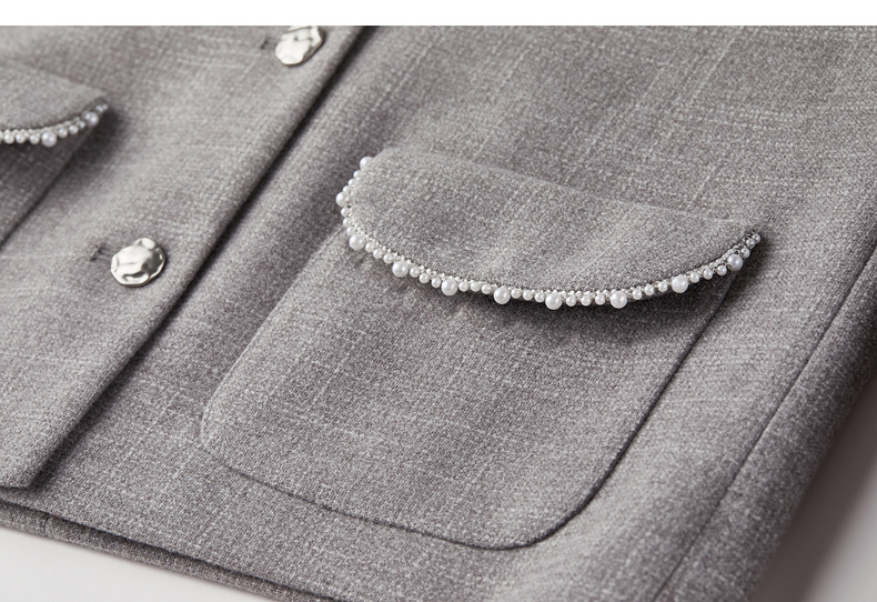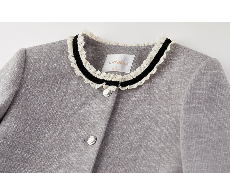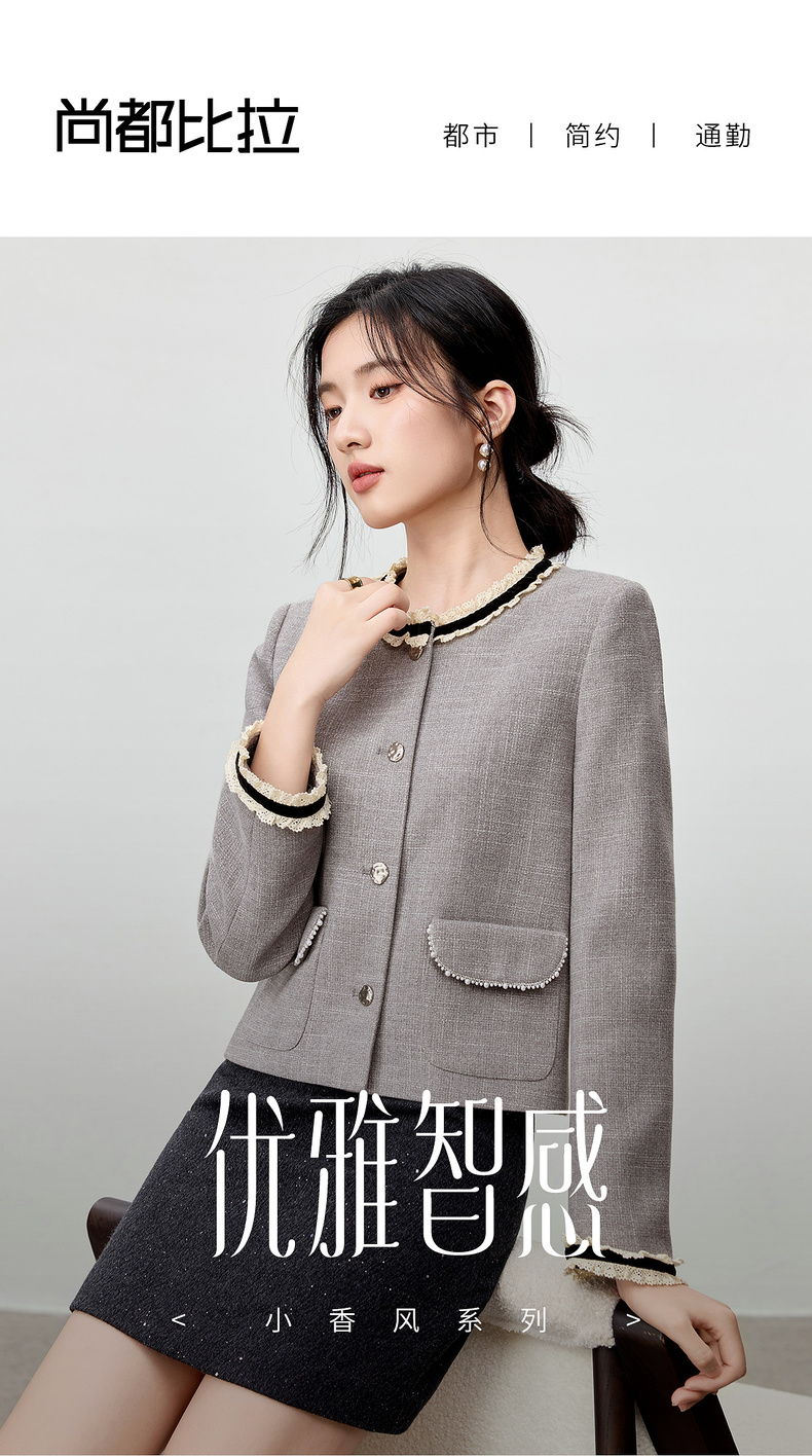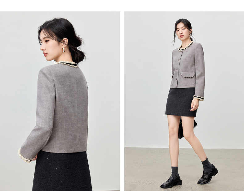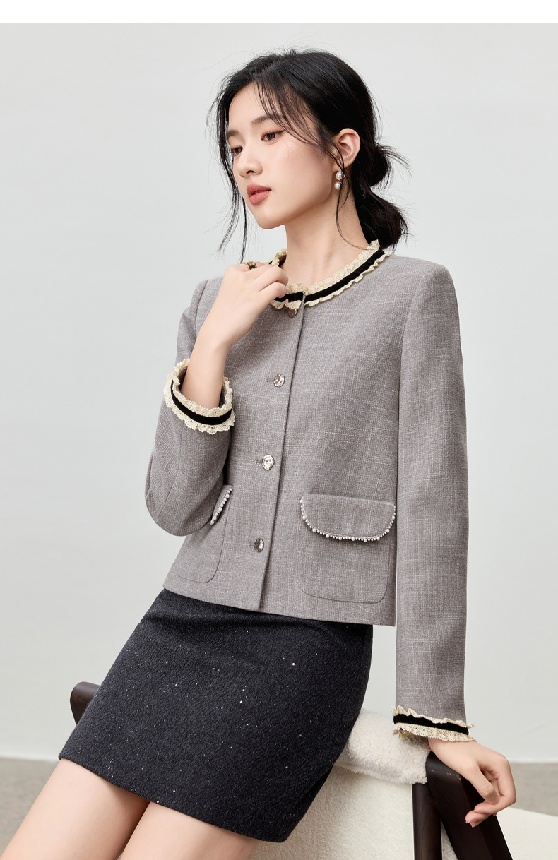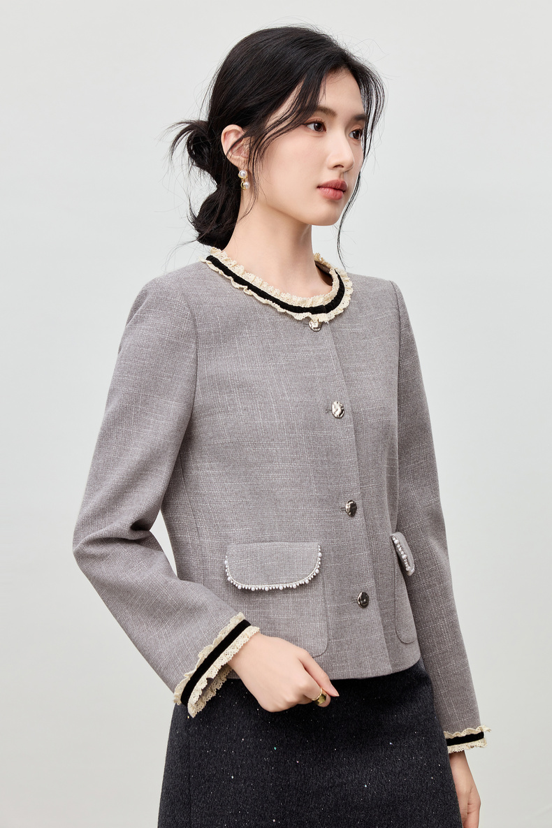【内购】【撞色花边】优雅通勤名媛风圆领异形扣垫肩长袖厚小香风外套-Q53WA3438