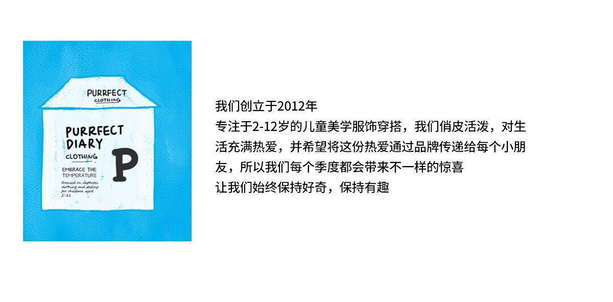 - Purrfect-Diary专注于贴近自然随性的穿着概念,轻奢平价的童装文化传播,在产品设计上更加注重婴童穿着的舒适性、安全性、更出众的国际化品牌,将欧美的育婴文化在中国进行深入的传播与推广。