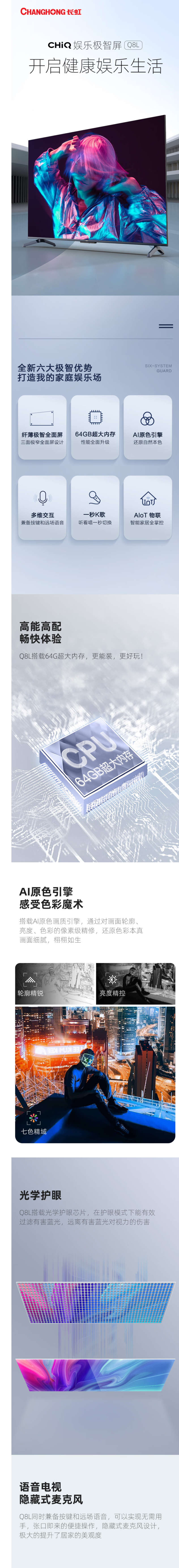 长虹(912521)(CHANGHONG)65Q8L 65英寸4K全面屏全场景语音智慧屏电视