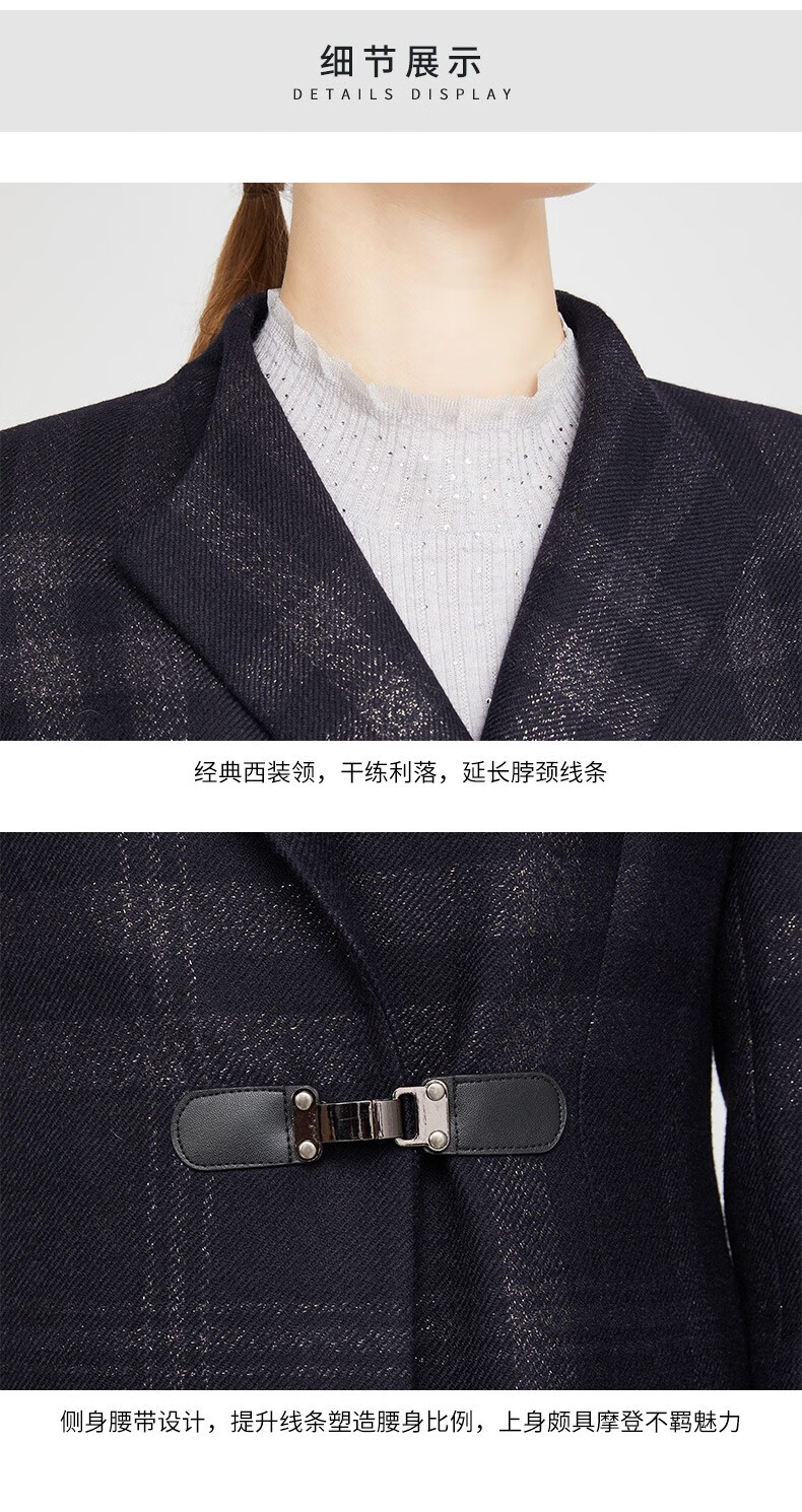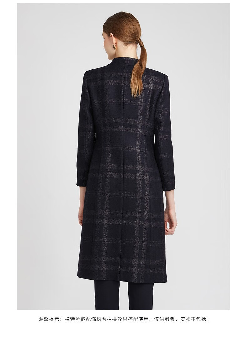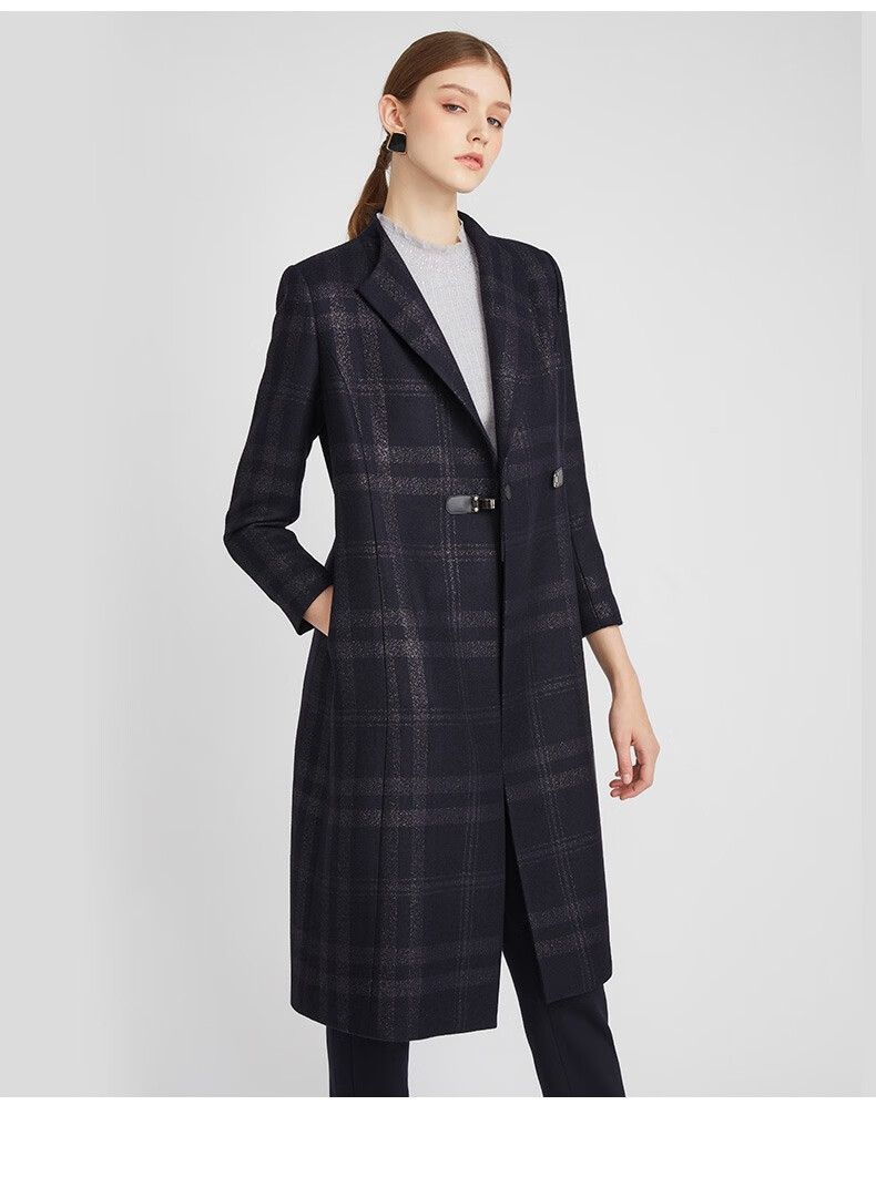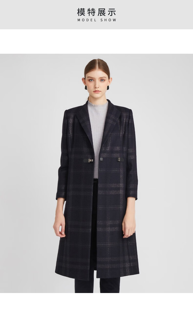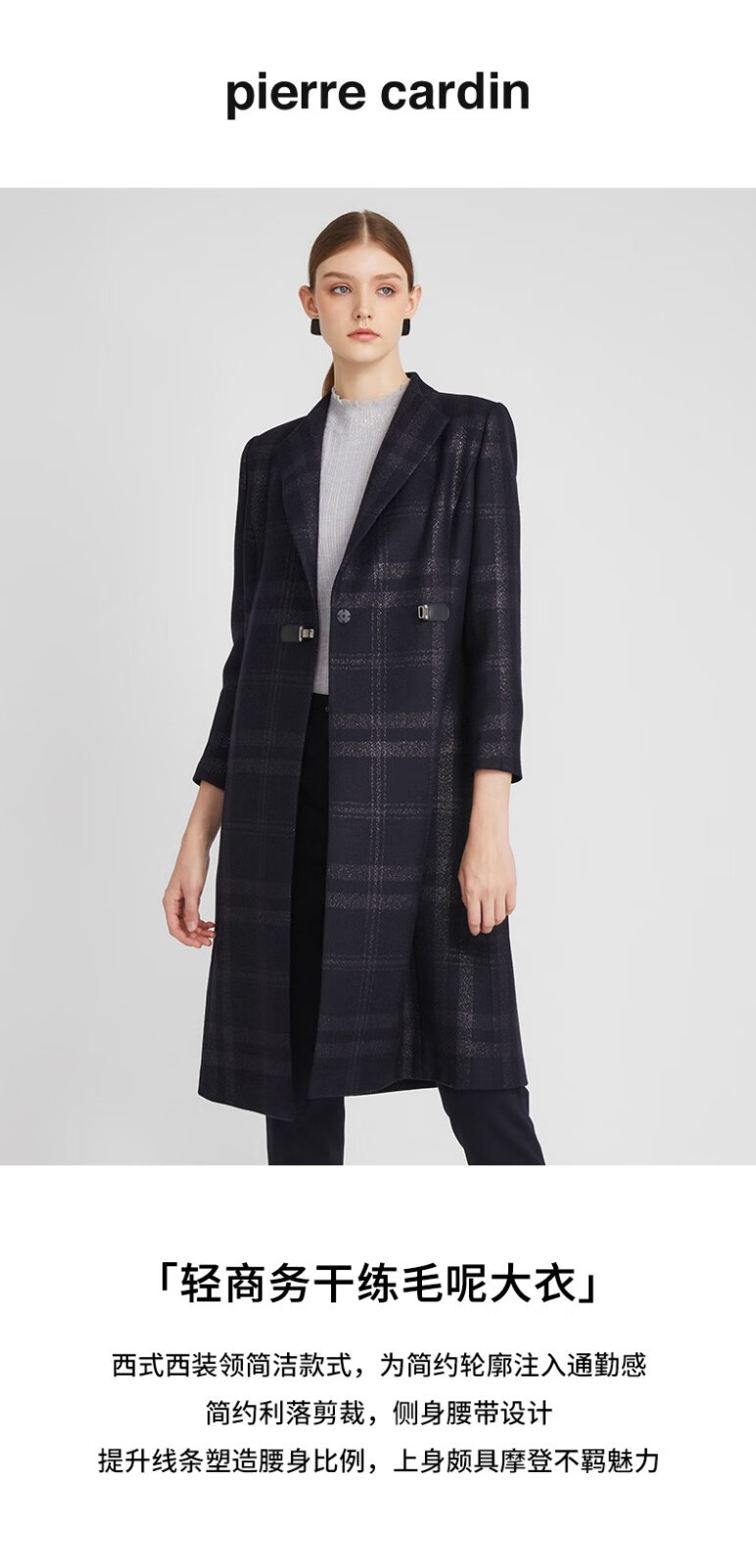 皮尔卡丹女装毛呢外套冬高级感大翻领苏格兰格纹大衣P2417C2995N3