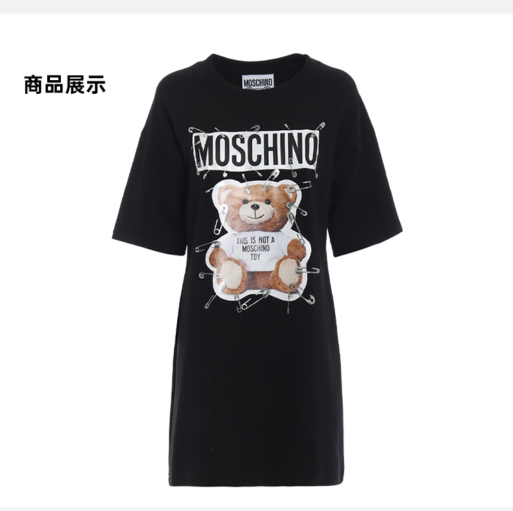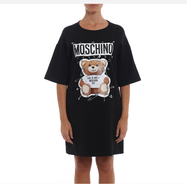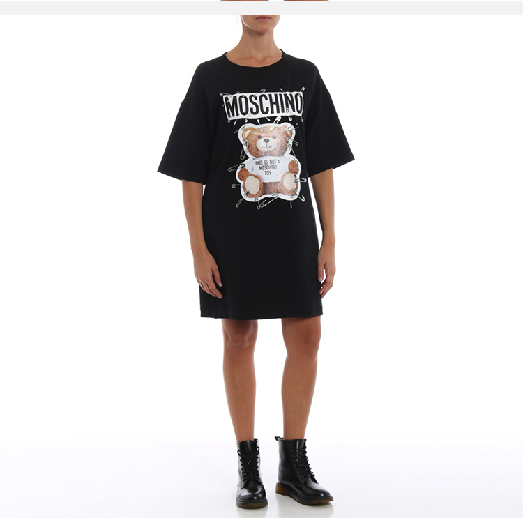 【一】MOSCHINO COUTURE 莫斯奇诺 女士棉质小熊徽标印花圆领短袖T恤裙 黑色 0444 5526 1555