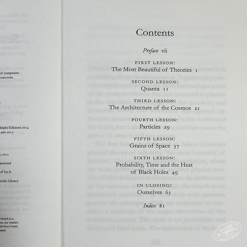 这七堂课的经历,仿佛一次冒险、一场伟大的旅行,充满着年轻、好奇、诗意与感动,为我们打开了一个奇妙的物理学的世界,也带我们轻盈飞过重重障碍,窥见科学的深刻与美丽。没有繁琐的方程,只有诗意的讲述,即使没有科学背景的人也能轻松读懂。