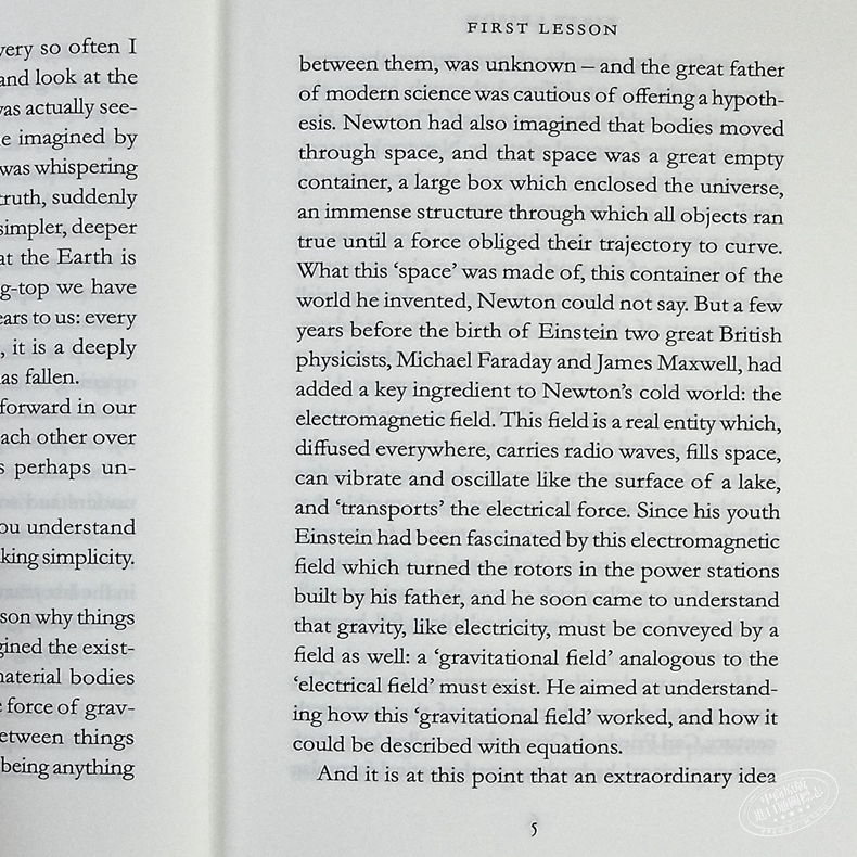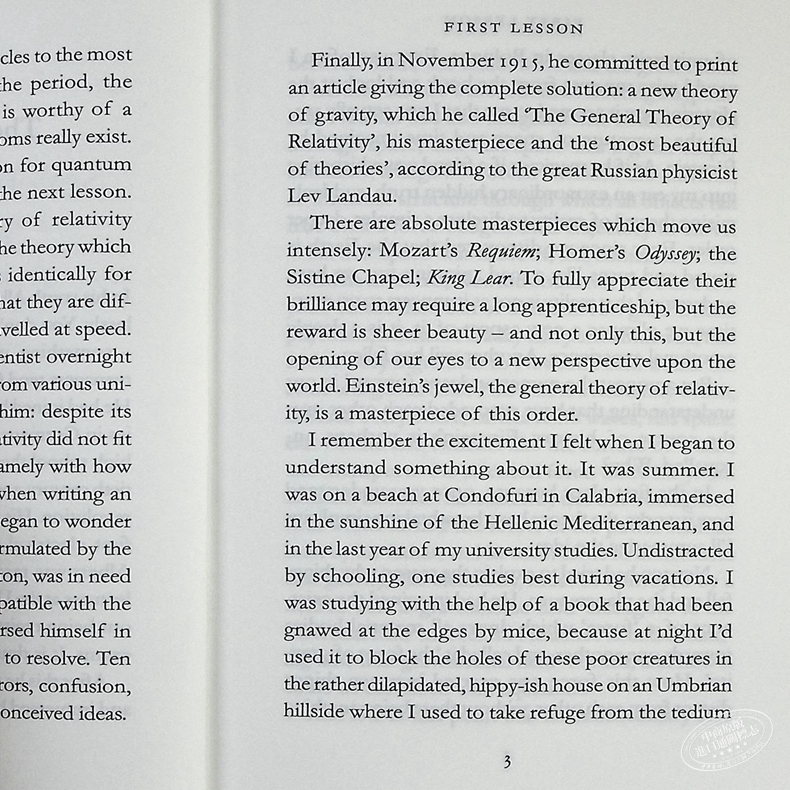 关于这个世界的理解需要我们有一个对于物理的基本理解,多亏了有了这本意大利学术畅销书,让我们的理解更加容易了一些;这本书对于这个圣诞节来说就像是被塞满了圣诞礼物的圣诞袜… ….自从霍金的《时间简史》之后,市场上还没有过如此之成功的科学读物。