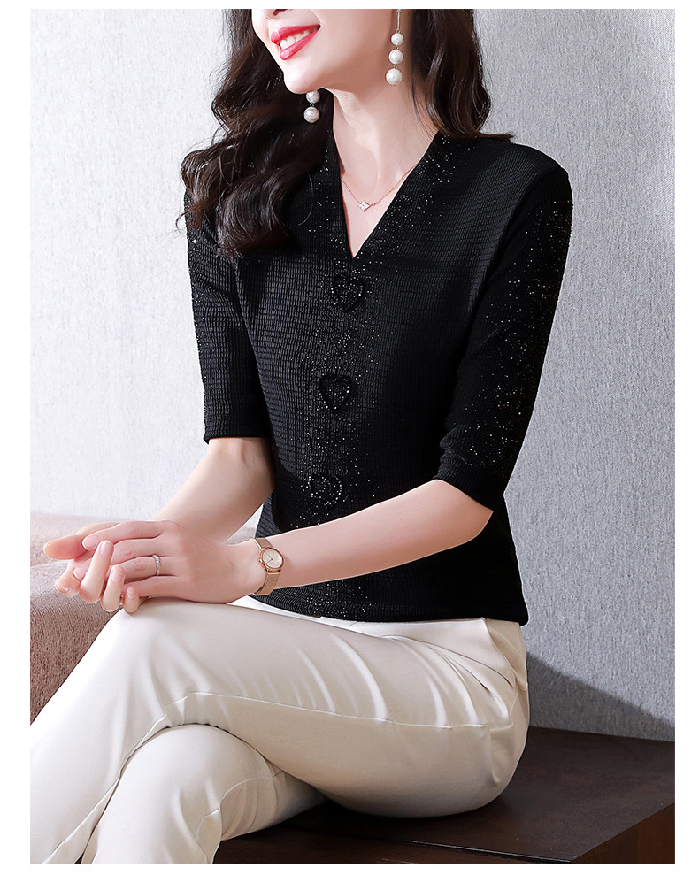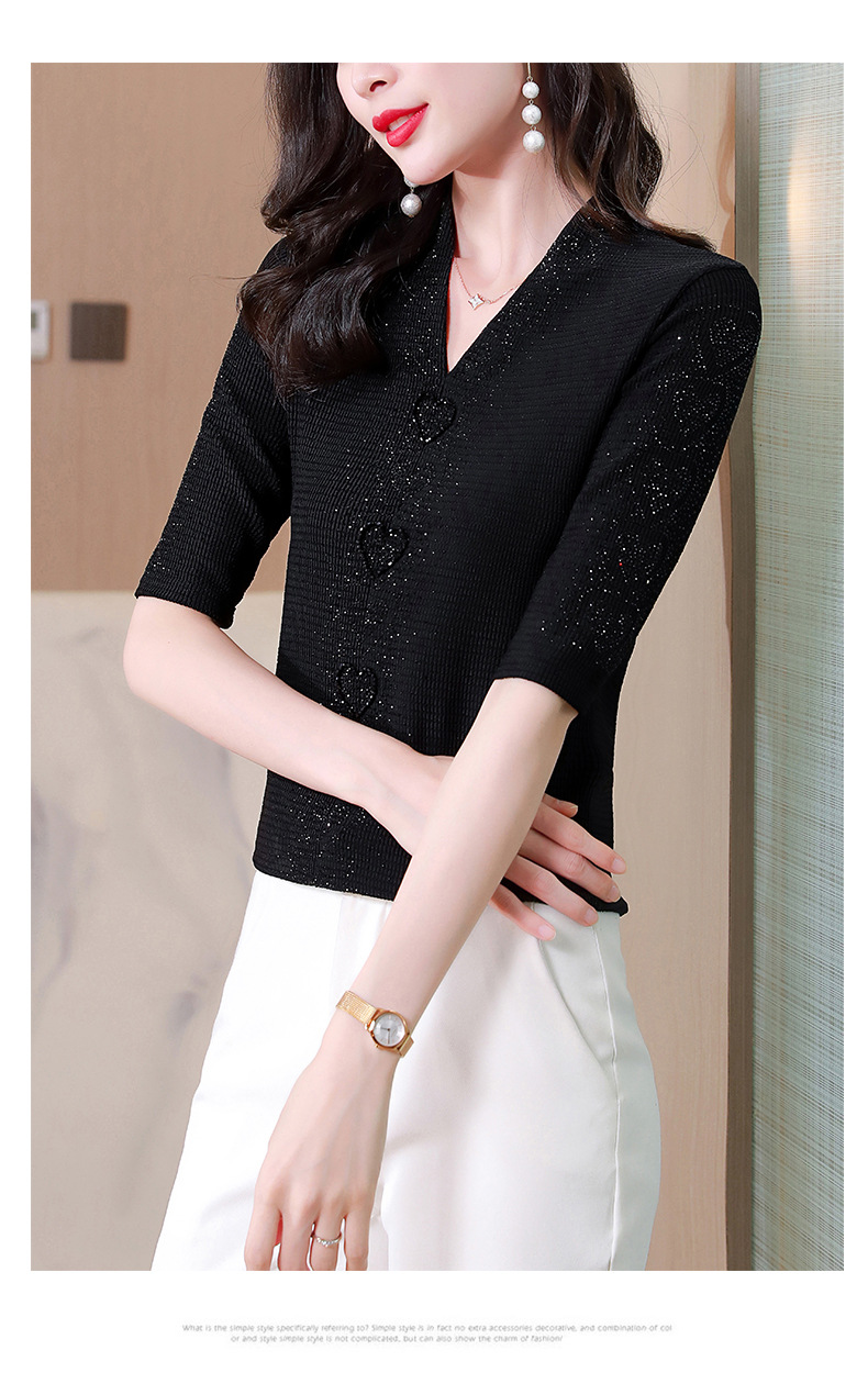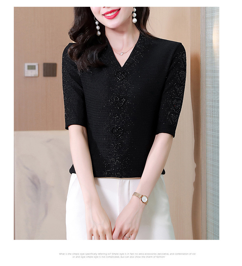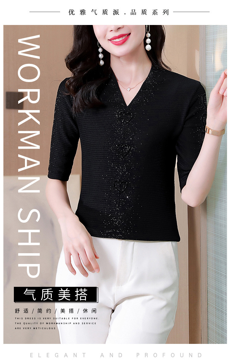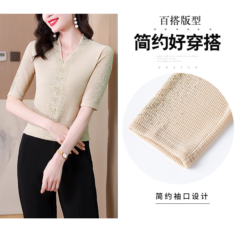 新款百搭,交叉V领修身显瘦烫钻短袖打底衫t恤KQL-E37M2652