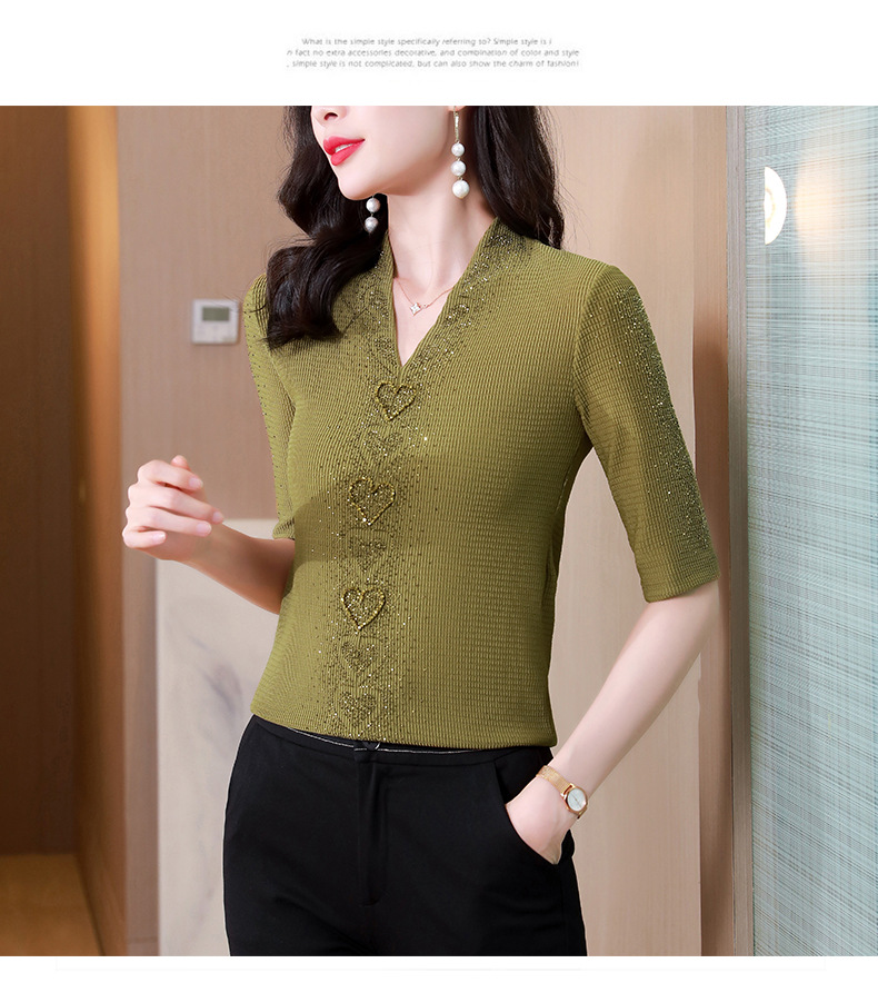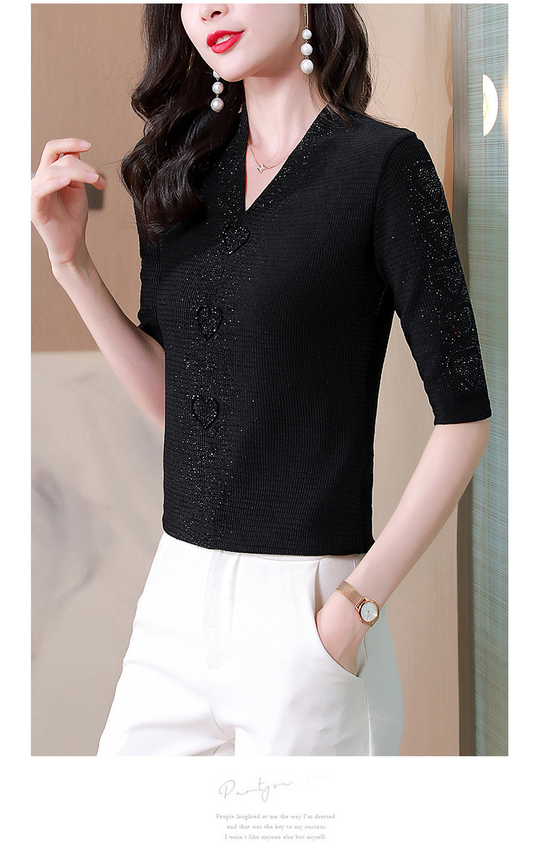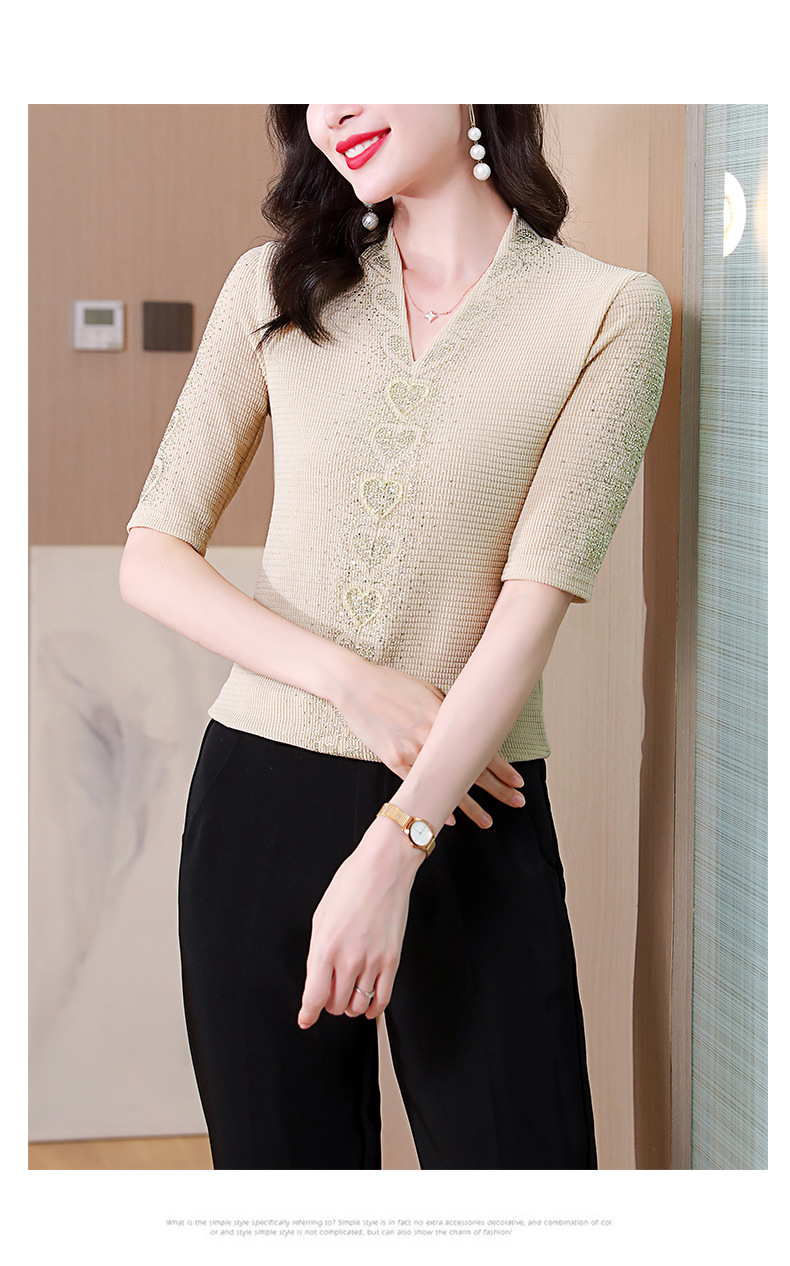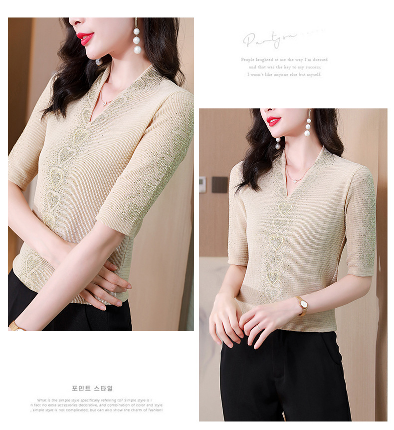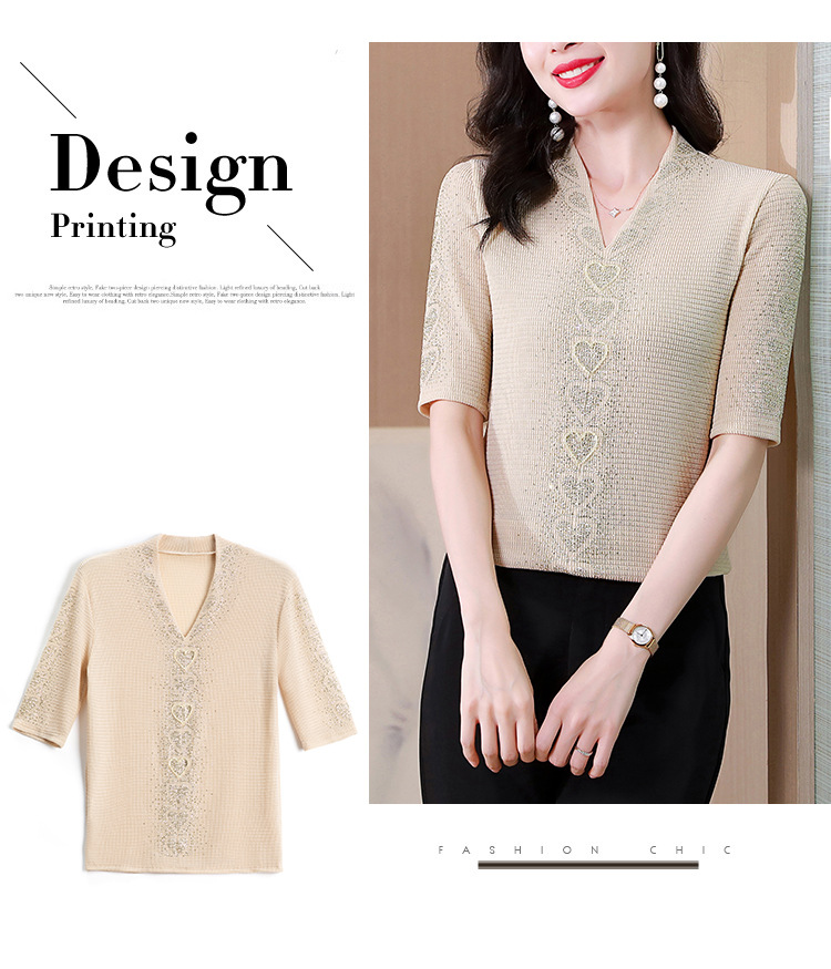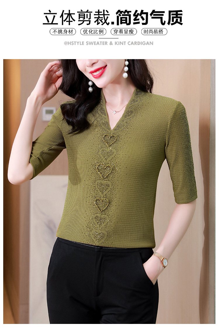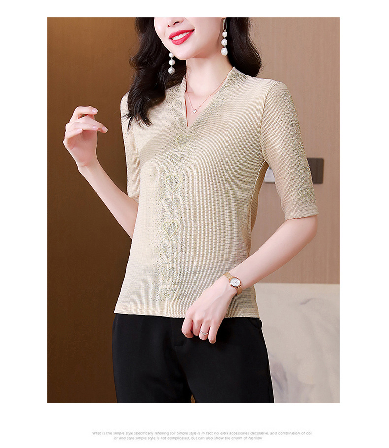 V领心型烫钻短袖T恤修身洋气显瘦打底小衫KQL-D46M9983
