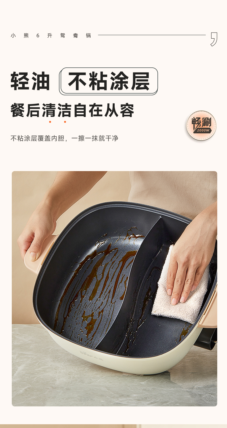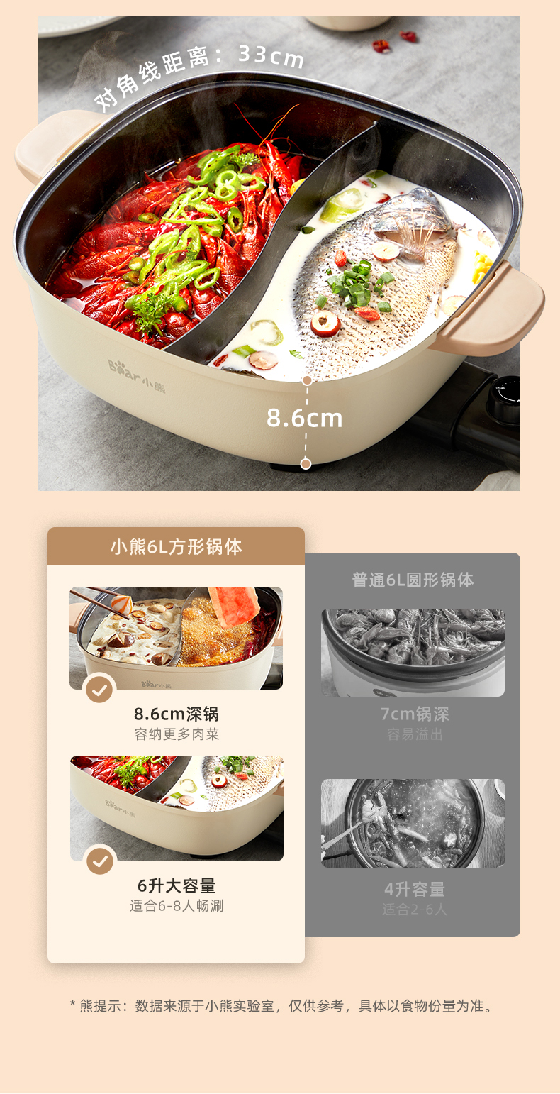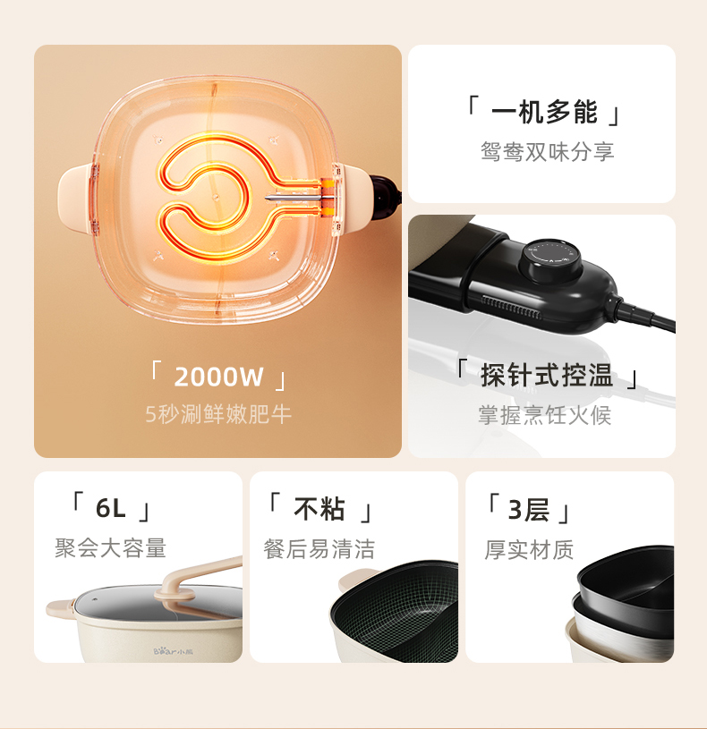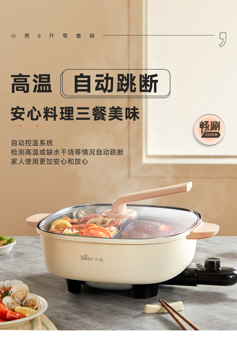 【小程序】小熊(Bear)鸳鸯锅 电火锅 多用途锅 电煮锅 多功能锅一体家用电热锅料理涮肉锅火锅锅具 米白色鸳鸯锅DHG-D60F1 6L