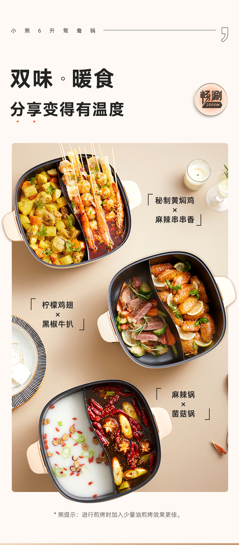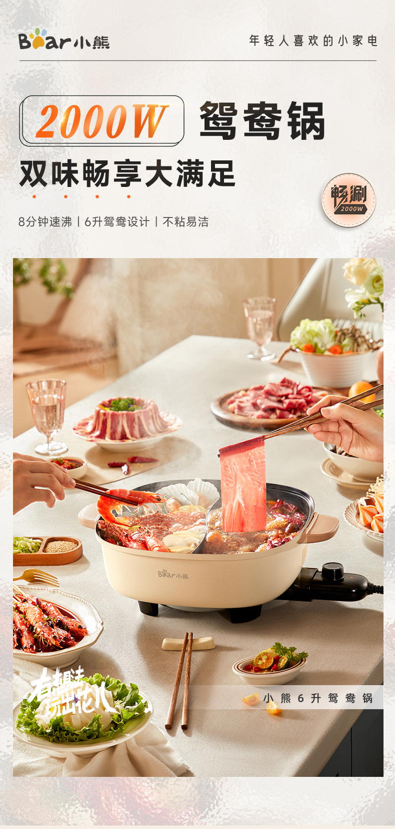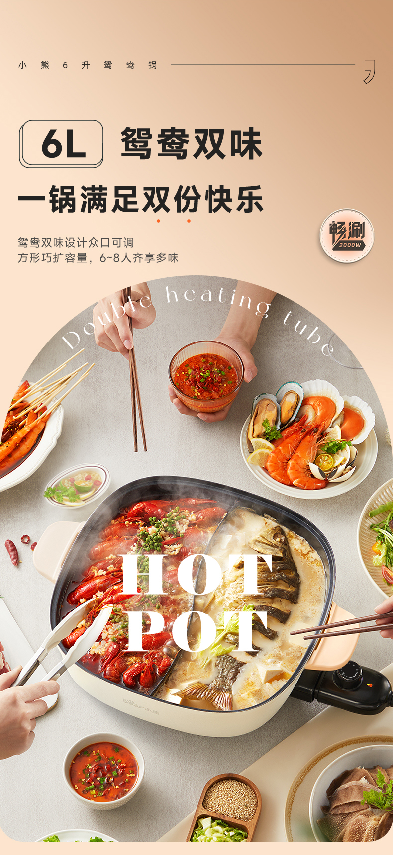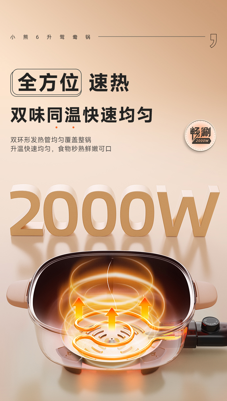 【小程序】小熊(Bear)鸳鸯锅 电火锅 多用途锅 电煮锅 多功能锅一体家用电热锅料理涮肉锅火锅锅具 米白色鸳鸯锅DHG-D60F1 6L