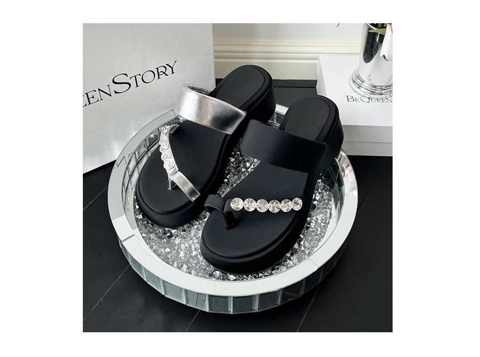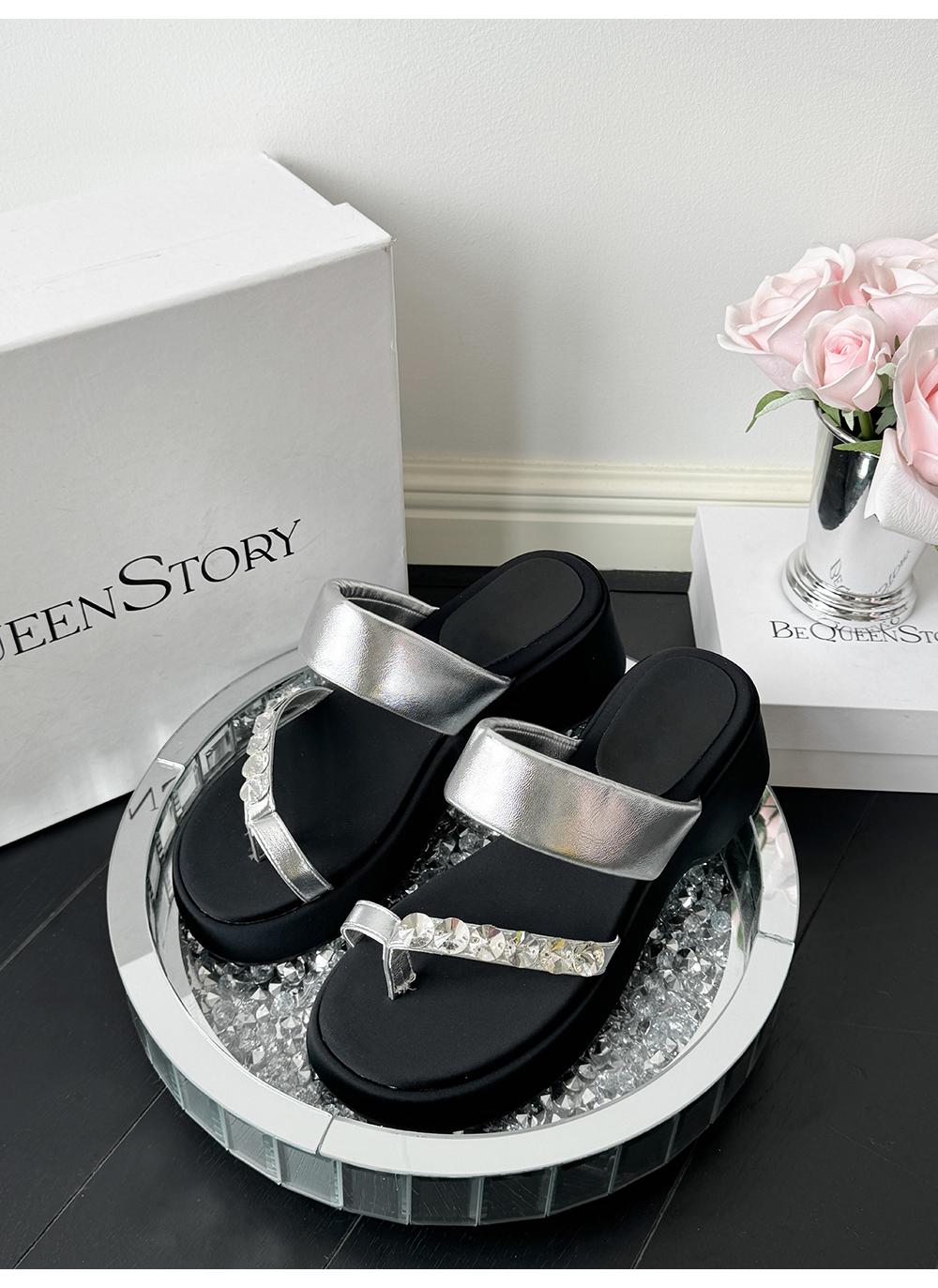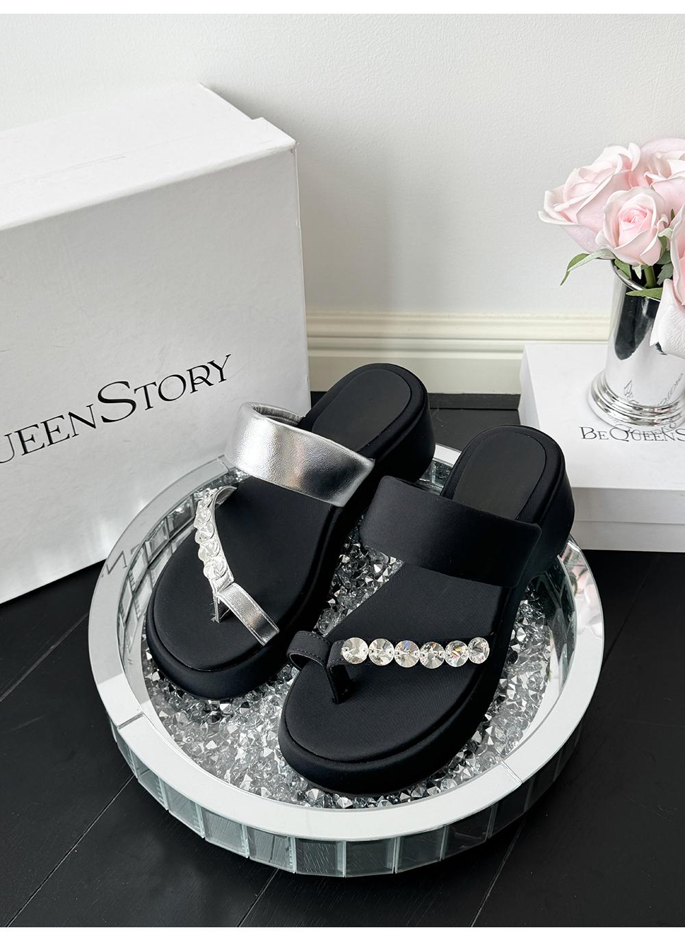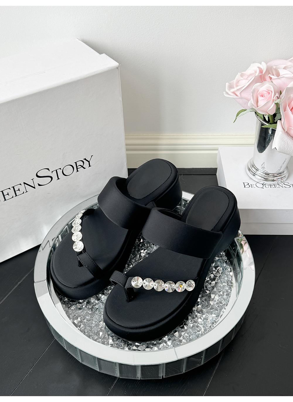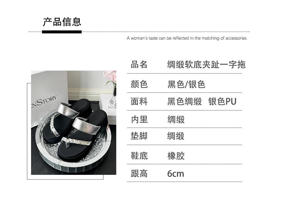 BeQueenStory配饰 黑色绸缎轻便凉拖鞋时尚增高软底夹趾一字拖