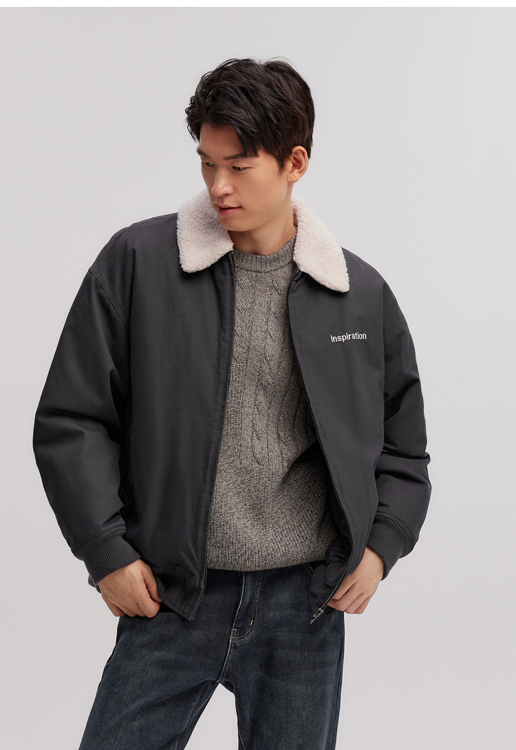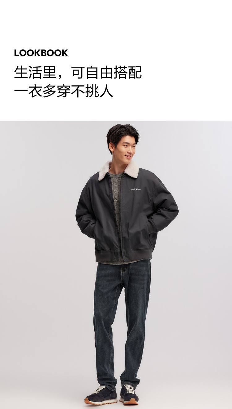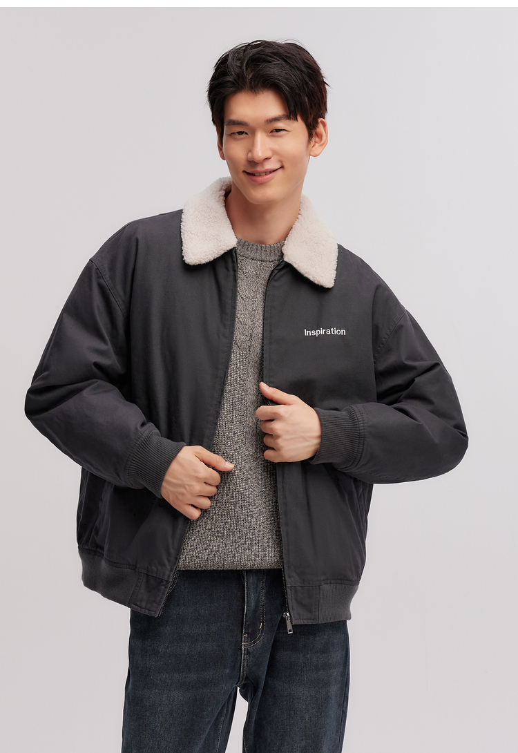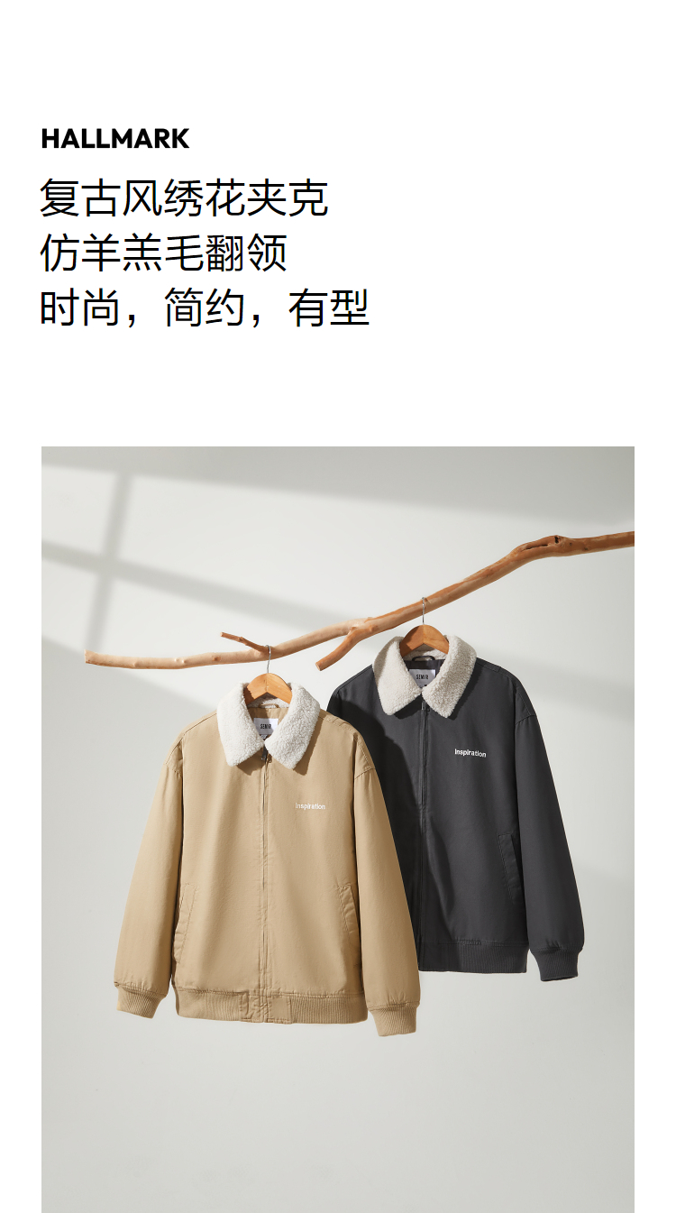 森马夹克男冬季新款复古拼接仿羊羔毛翻领外套宽松绣花棉服潮