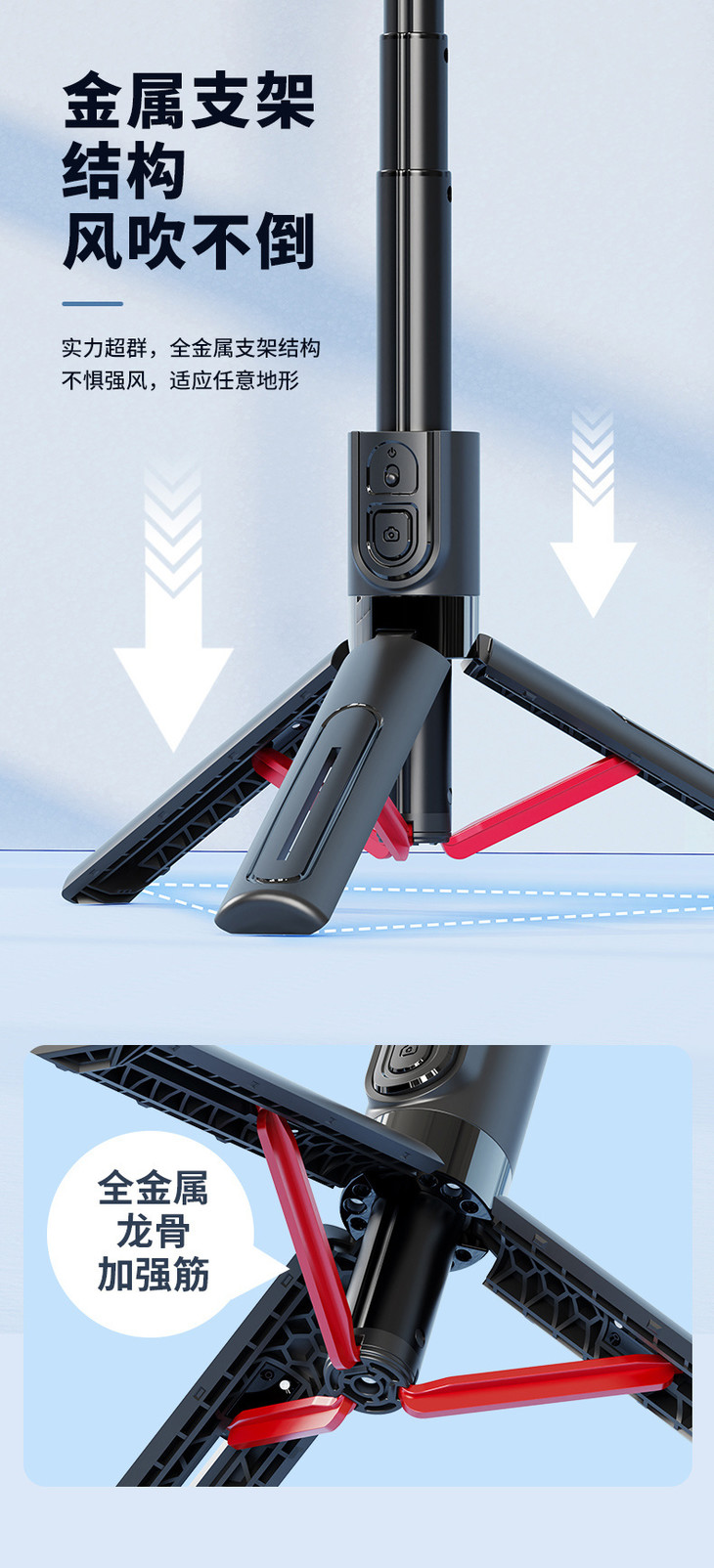 🔹全金属龙骨加强筋,像雨伞撑开时那样具备[牵扯力] 撑-收简单 反复上千次也牢固如初 可以适应任何地形支撑摆放,不怕陡不惧风,更坚实 普通的自拍杆脚架底部只是三片可以撑开的“香蕉片”,裂掉一片就不再具备落地功能了