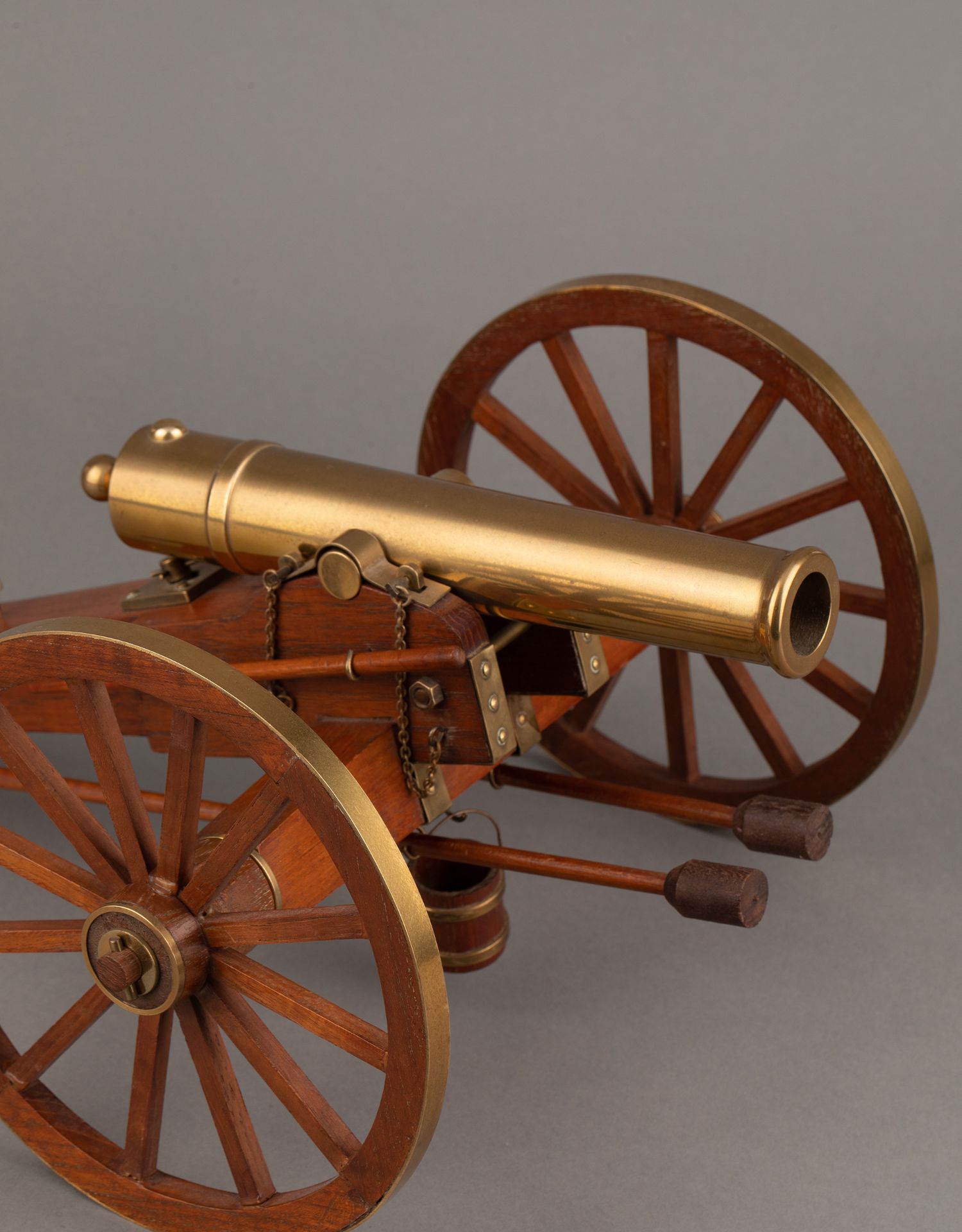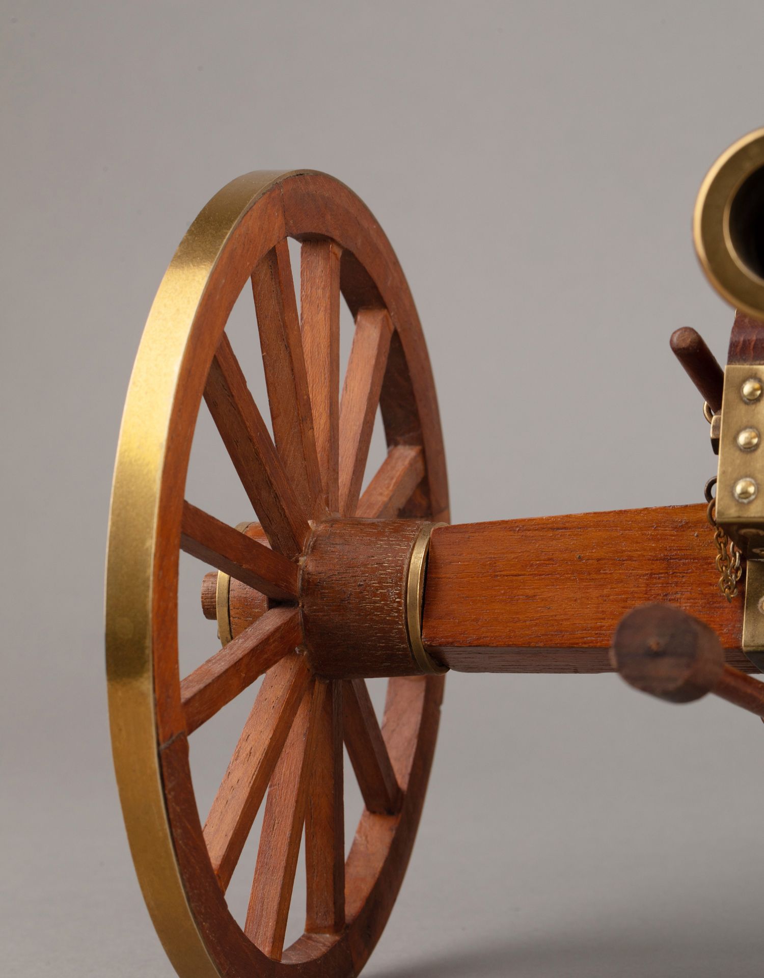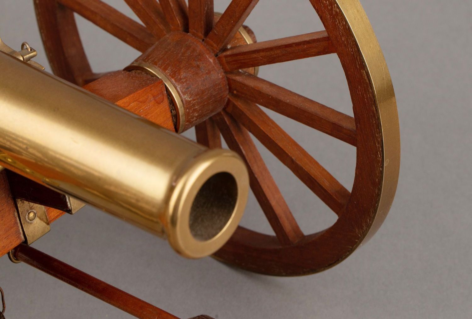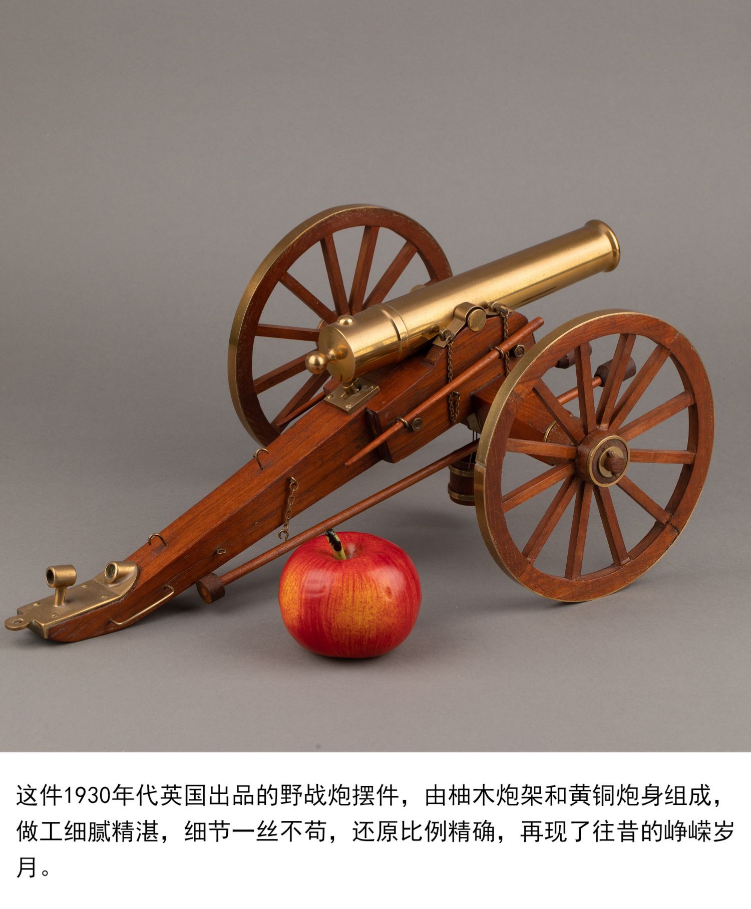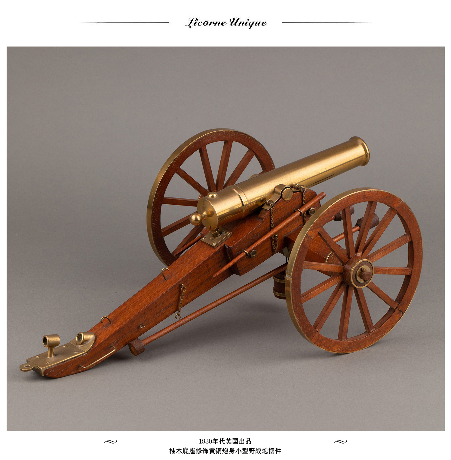 独角鹿西洋古董1930年代英国柚木底座修饰黄铜炮身小型野战炮摆件