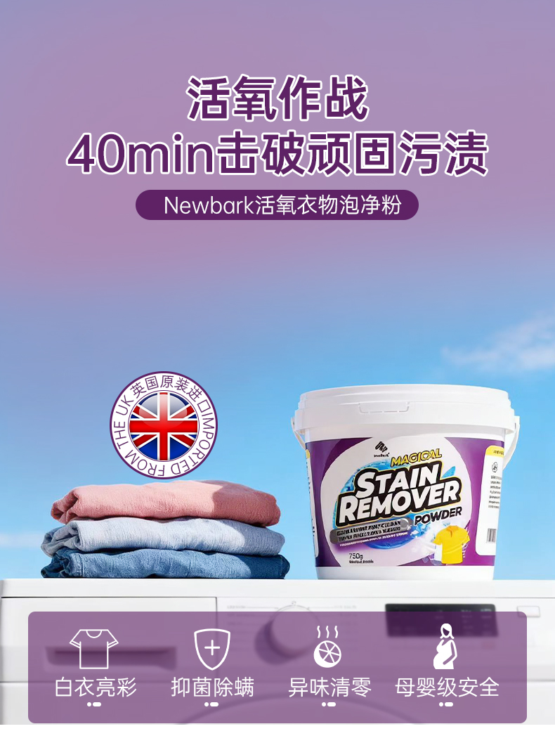 买1送1【Newbark 活氧衣物泡净粉】英国原装进口 活氧搭配六重复合酶+表活 高效清洁衣物 去黄去渍增白护色 40min泡净 省心省力 温和成分 母婴可用 750g/瓶