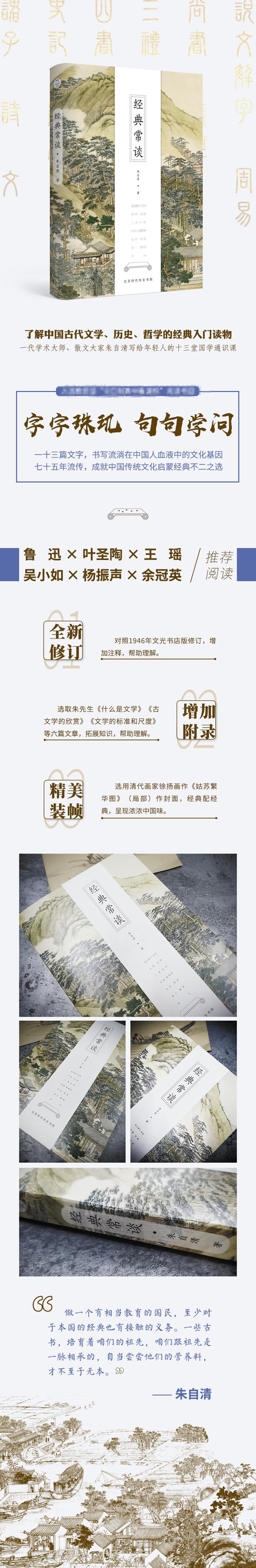 《经典常谈》写于1942年,是朱自清先生介绍中国古代文学、历史、哲学经典的启蒙读物,内容按照历史发展的脉络,梳理了包括《说文解字》《周易》《尚书》《诗经》《三礼》《春秋三传》《四书》《战国策》《史记》《汉书》、诸子、诗、文等经典内容,全书见解精辟,文笔优美,通俗流畅,深入浅出,是读者了解中国古代文化典籍的经典指南,也是国学入门书。
