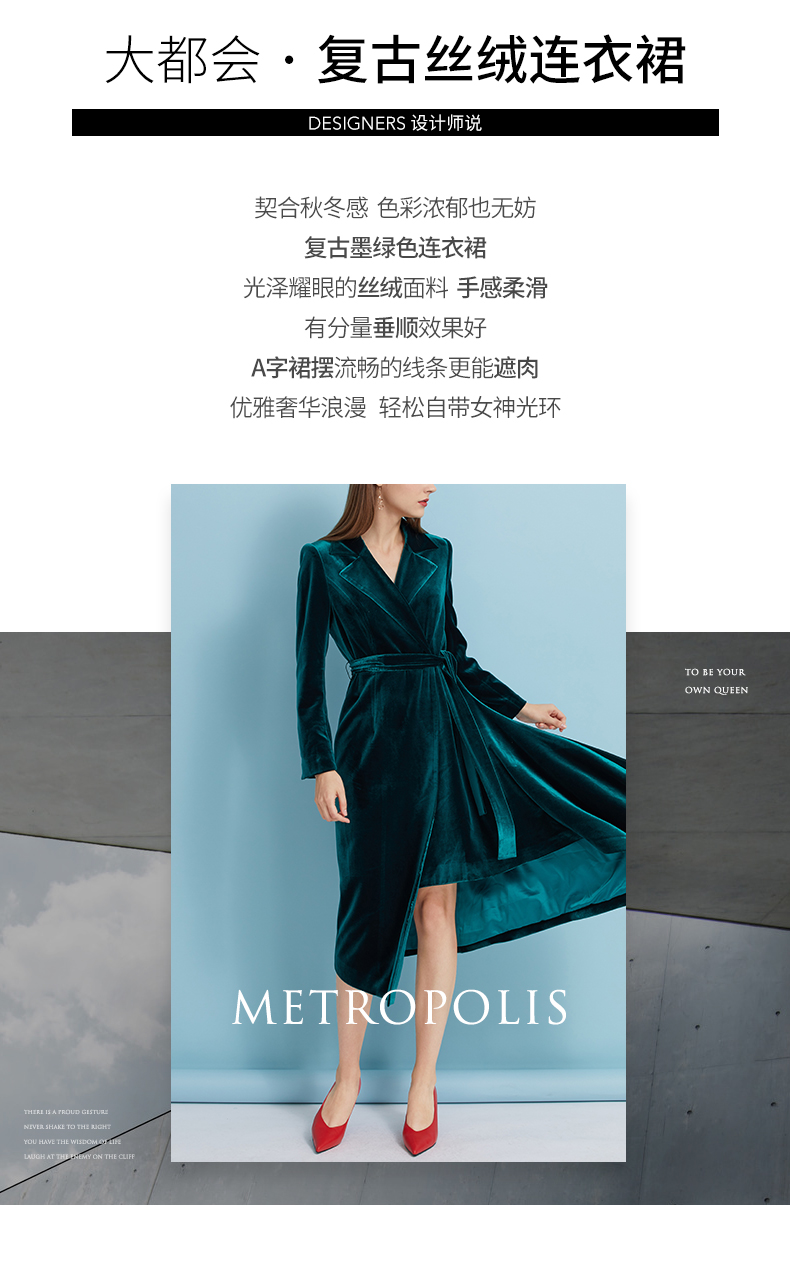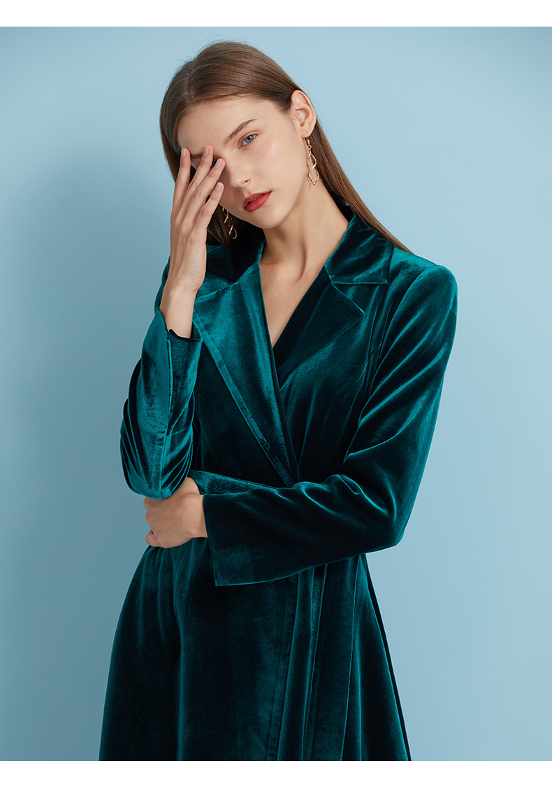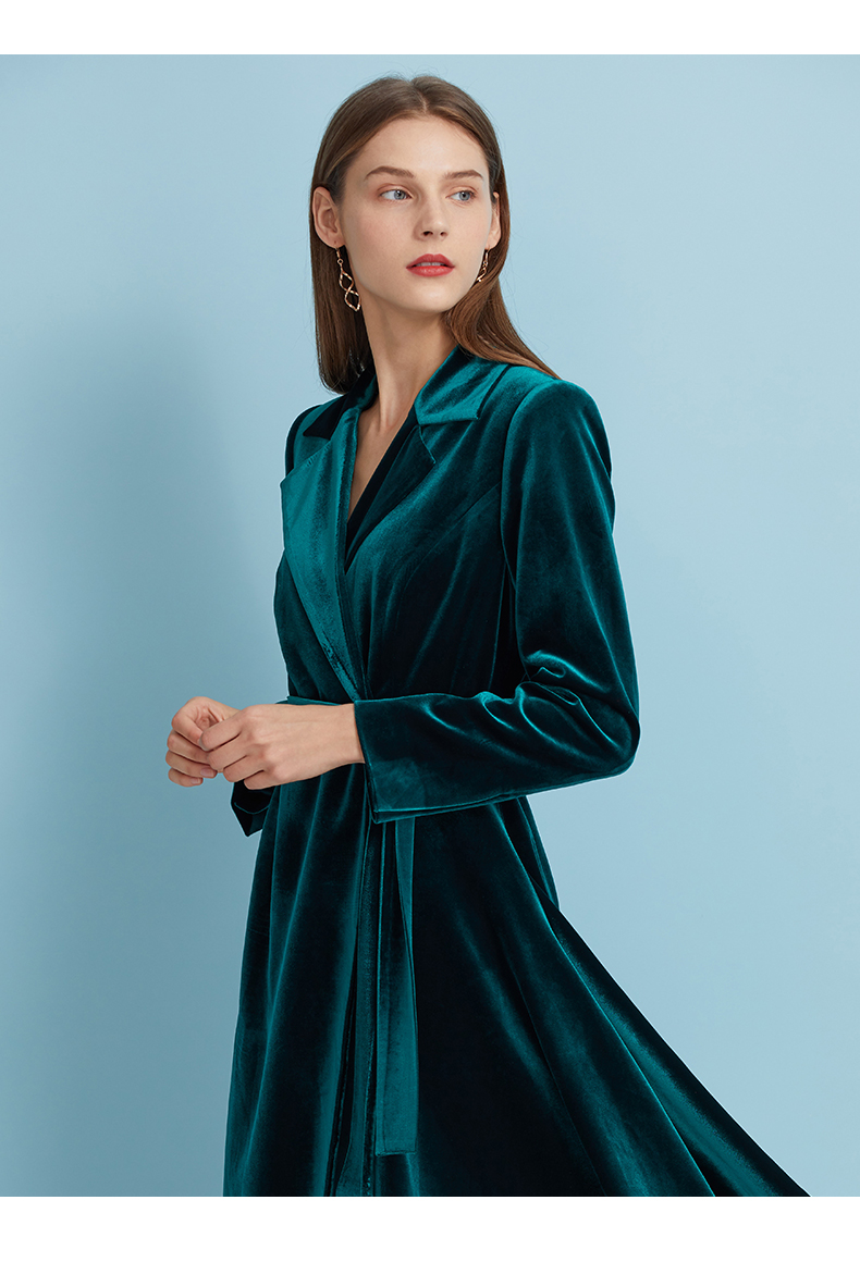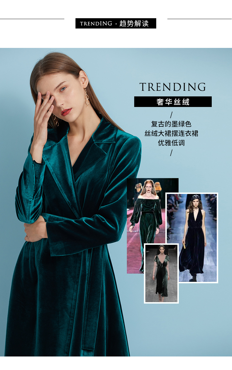 IWY/秋冬新款裙子女复古丝绒连衣裙墨绿色长裙系带a字裙收腰显瘦194002Q1