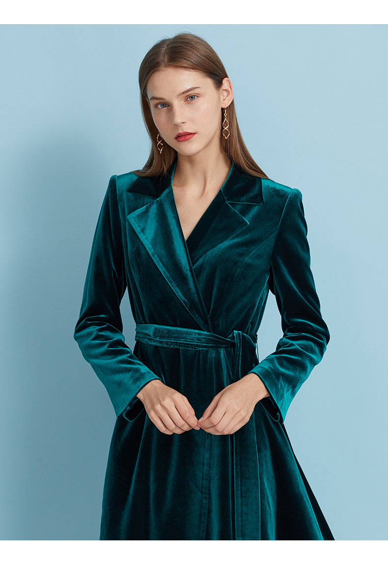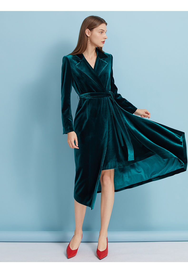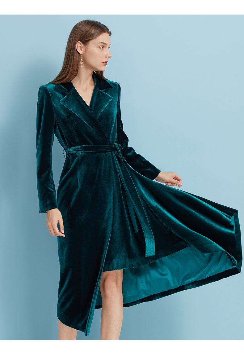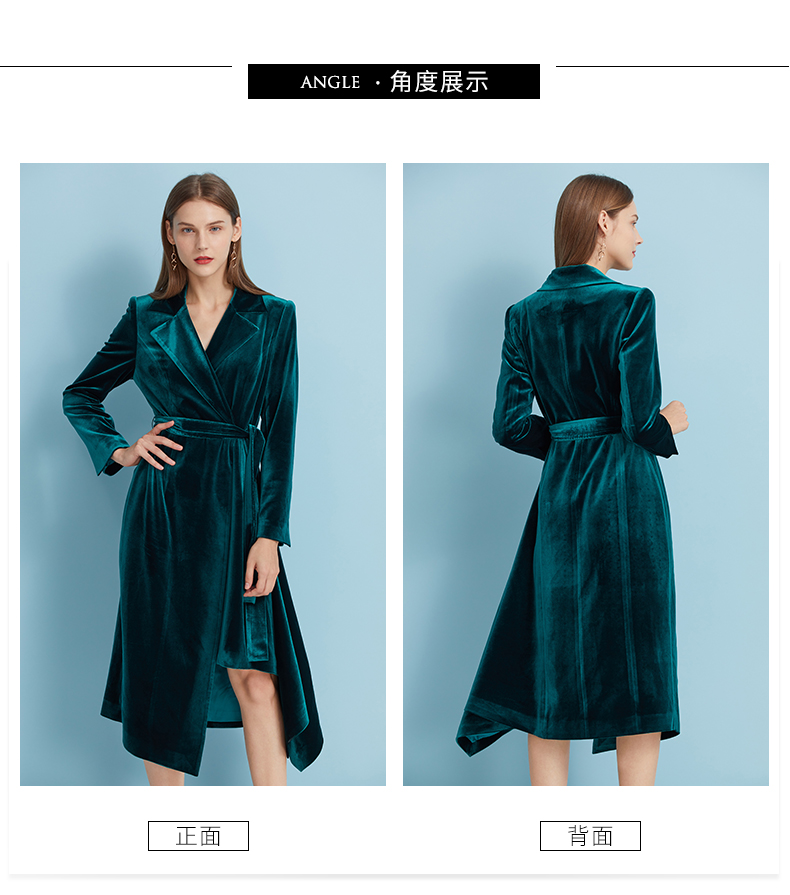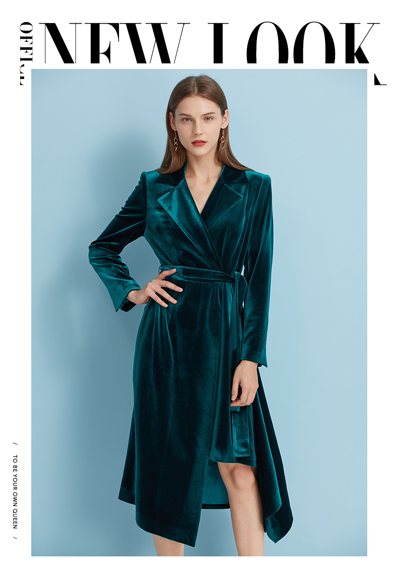 IWY/秋冬新款裙子女复古丝绒连衣裙墨绿色长裙系带a字裙收腰显瘦194002Q1