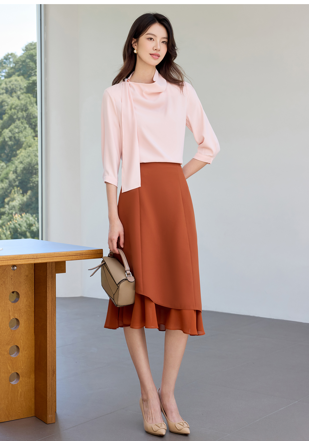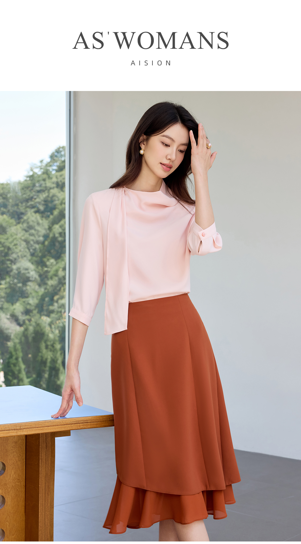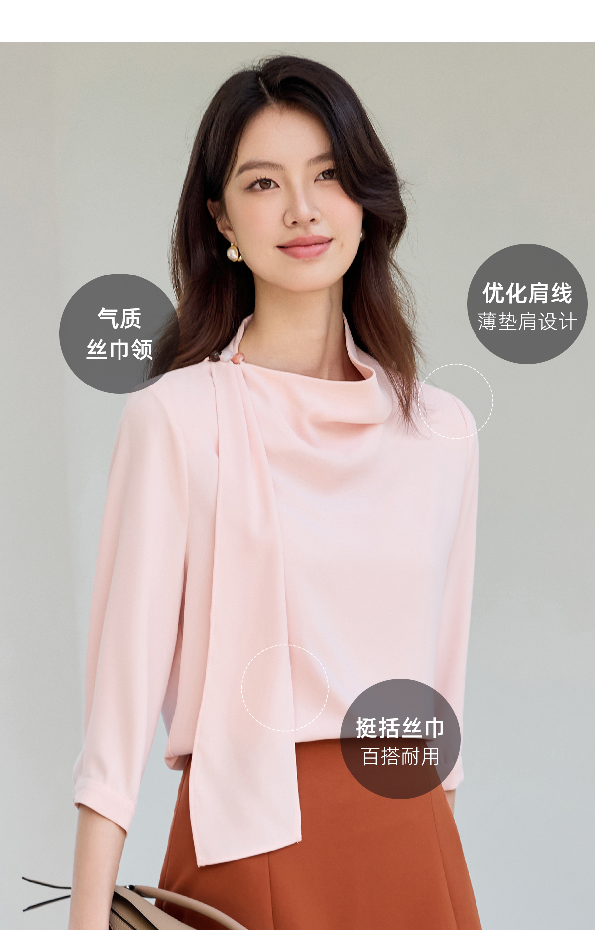 IWY/桃雾星澜粉色温柔风通勤飘带七分袖衬衫半裙套装女25B749+25S777