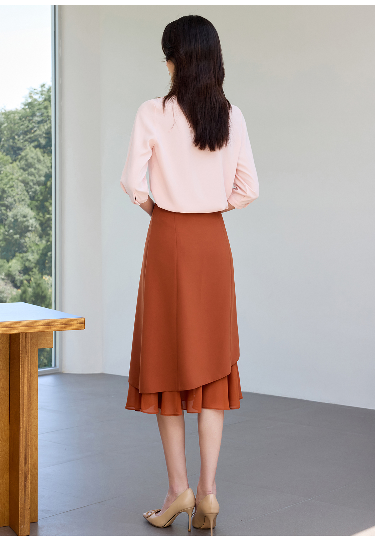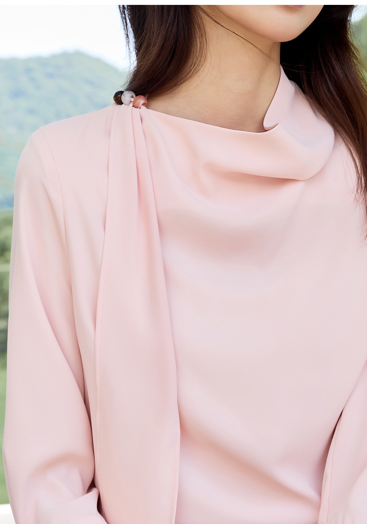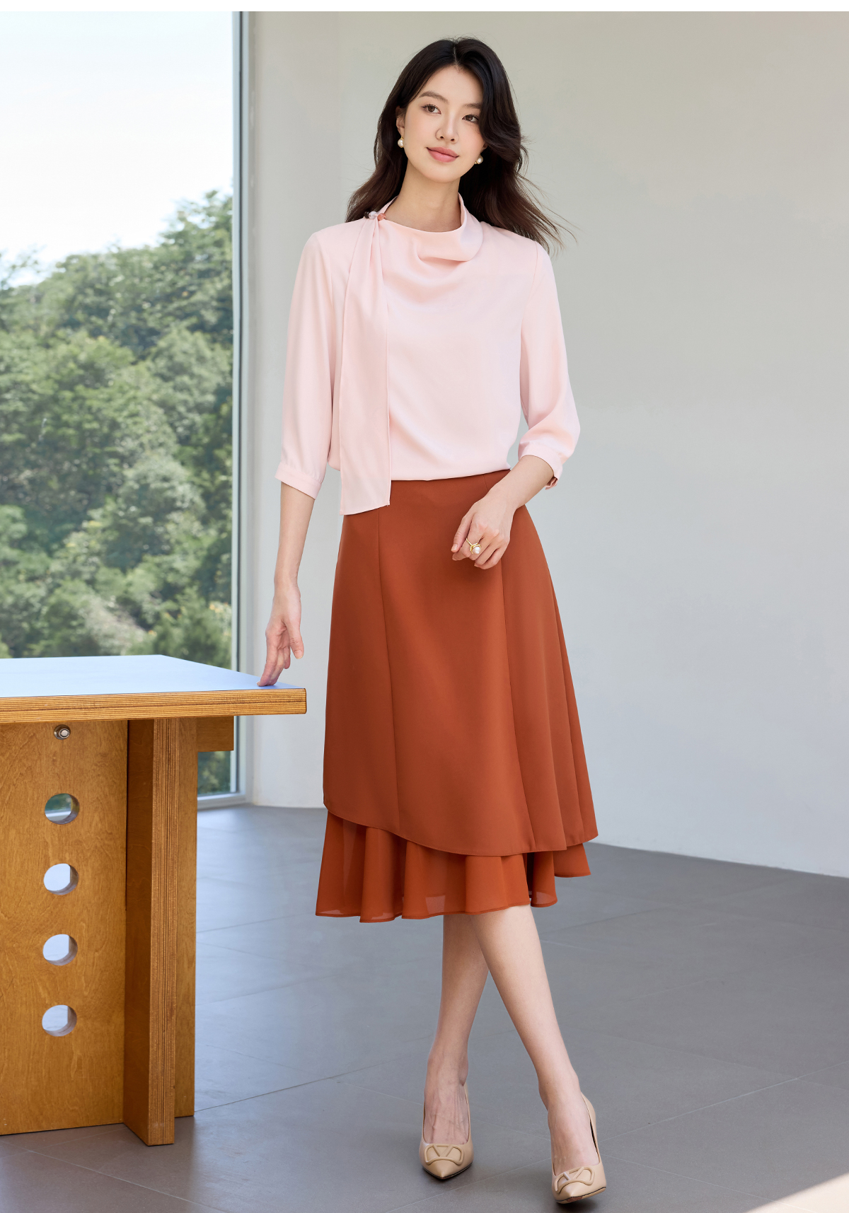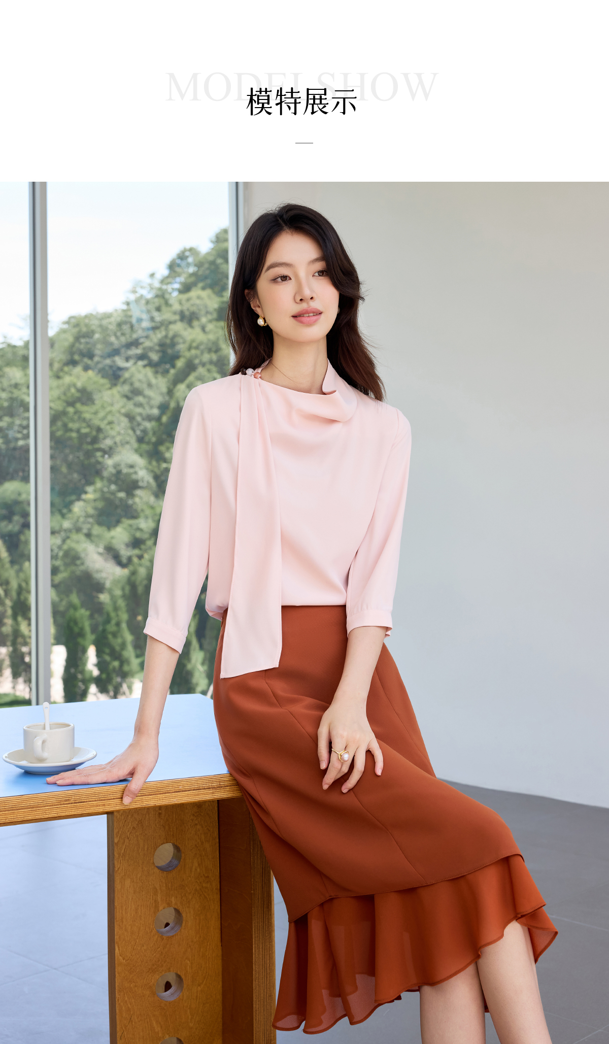 IWY/桃雾星澜粉色温柔风通勤飘带七分袖衬衫半裙套装女25B749+25S777