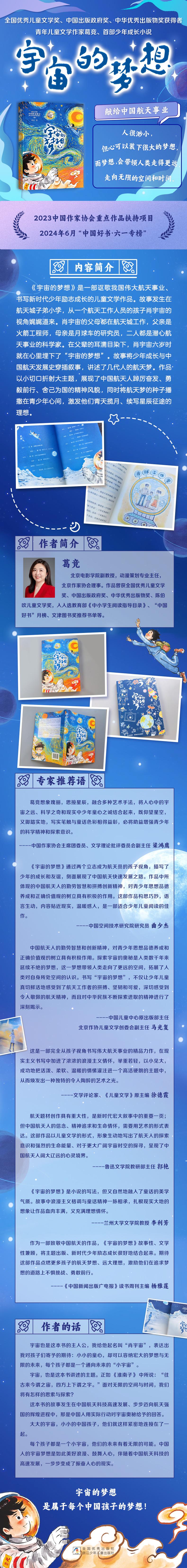 《宇宙的梦想》是一部讴歌我国伟大航空航天事业、书写新时代少年励志成长的儿童文学作品。小说将故事背景设置为航天城子弟小学,从一个航天工作人员的孩子肖宇宙的视角娓娓道来。肖宇宙的父亲是火箭工程师,母亲是月球车的研究员,二人都是潜心研究的科学家。在父辈的耳濡目染下,肖宇宙从四岁起就在心中种下了“宇宙的梦想”。