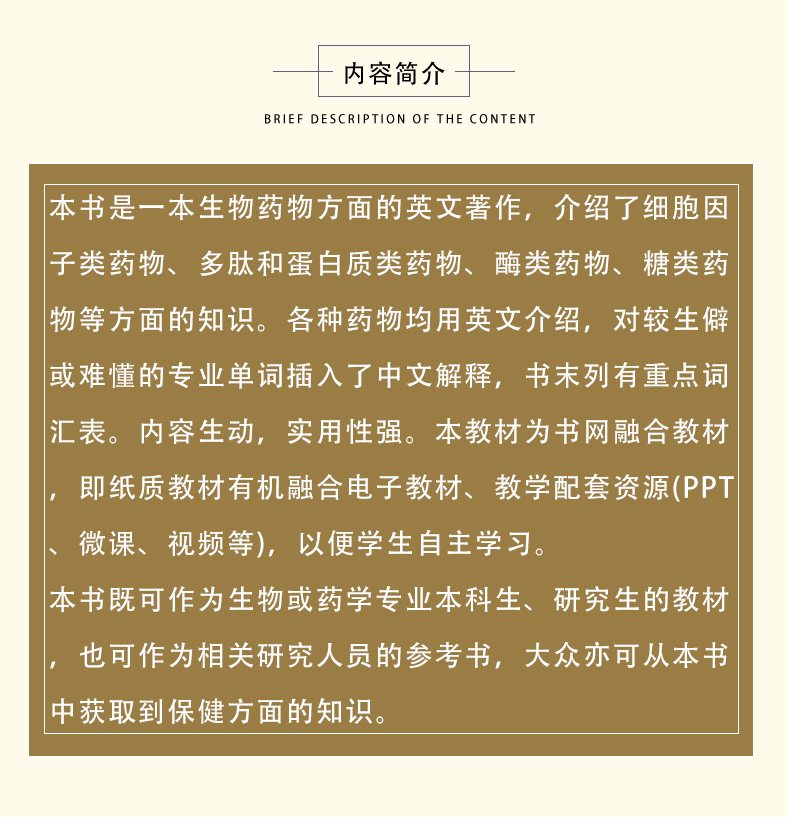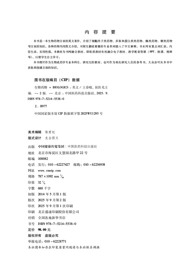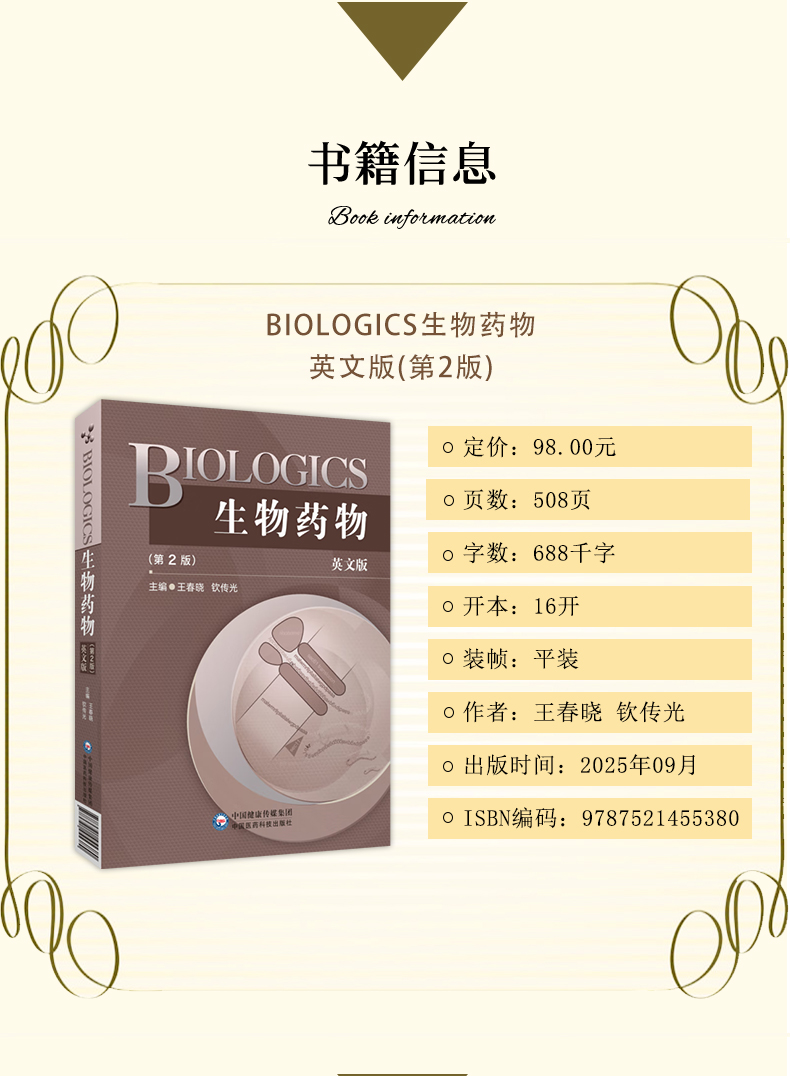 生物药物 BIOLOGICS 英文版 第2二版 王春晓 钦传光 英文细胞因子类药物多肽蛋白质类药物等方面单词中文解释 中国医药科技出版社