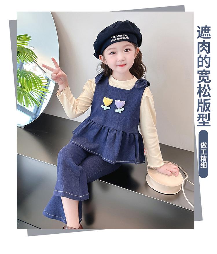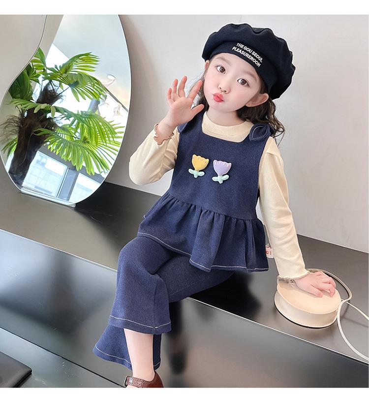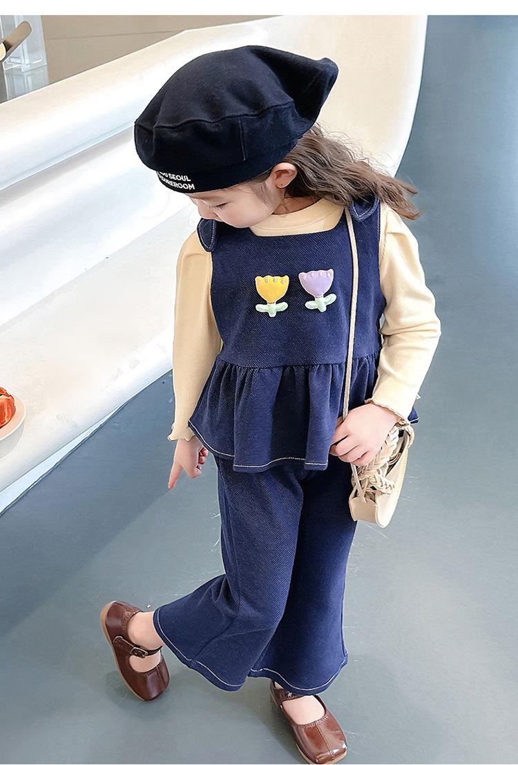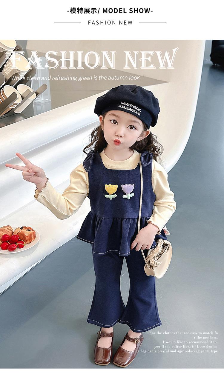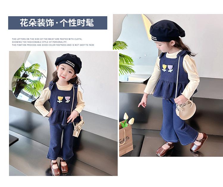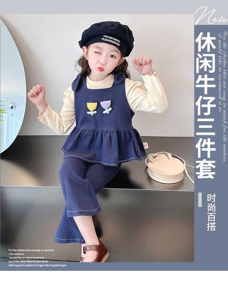 女童花朵牛仔三件套2024春季新款韩版微喇阔腿裤套装童装