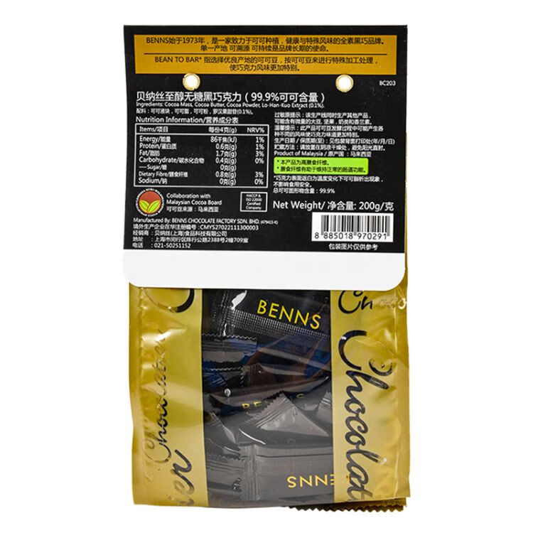 贝纳丝至醇无糖黑巧克力(99.9%可可)200g/袋