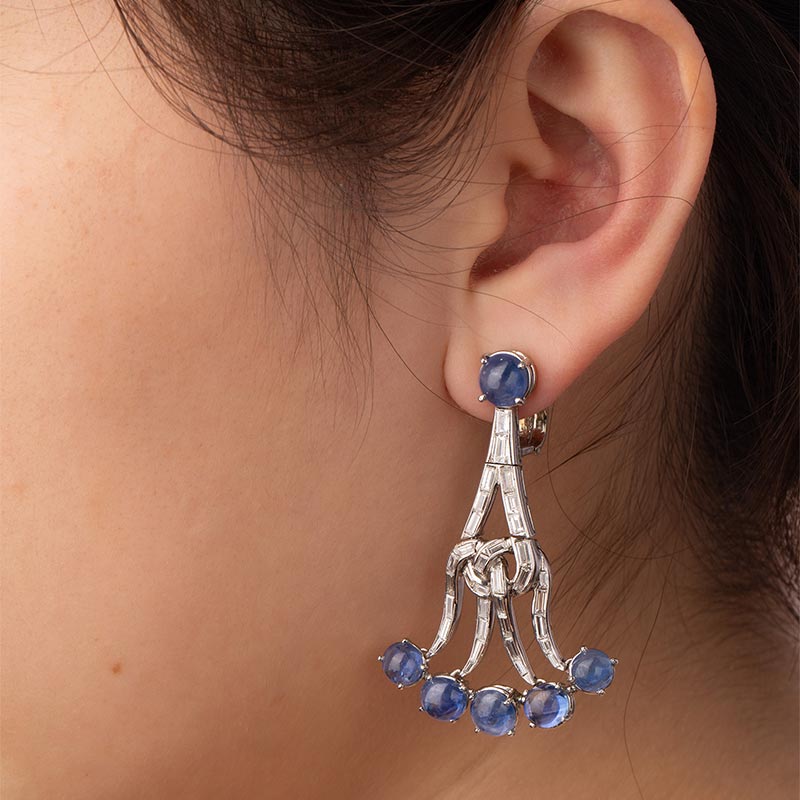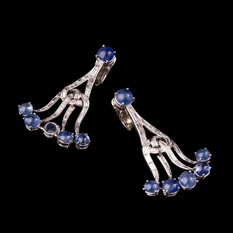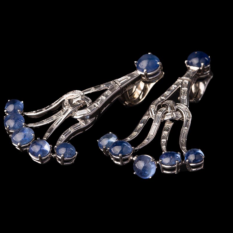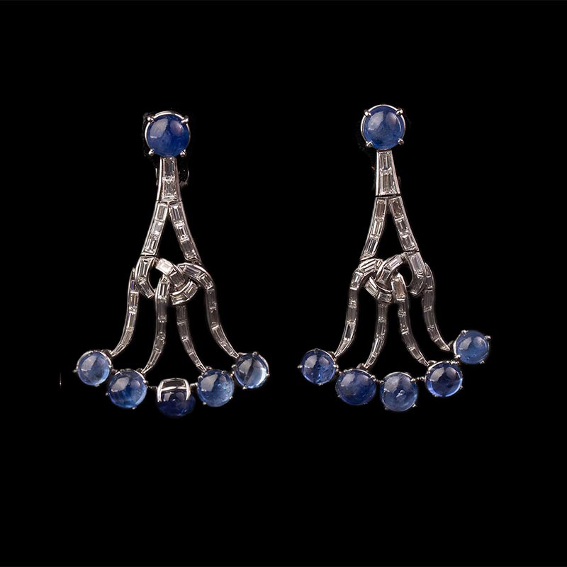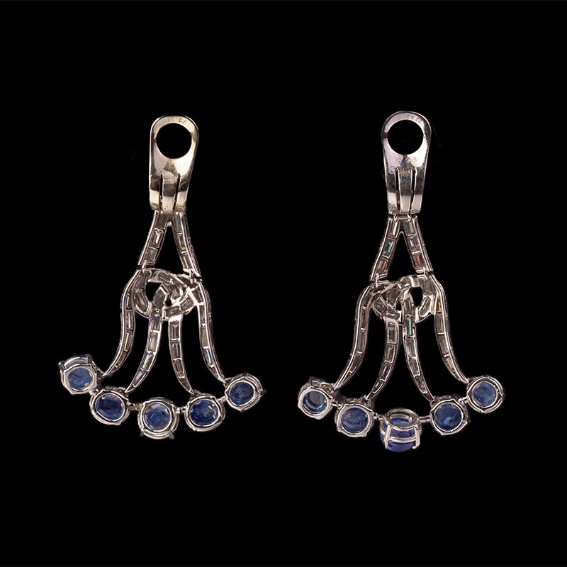 19世纪美国出品装饰艺术风格枝形吊灯造型白金镶嵌蓝宝石及钻石耳坠一对