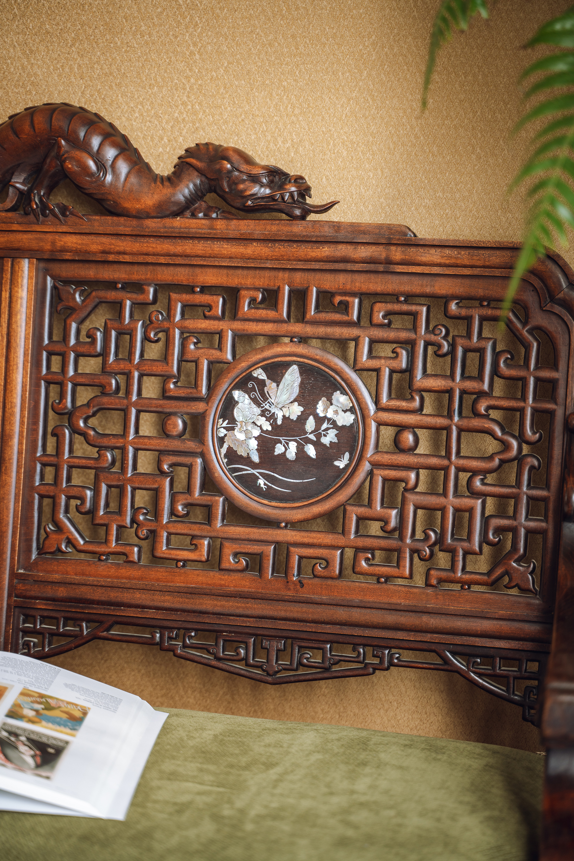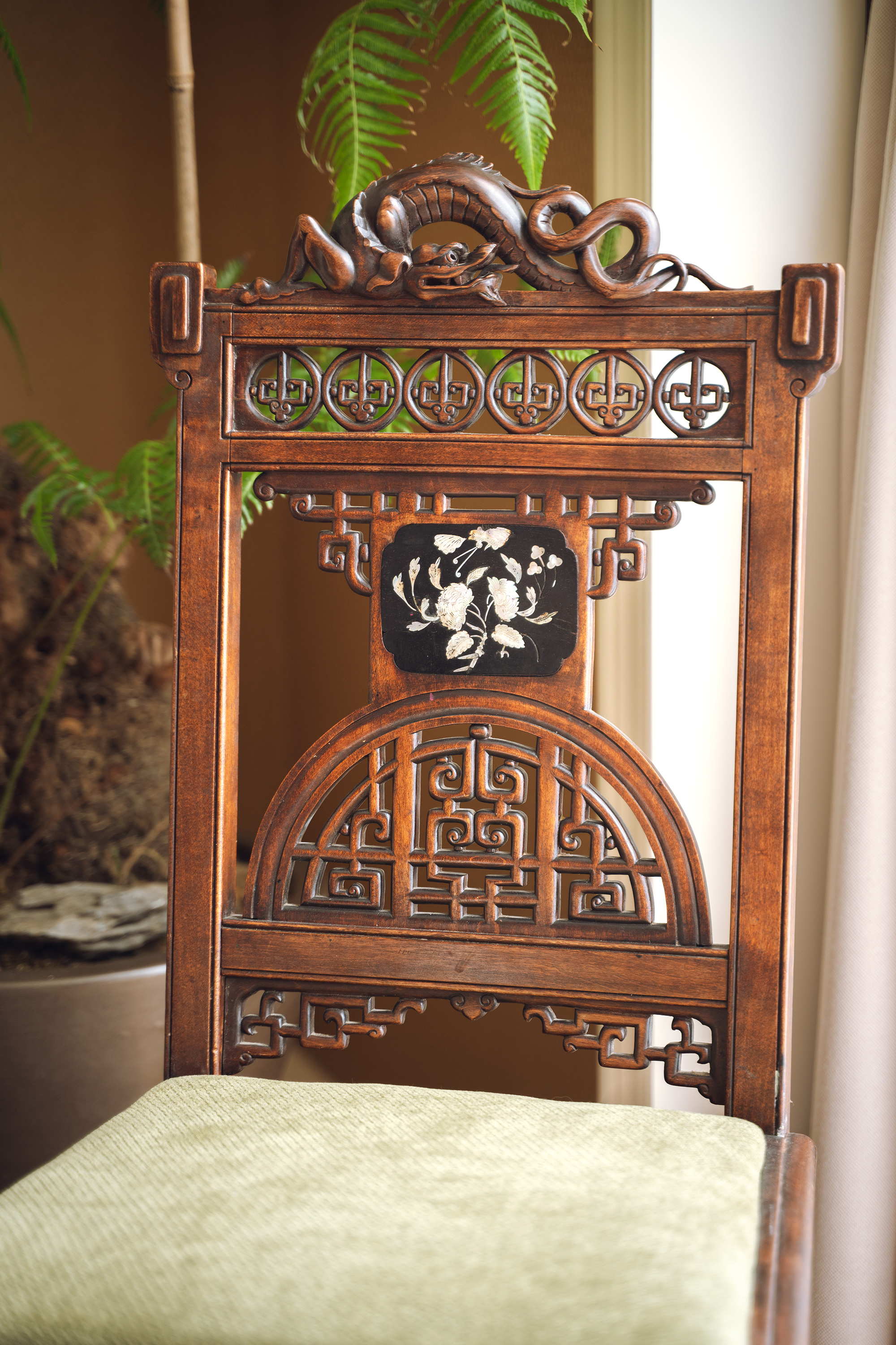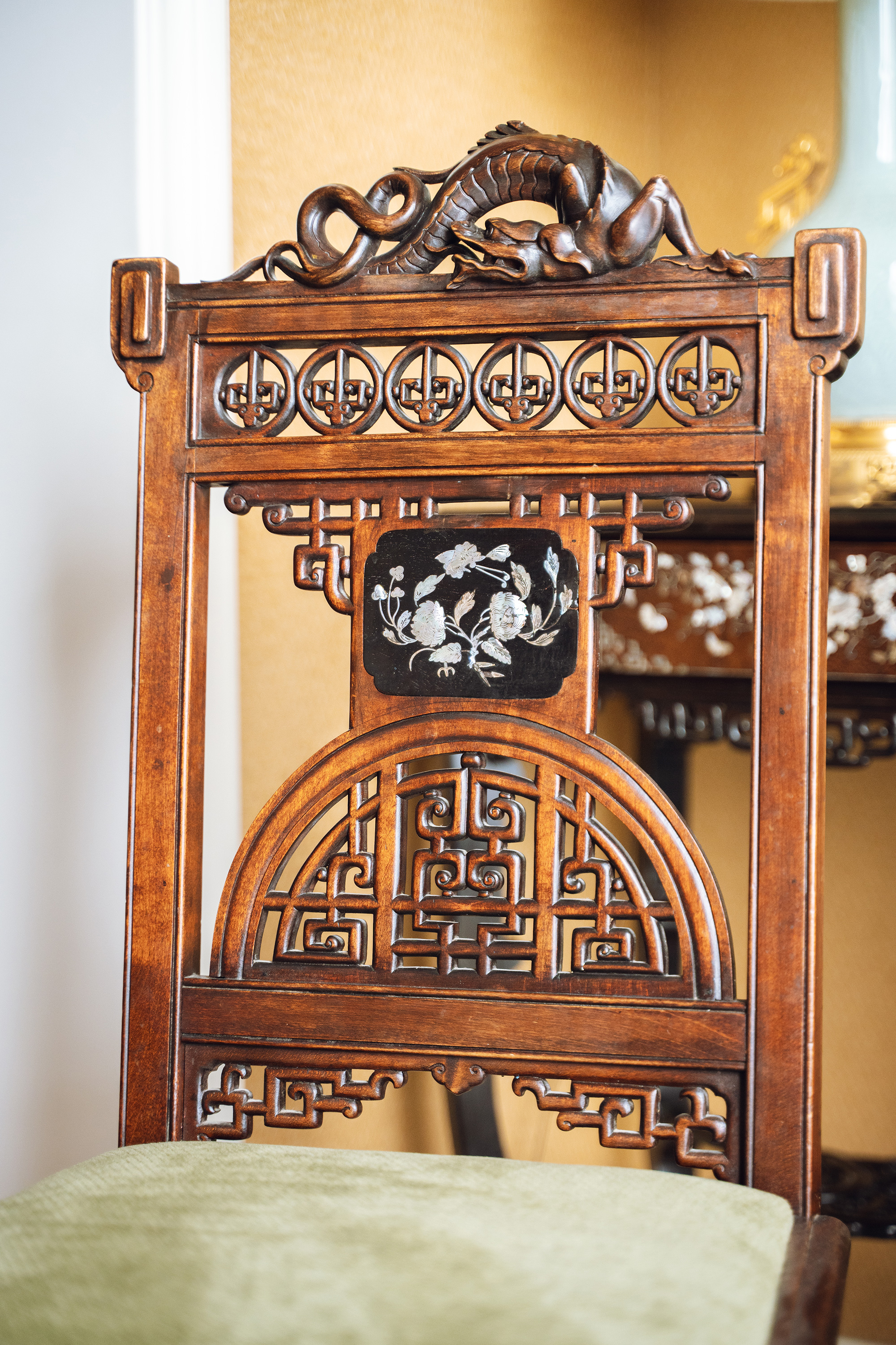 19世纪末20世纪初法国出品VIARDOT东方风格蟠龙回纹硬木精雕及镂雕装饰花叶主题螺钿镶嵌绿色绒布面沙发座椅三件套