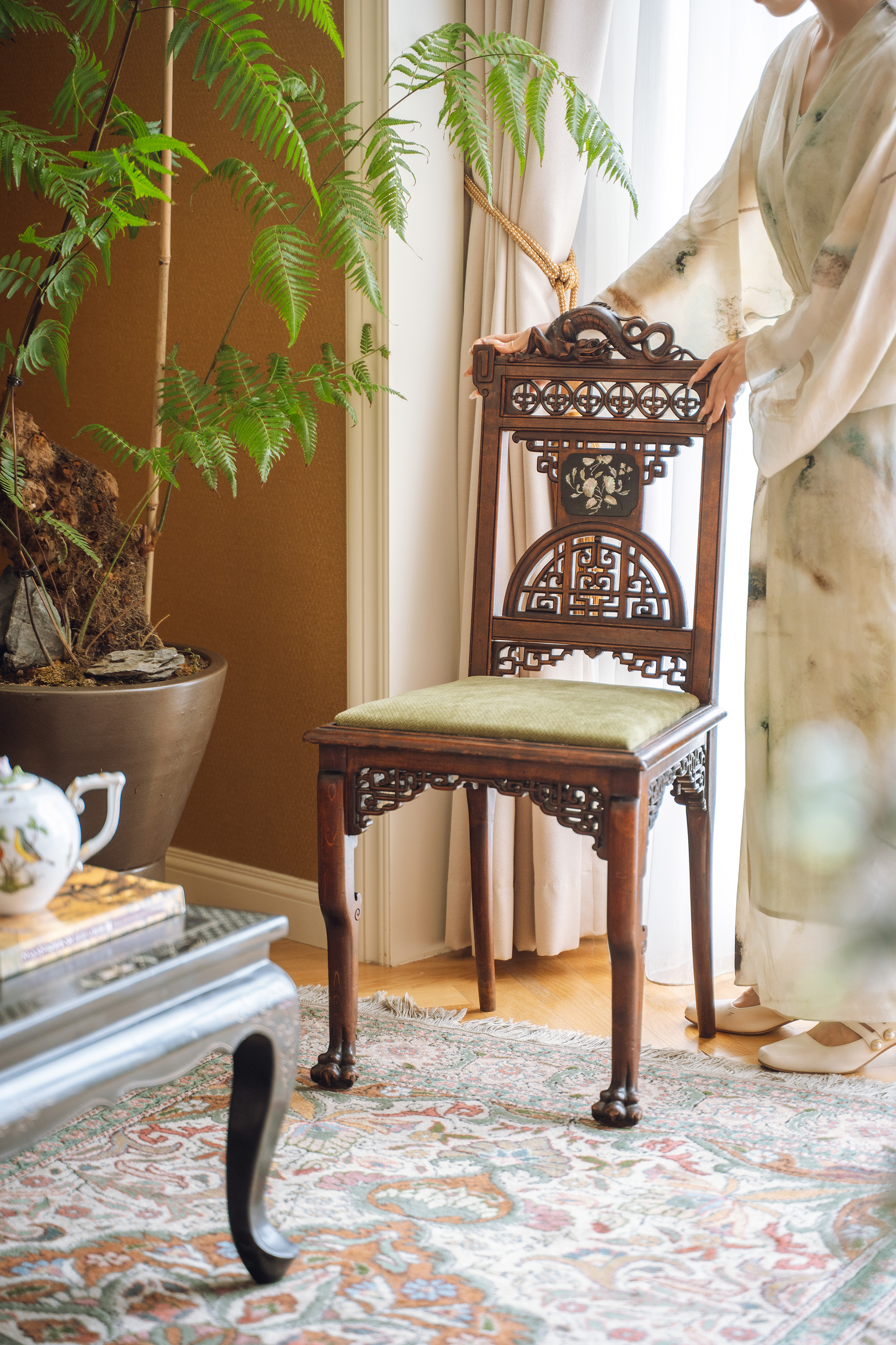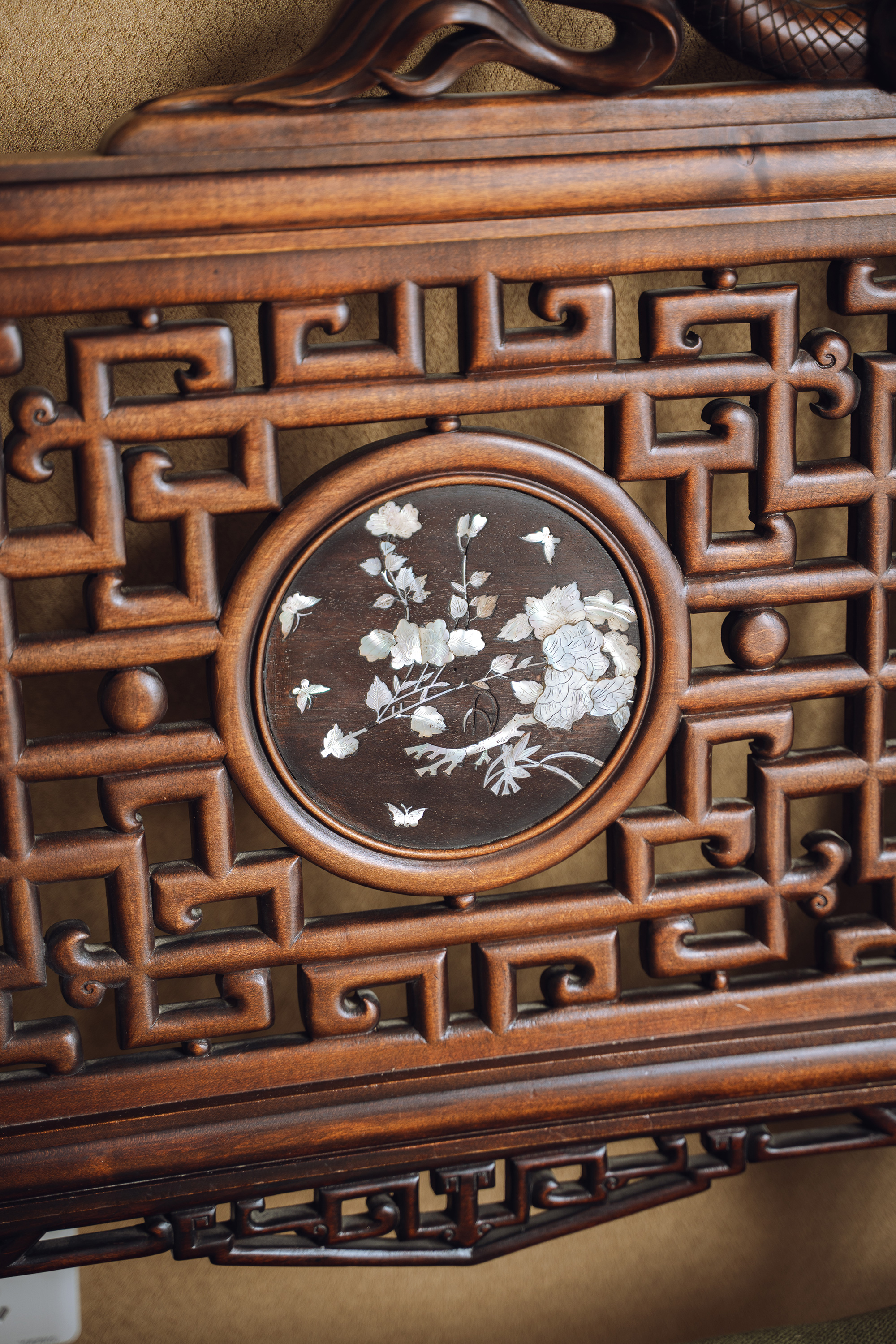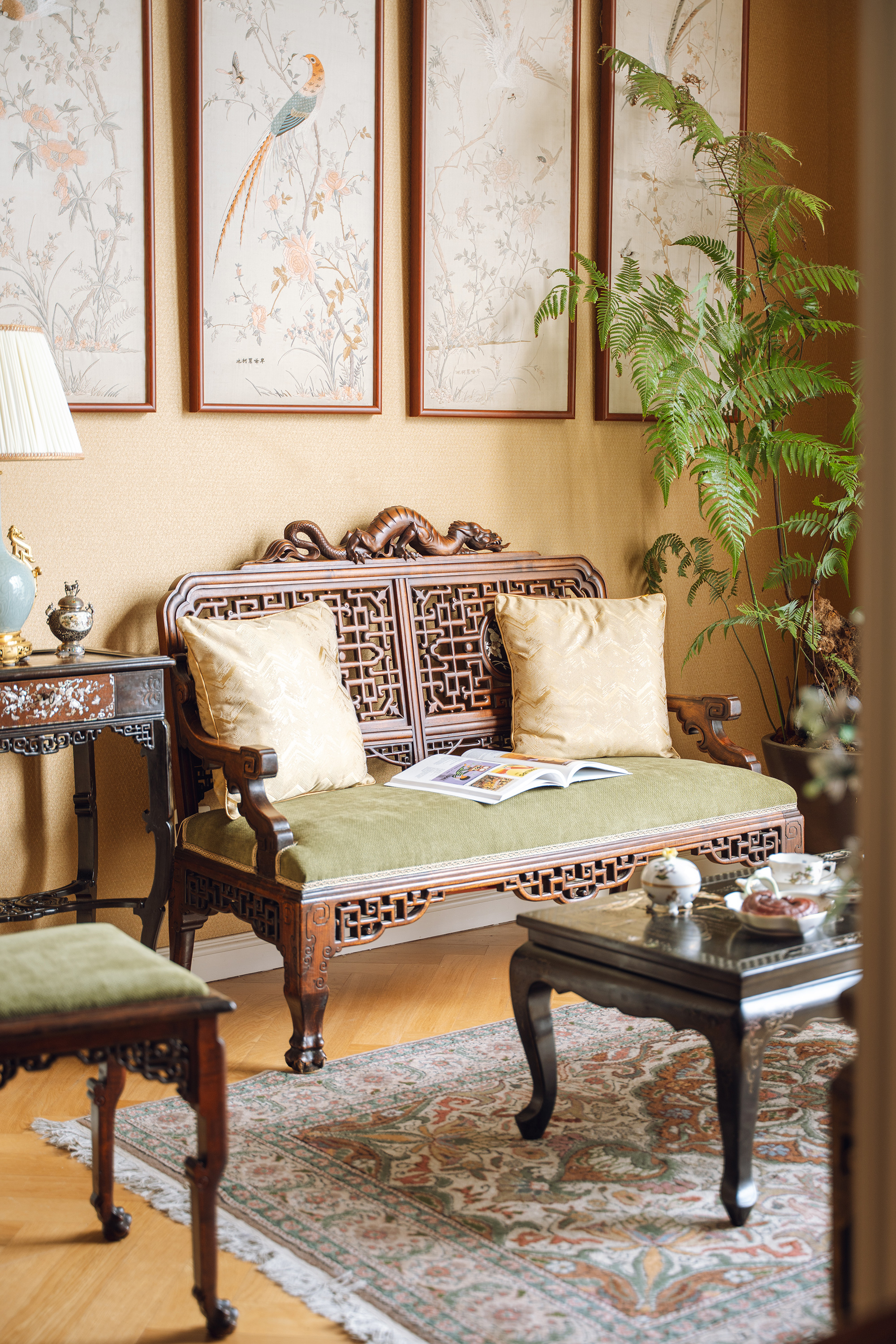 19世纪末20世纪初法国出品VIARDOT东方风格蟠龙回纹硬木精雕及镂雕装饰花叶主题螺钿镶嵌绿色绒布面沙发座椅三件套
