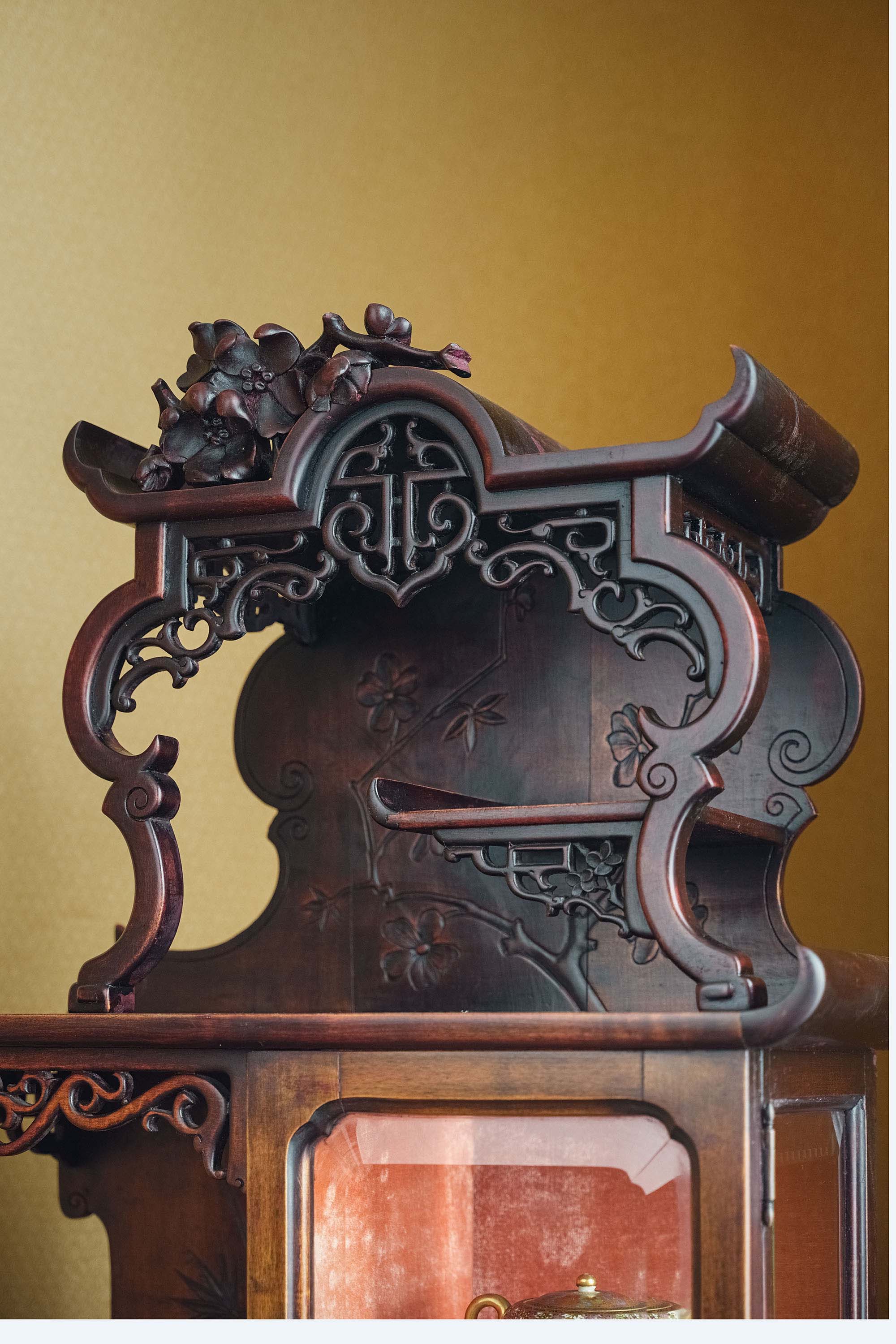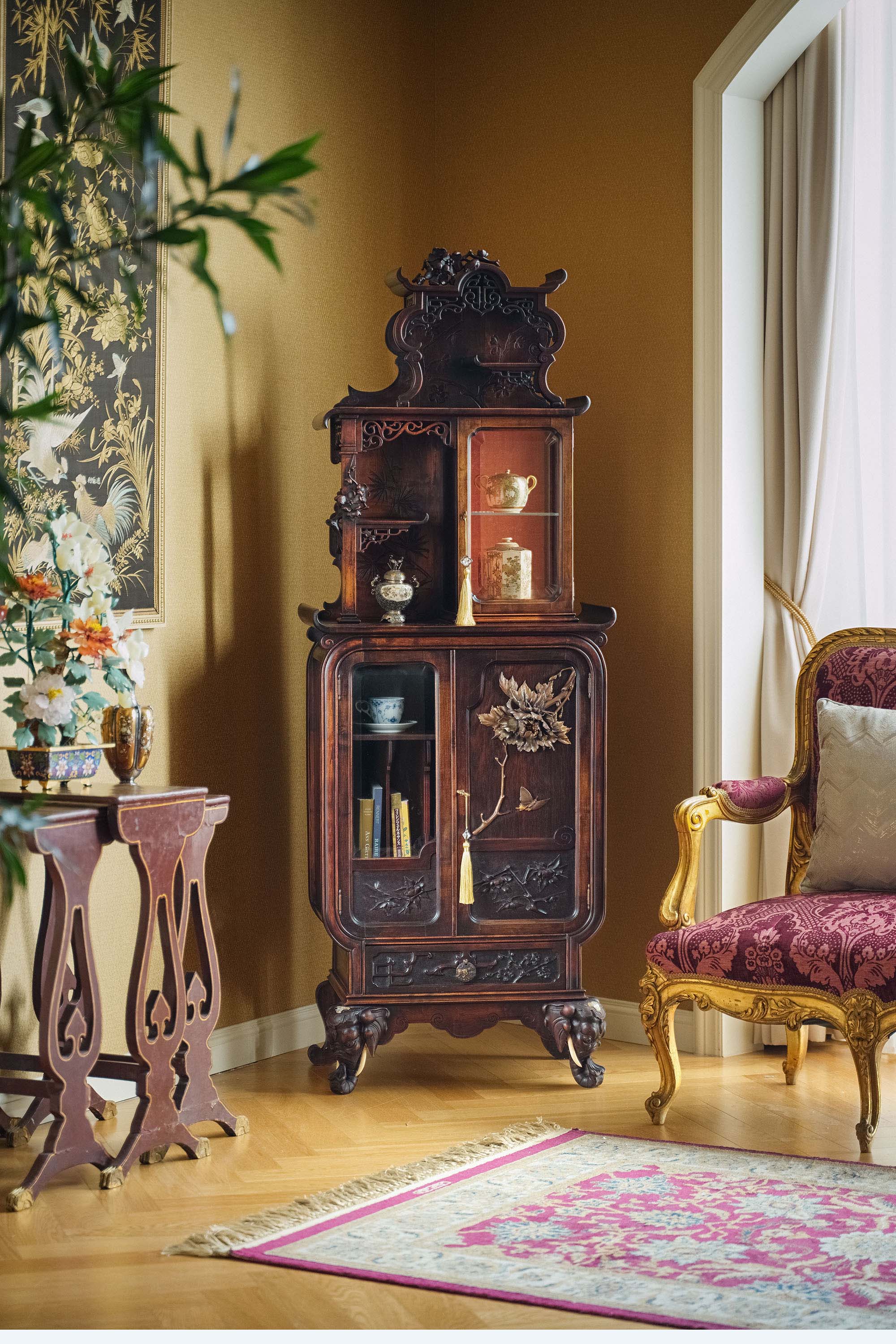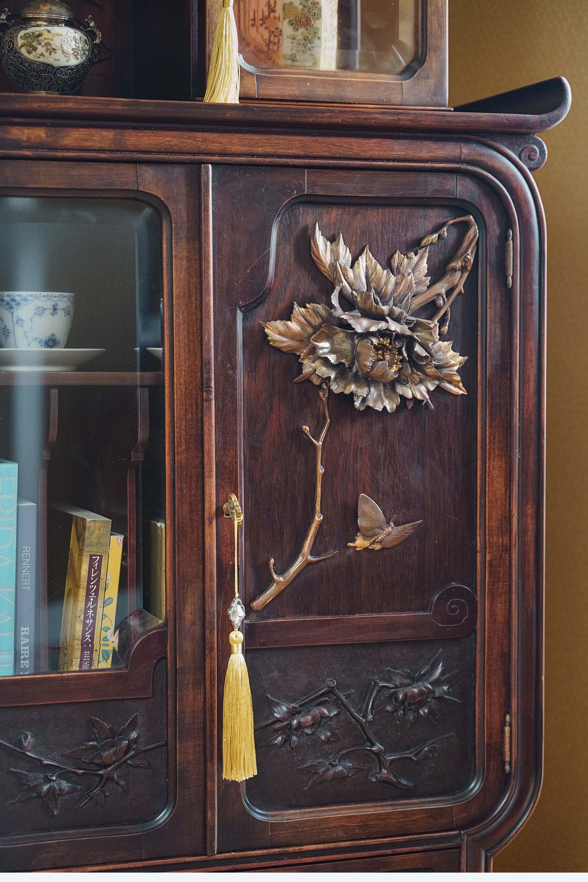 1880年代法国出品VIARDOT东方风格牡丹花卉纹铜雕装饰瑞兽主题胡桃木精雕多宝阁式展柜