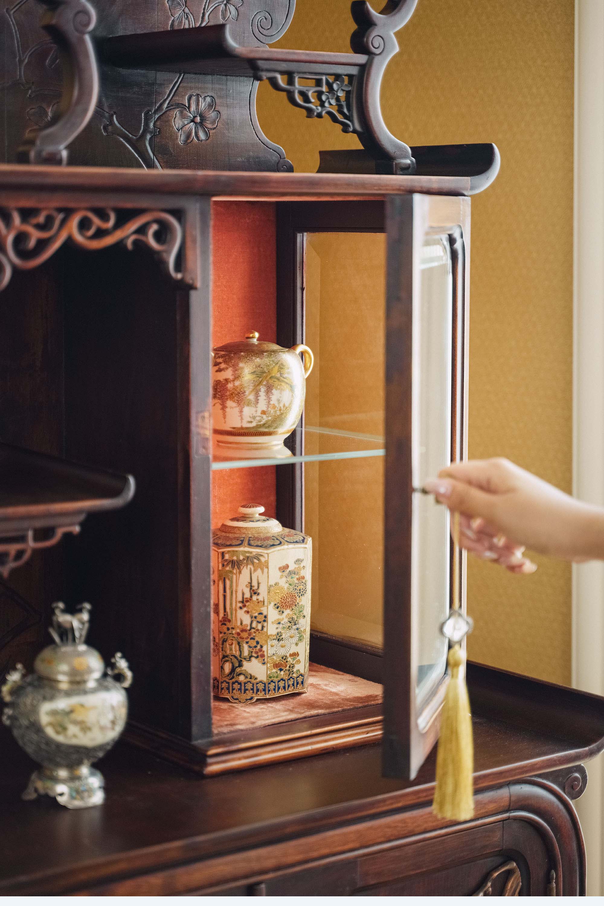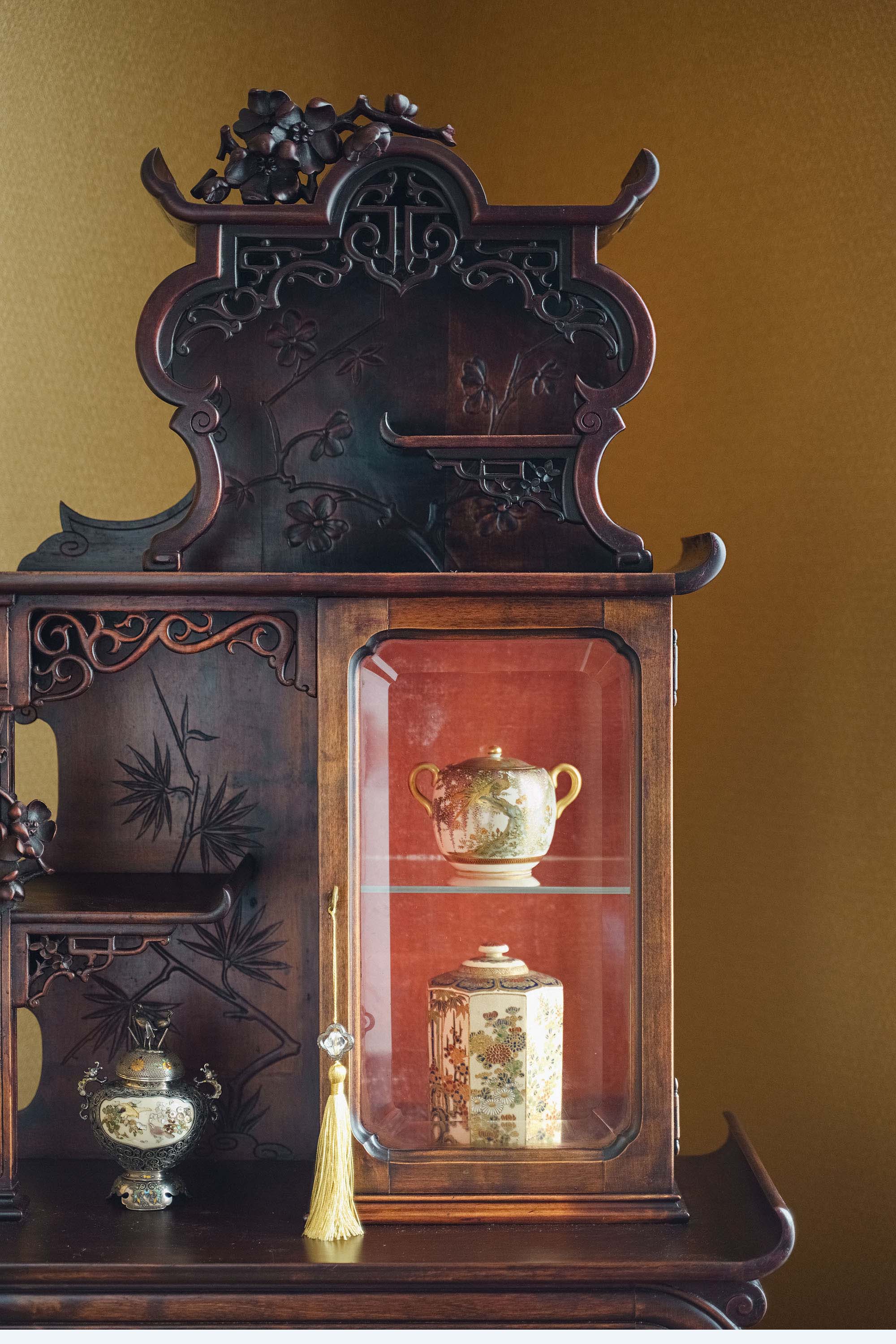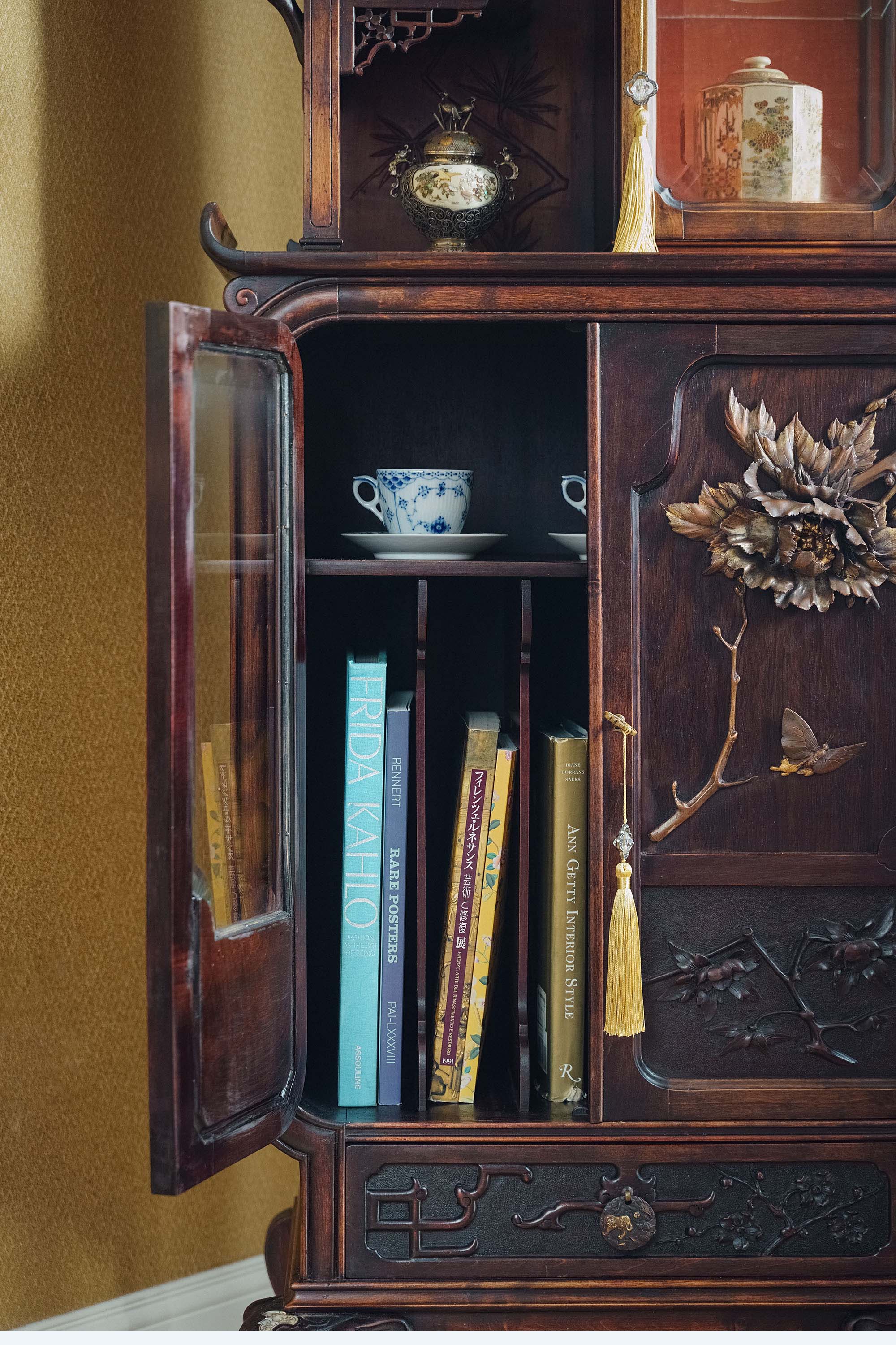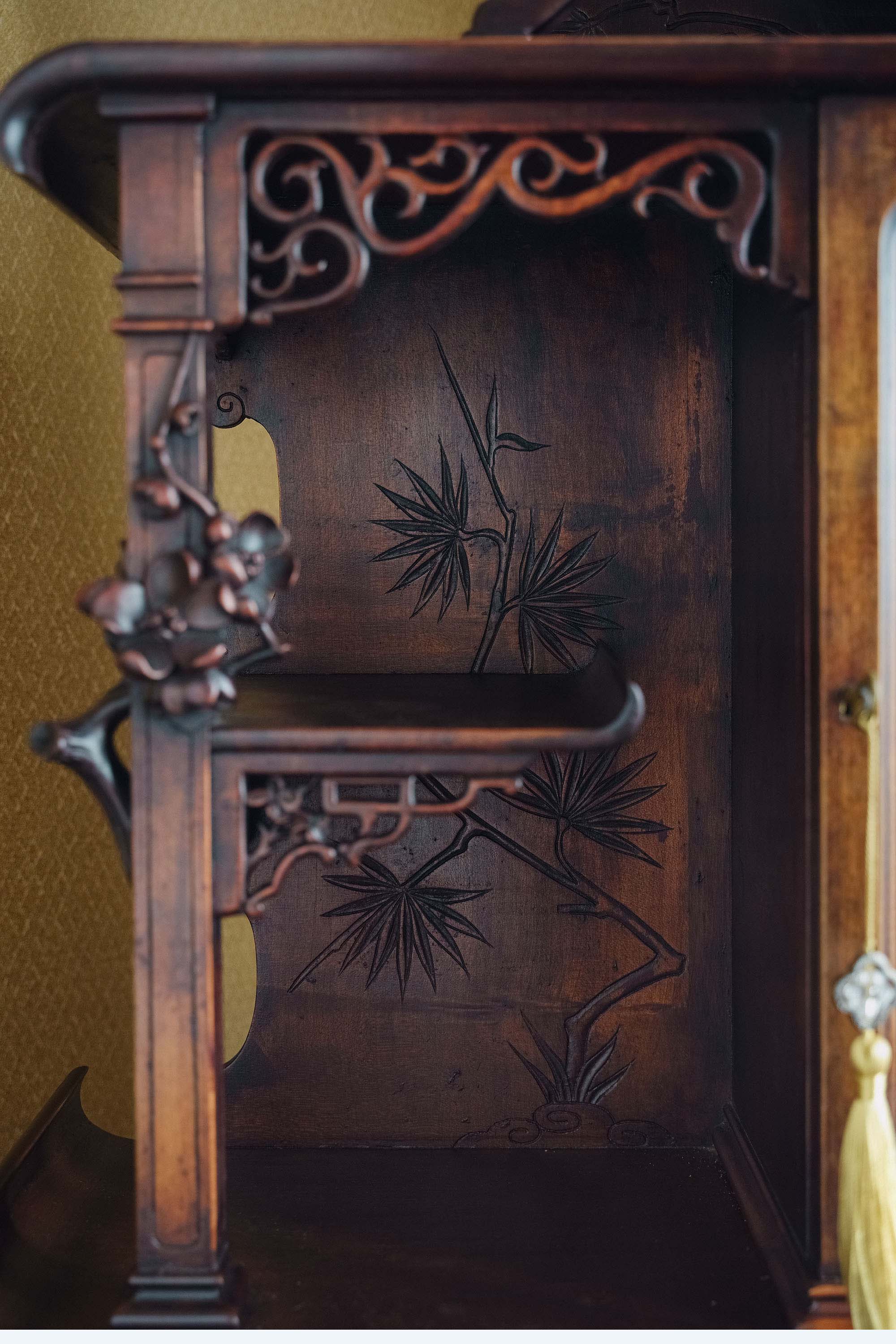 1880年代法国出品VIARDOT东方风格牡丹花卉纹铜雕装饰瑞兽主题胡桃木精雕多宝阁式展柜