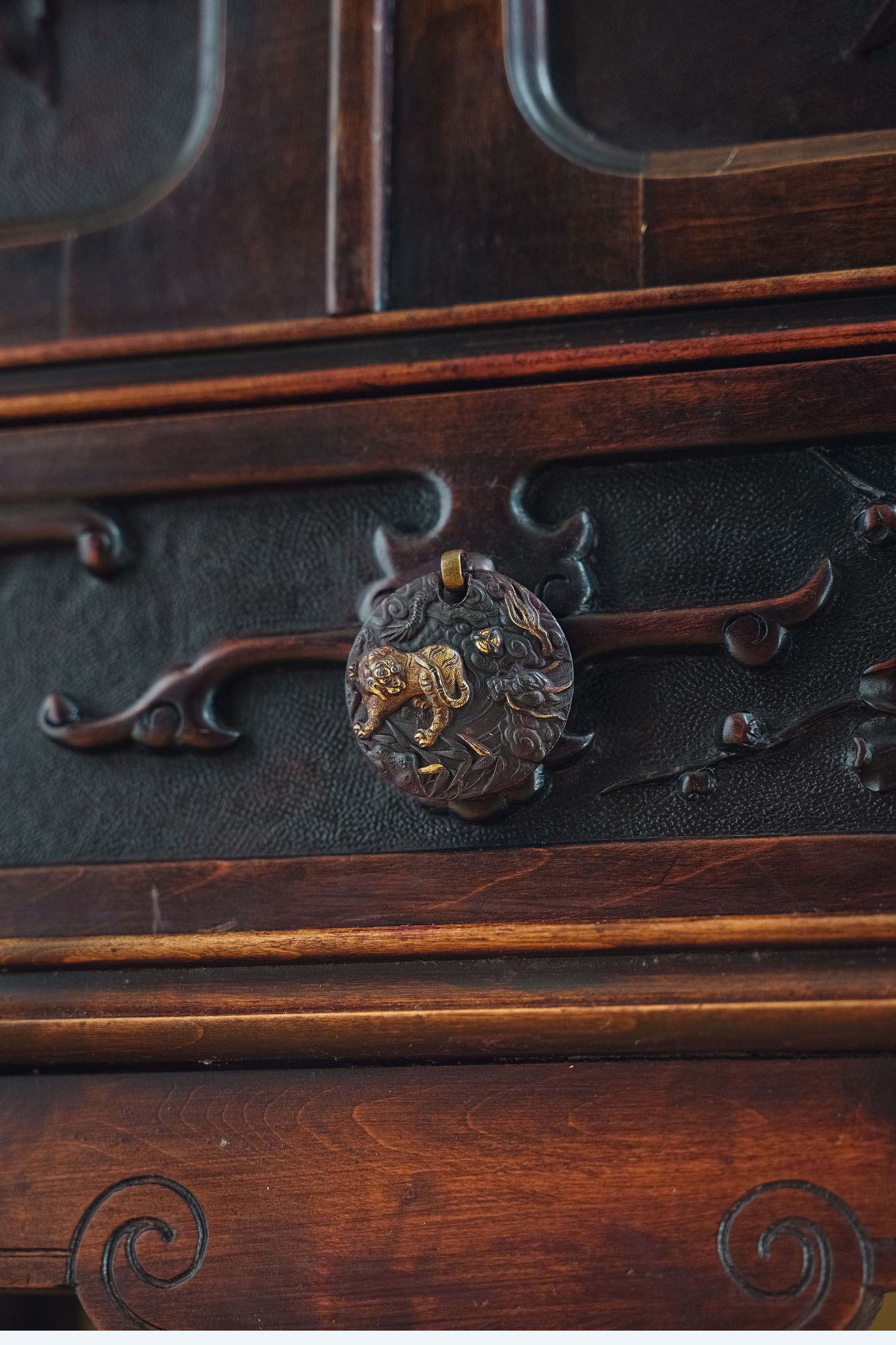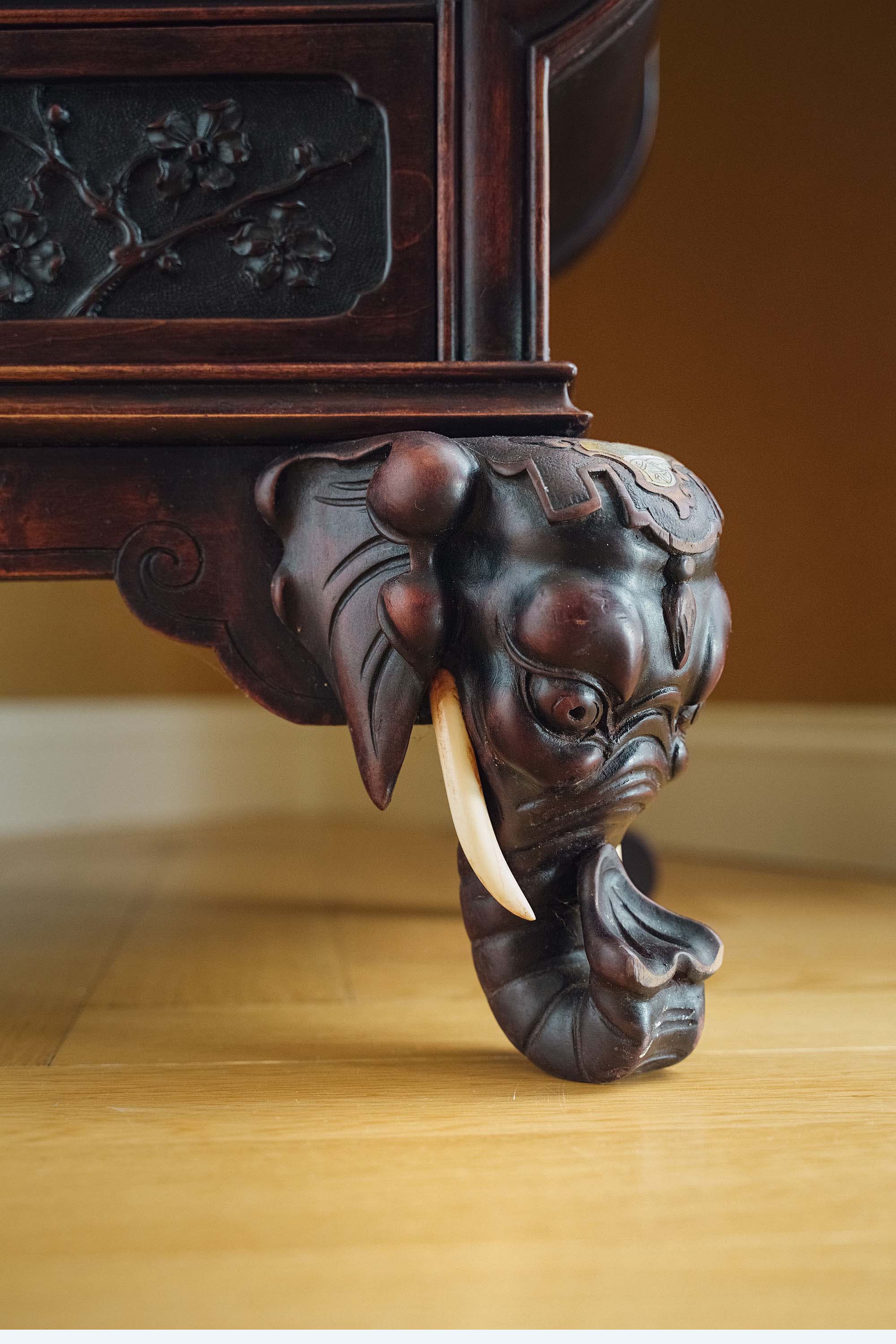 独角鹿西洋古董1880年代法国出品VIARDOT东方风格牡丹花卉纹铜雕装饰瑞兽主题胡桃木精雕多宝阁式展柜