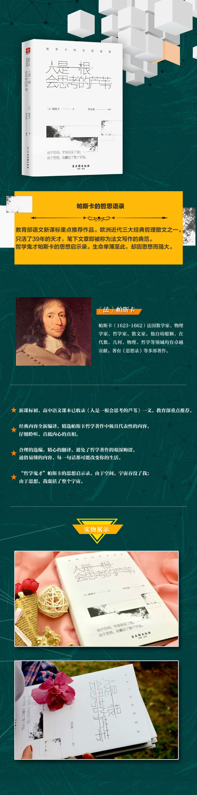 本书是法国著名哲学家帕斯卡的经典作品选编。全书由思考入题,讲述道德、信仰、思维等人生主题。解答了许多哲学回答不了的问题:我是谁?我从哪里来?我到哪里去?帕斯卡洞悉了宇宙的真相,窥见了人类的奥秘。在他看来,人就像芦苇一样脆弱,但因有思想而伟大。翻开本书,直抵人生的秘密。
