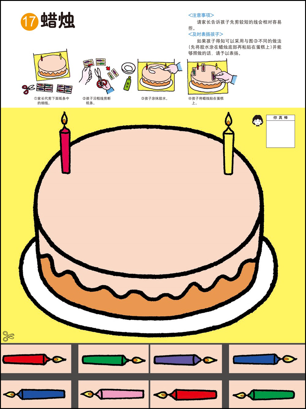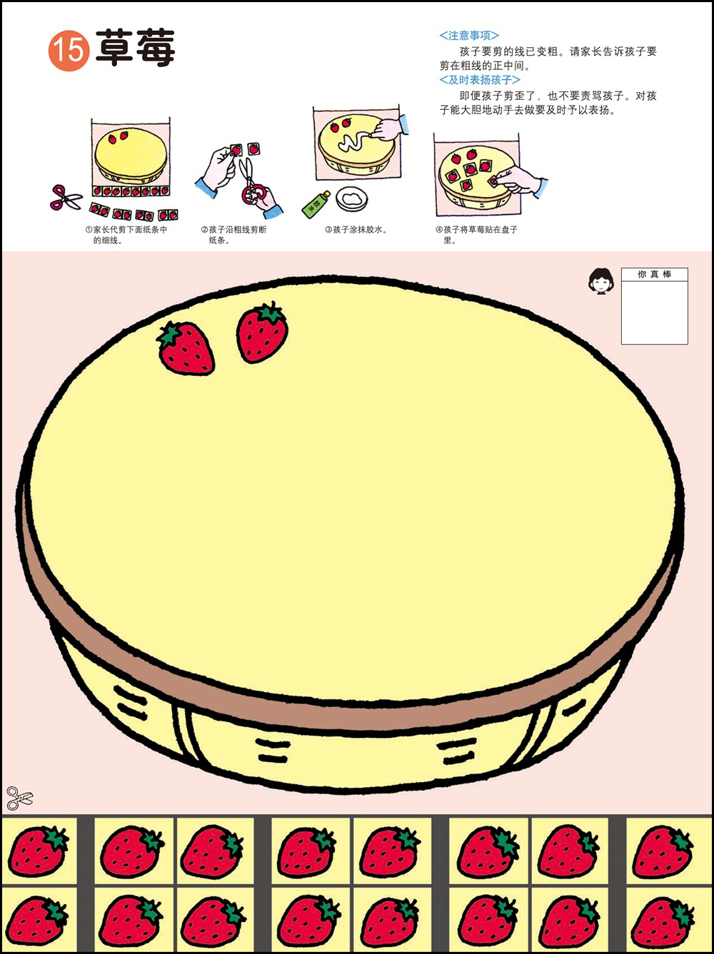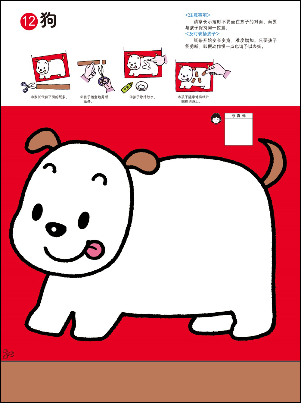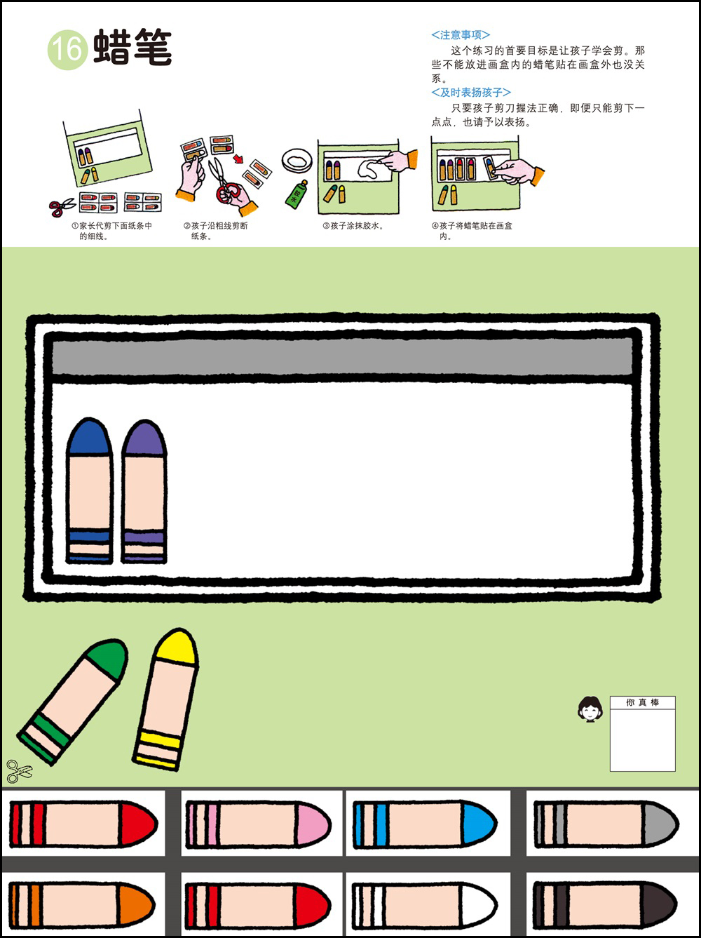 1.剪纸和粘贴需要以手指的细巧作业作为前提,可以培养双手的灵巧性,同时也能培养创造能力。2.用剪刀剪纸最基本的要求是熟练地使用剪刀。为此可以练习用剪刀从一头开始一点一点剪断纸带。剪刀的刀口与纸要垂直,不要斜着剪刀剪。3.2岁的幼儿在剪纸的时候是不可能完全贴合规定的剪切线的。即便剪得弯弯曲曲,也要让孩子大量地剪。剪的时候剪刀的刀口要放在剪切线宽幅的正中间,眼睛从剪刀的正上方看着剪切线。4.胶水用手指抹匀后粘合。请使用书末的练习纸板或报纸作为作业板,哪怕胶水粘在外面也没关系。有些书页可以用贴纸代替胶水,更增一份乐趣。
