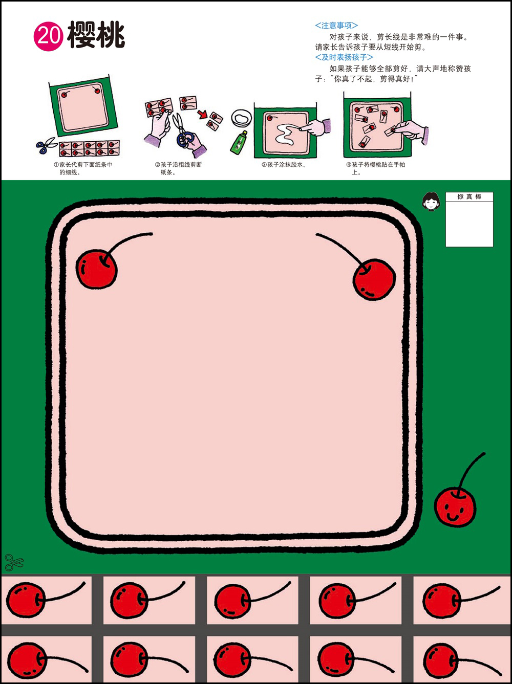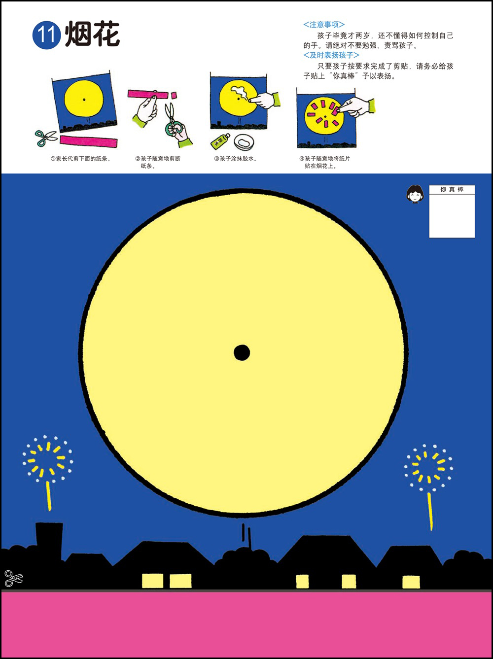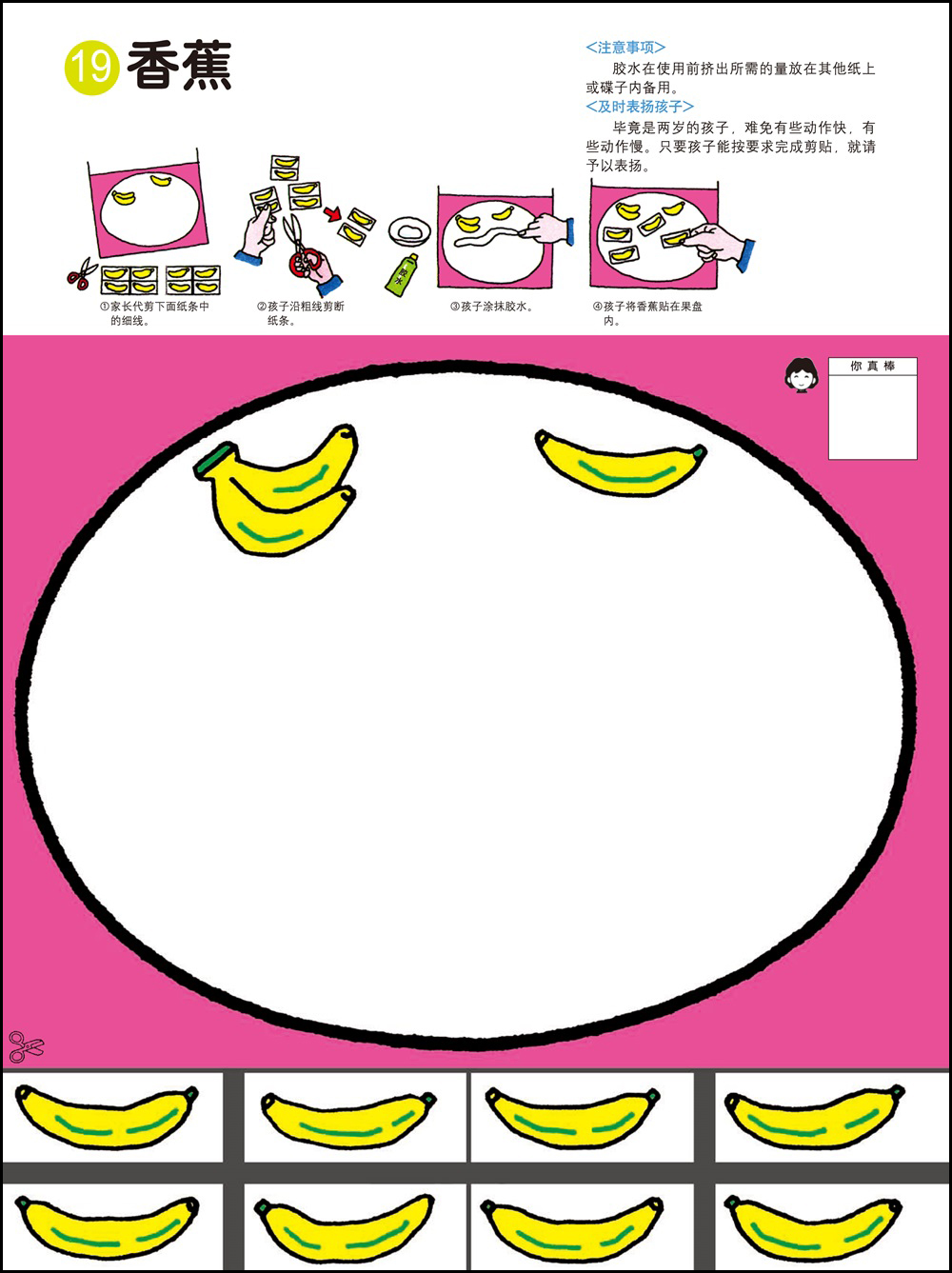 1.剪纸和粘贴需要以手指的细巧作业作为前提,可以培养双手的灵巧性,同时也能培养创造能力。2.用剪刀剪纸最基本的要求是熟练地使用剪刀。为此可以练习用剪刀从一头开始一点一点剪断纸带。剪刀的刀口与纸要垂直,不要斜着剪刀剪。3.2岁的幼儿在剪纸的时候是不可能完全贴合规定的剪切线的。即便剪得弯弯曲曲,也要让孩子大量地剪。剪的时候剪刀的刀口要放在剪切线宽幅的正中间,眼睛从剪刀的正上方看着剪切线。4.胶水用手指抹匀后粘合。请使用书末的练习纸板或报纸作为作业板,哪怕胶水粘在外面也没关系。有些书页可以用贴纸代替胶水,更增一份乐趣。