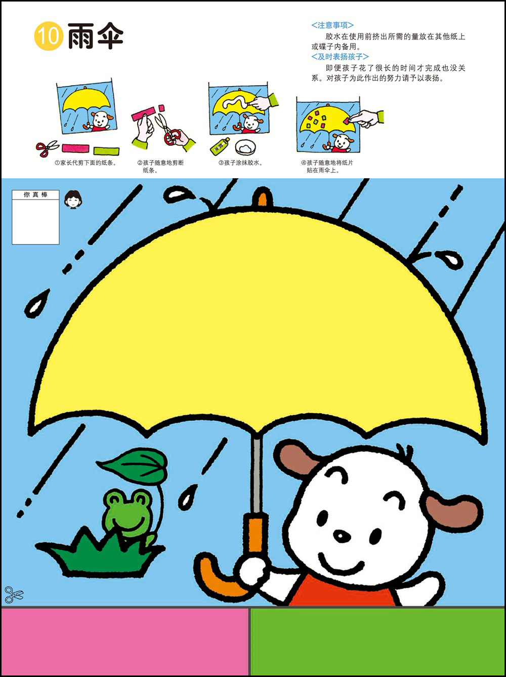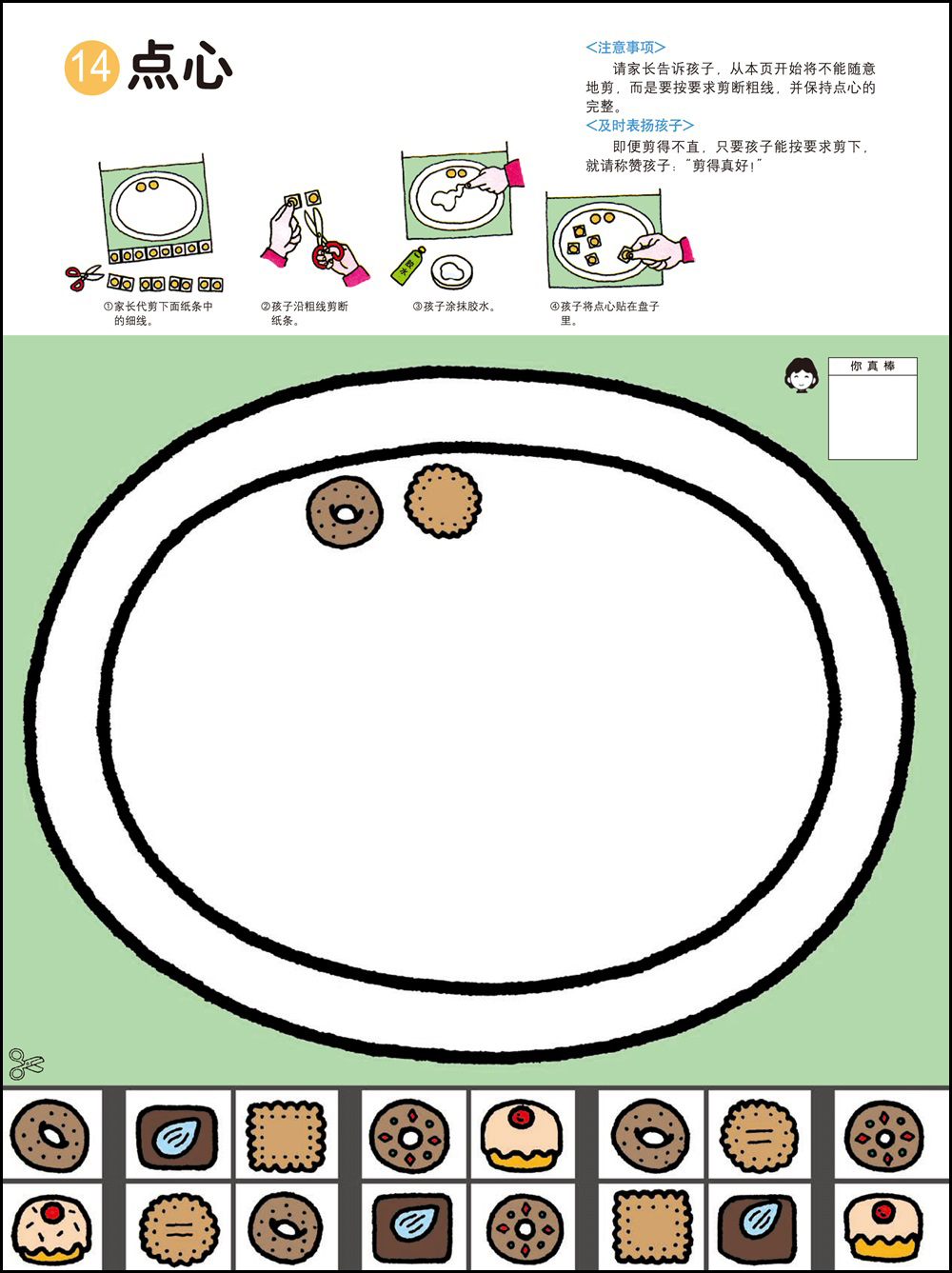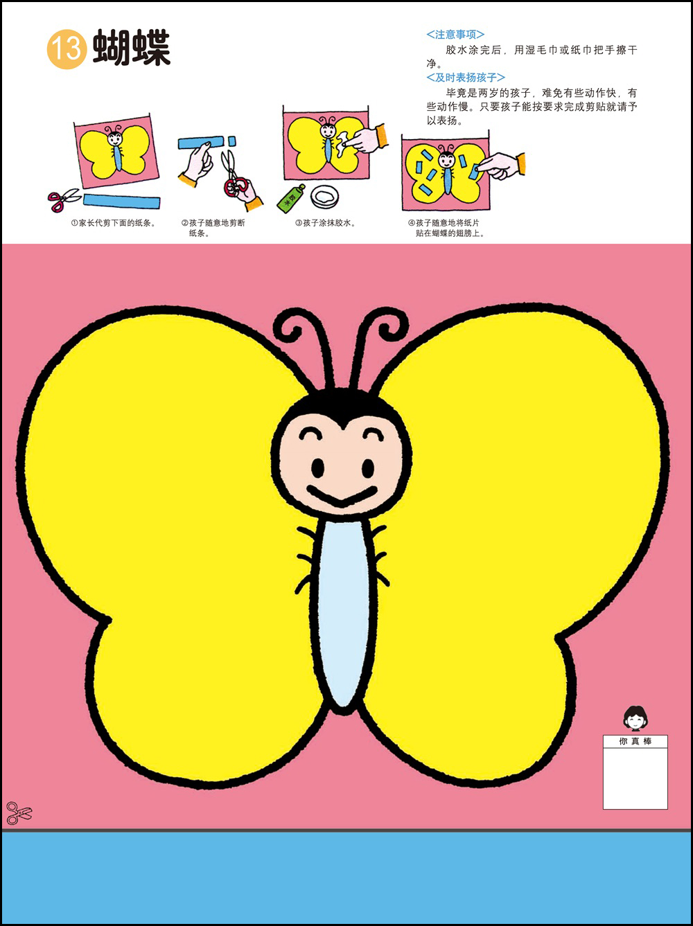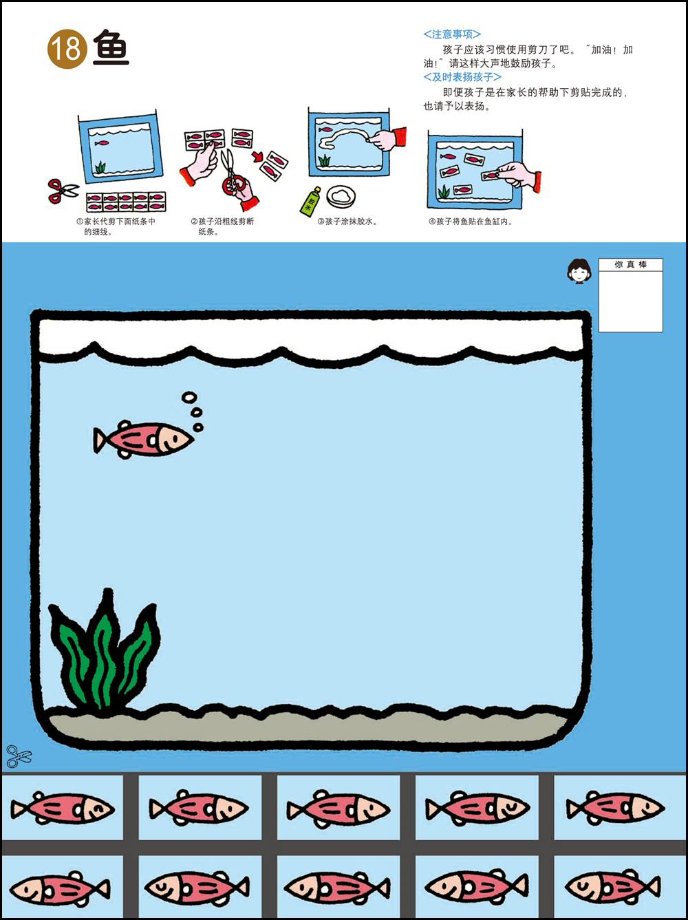 1.剪纸和粘贴需要以手指的细巧作业作为前提,可以培养双手的灵巧性,同时也能培养创造能力。2.用剪刀剪纸最基本的要求是熟练地使用剪刀。为此可以练习用剪刀从一头开始一点一点剪断纸带。剪刀的刀口与纸要垂直,不要斜着剪刀剪。3.2岁的幼儿在剪纸的时候是不可能完全贴合规定的剪切线的。即便剪得弯弯曲曲,也要让孩子大量地剪。剪的时候剪刀的刀口要放在剪切线宽幅的正中间,眼睛从剪刀的正上方看着剪切线。4.胶水用手指抹匀后粘合。请使用书末的练习纸板或报纸作为作业板,哪怕胶水粘在外面也没关系。有些书页可以用贴纸代替胶水,更增一份乐趣。